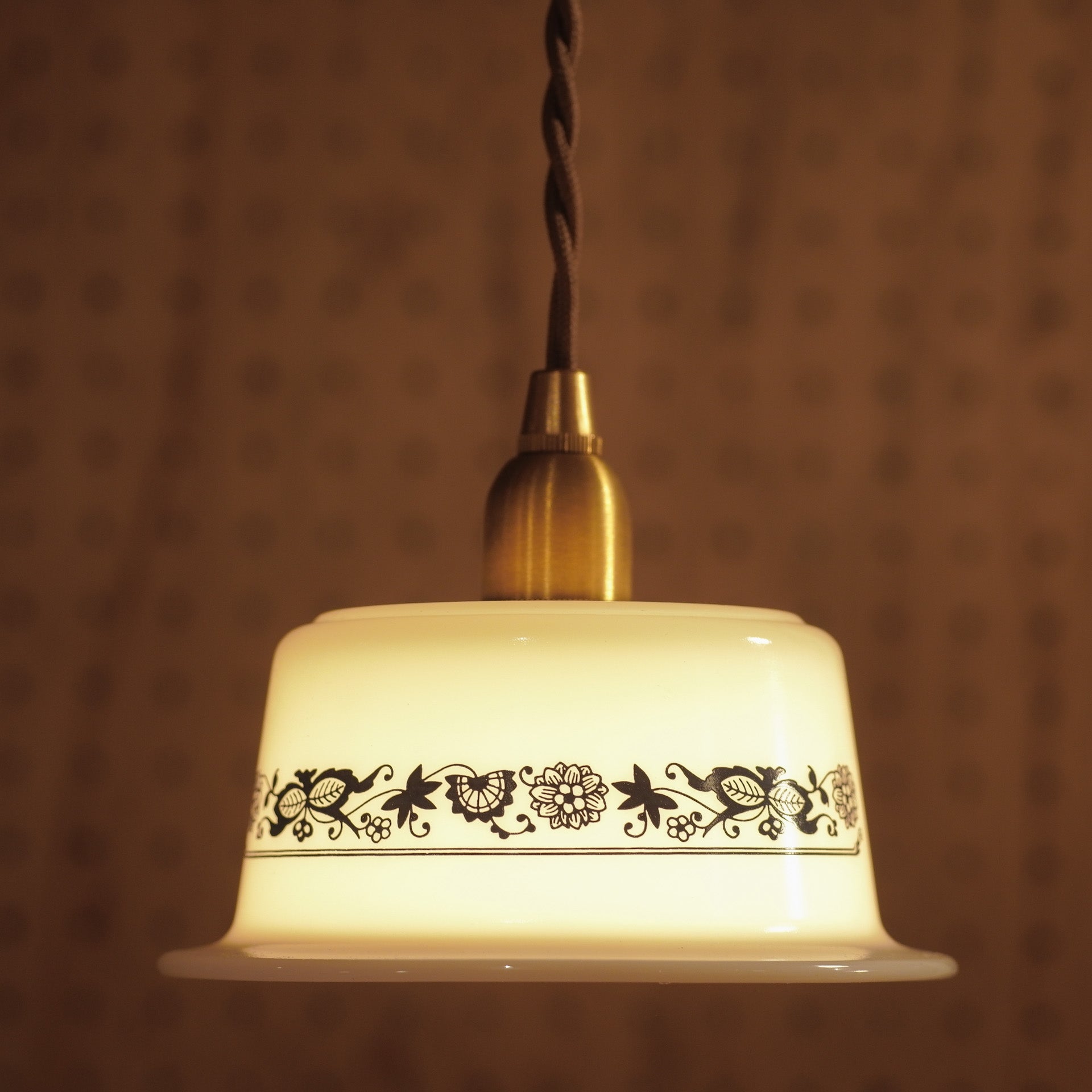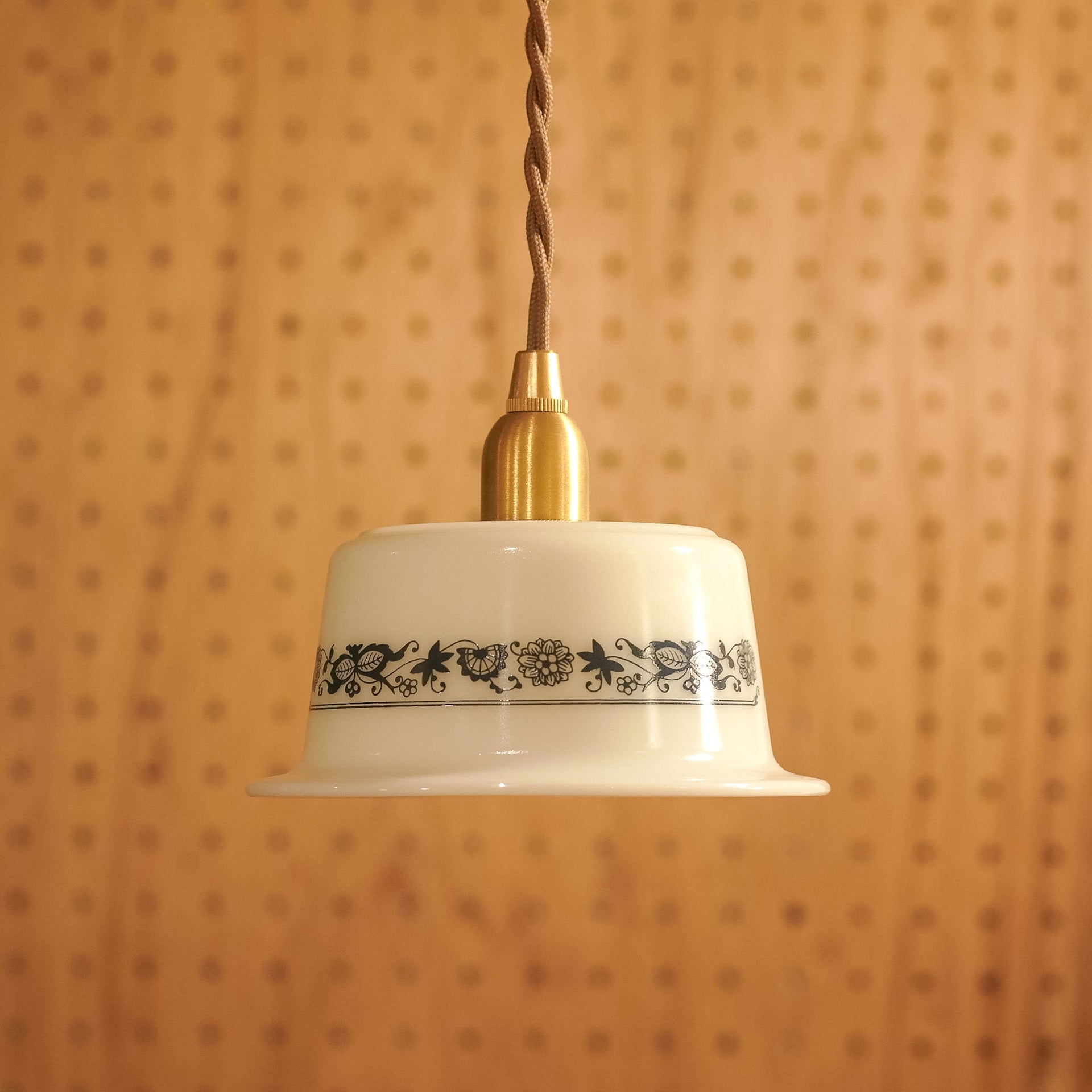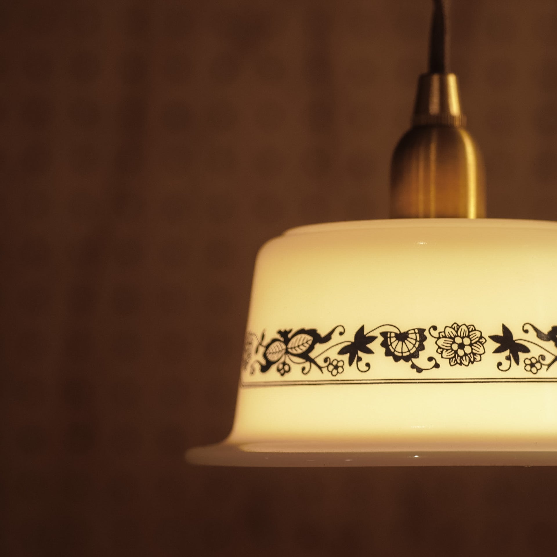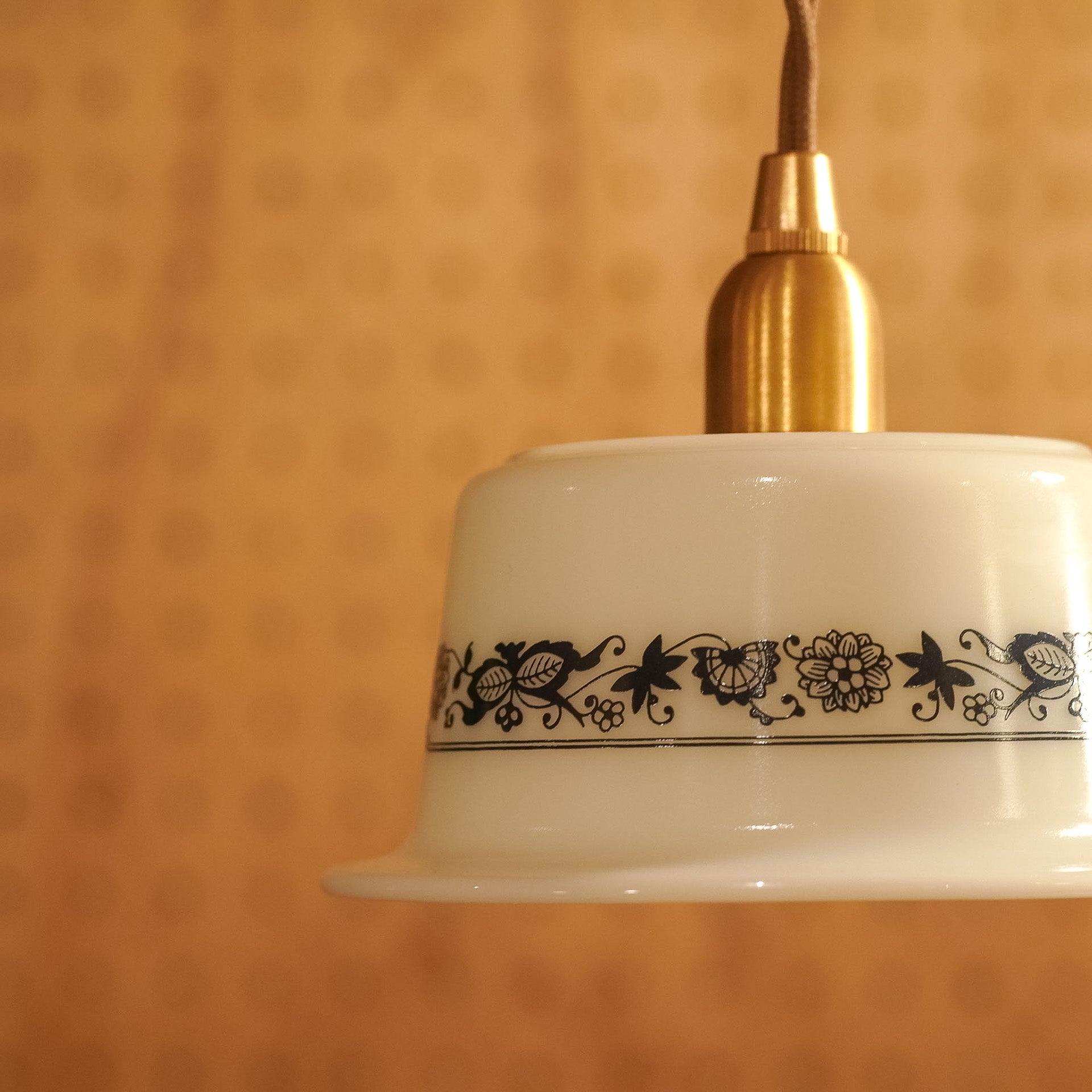 アメリカ・コーニング社のパイレックスより、オールドタウンブルー柄のバタージャーをリメイクしたペンダントライト。点灯すると、ミルクガラス全体が柔らかな光を放ち、周囲を優しく照らします。消灯時も、ミッドセンチュリーらしい素朴で愛らしい花柄が、空間のアクセントとなります。