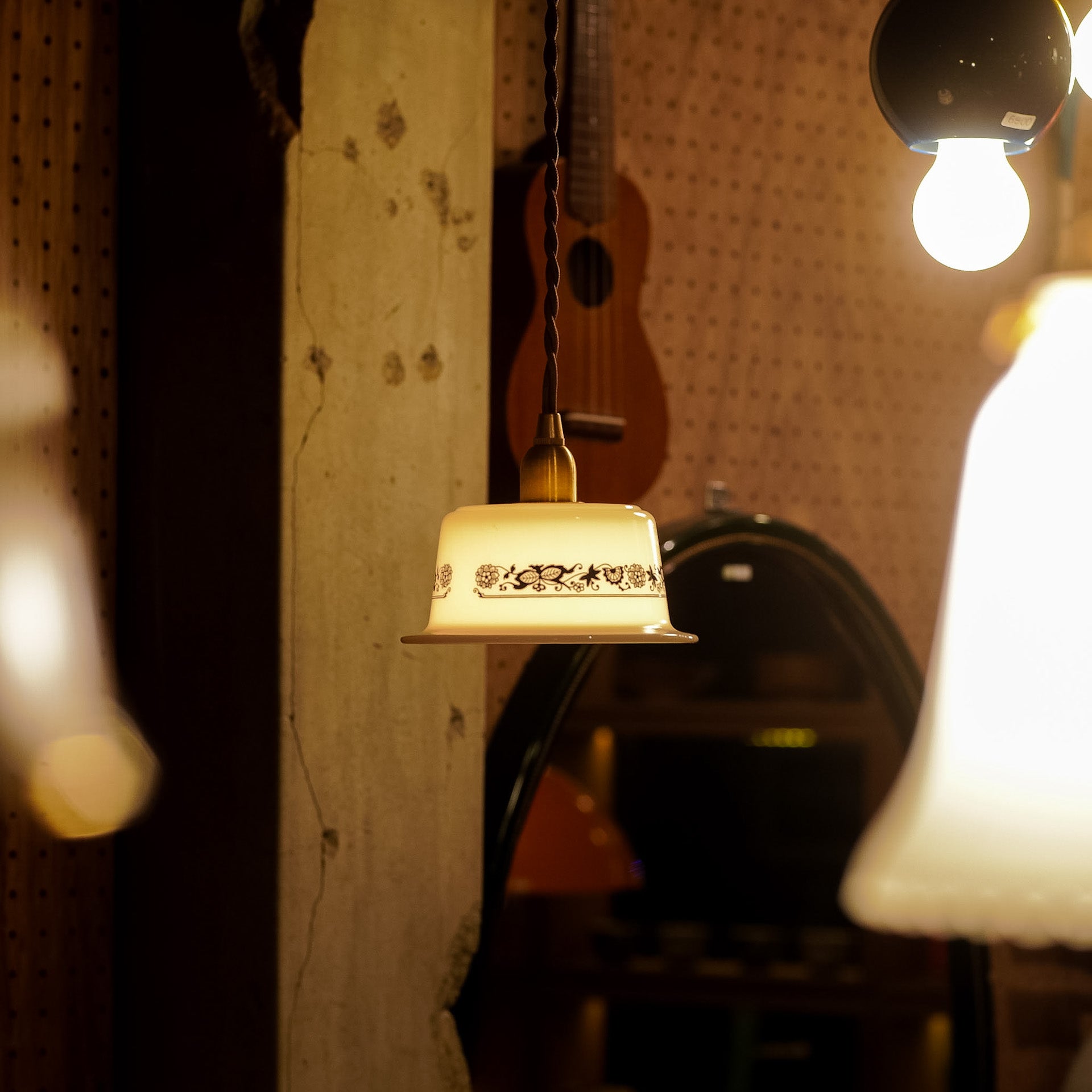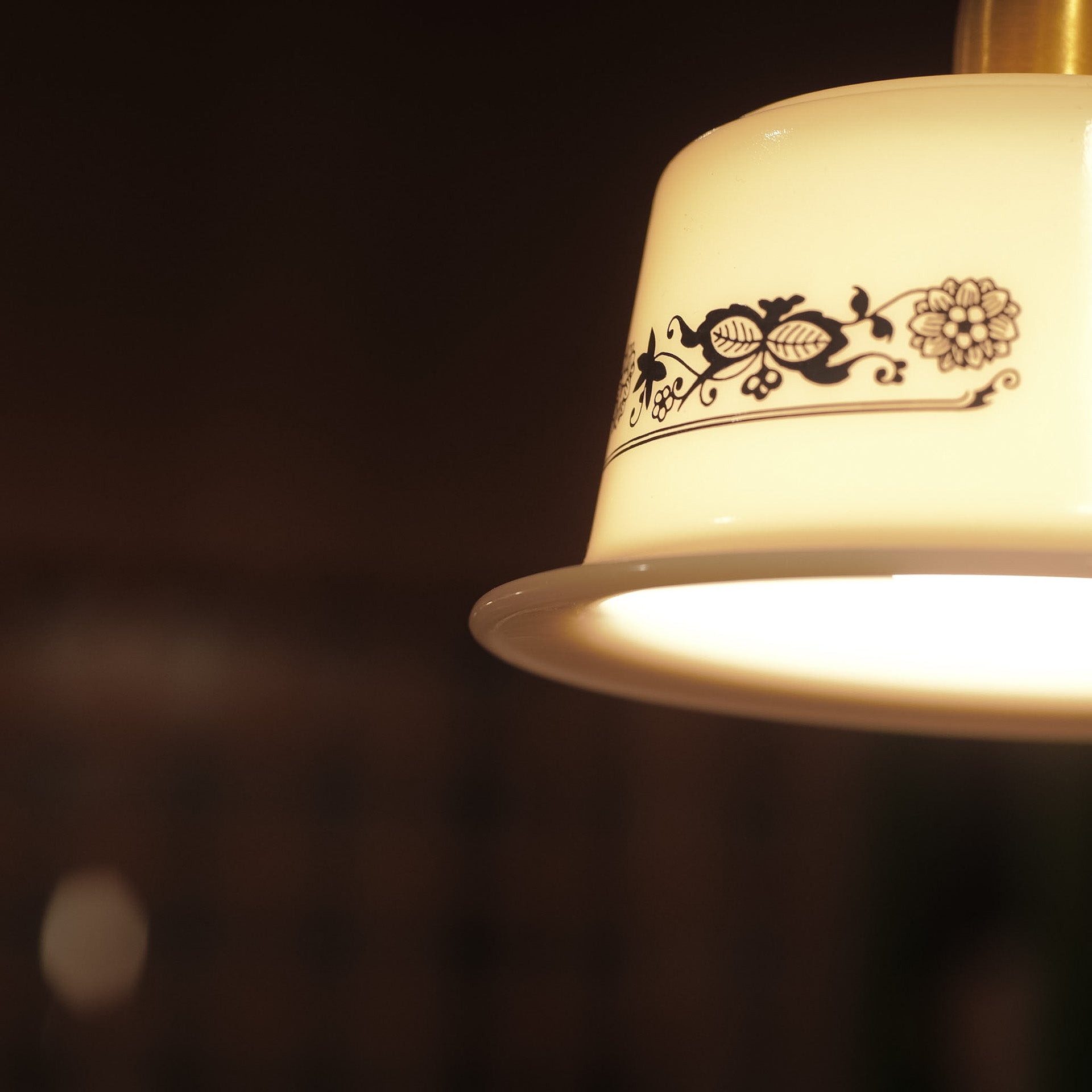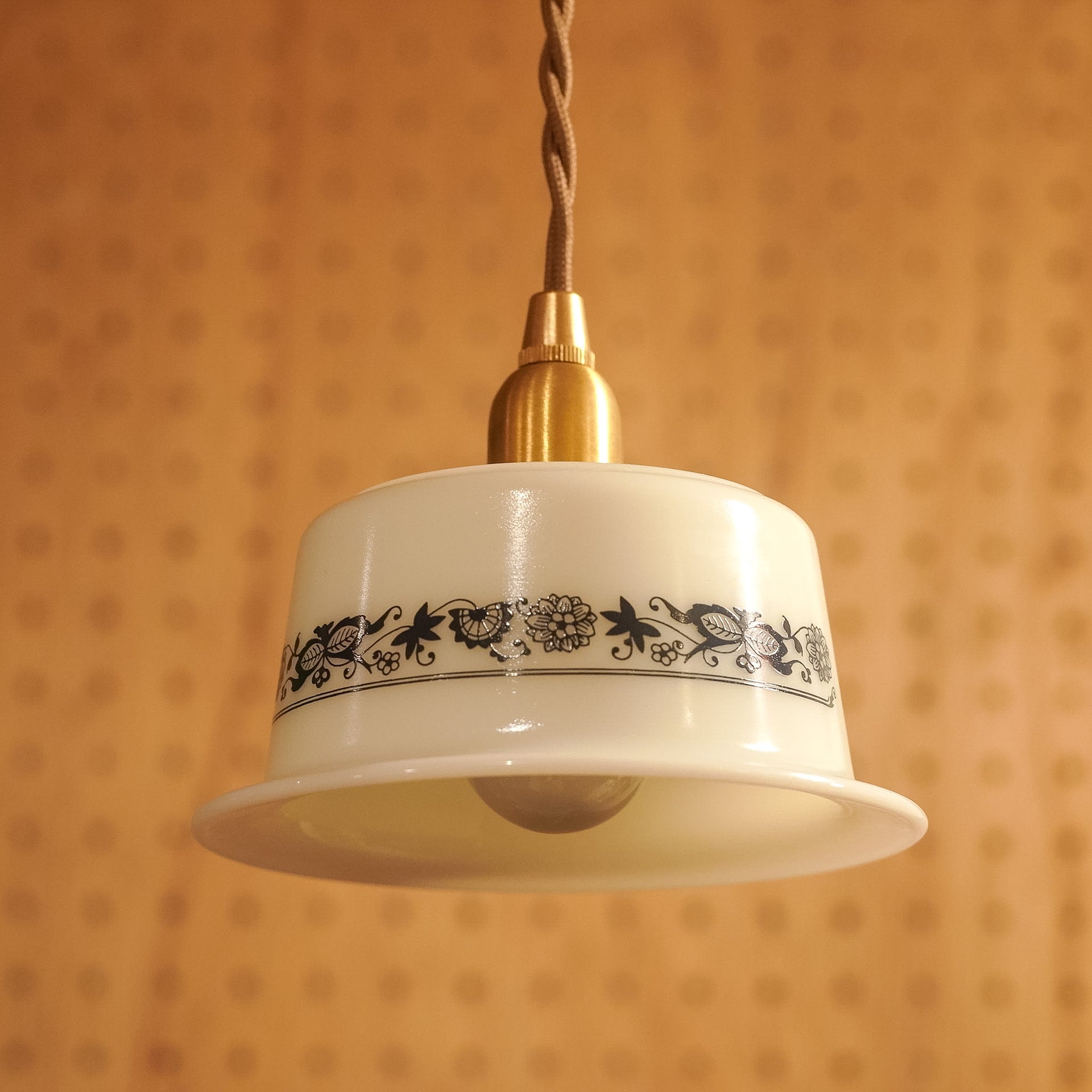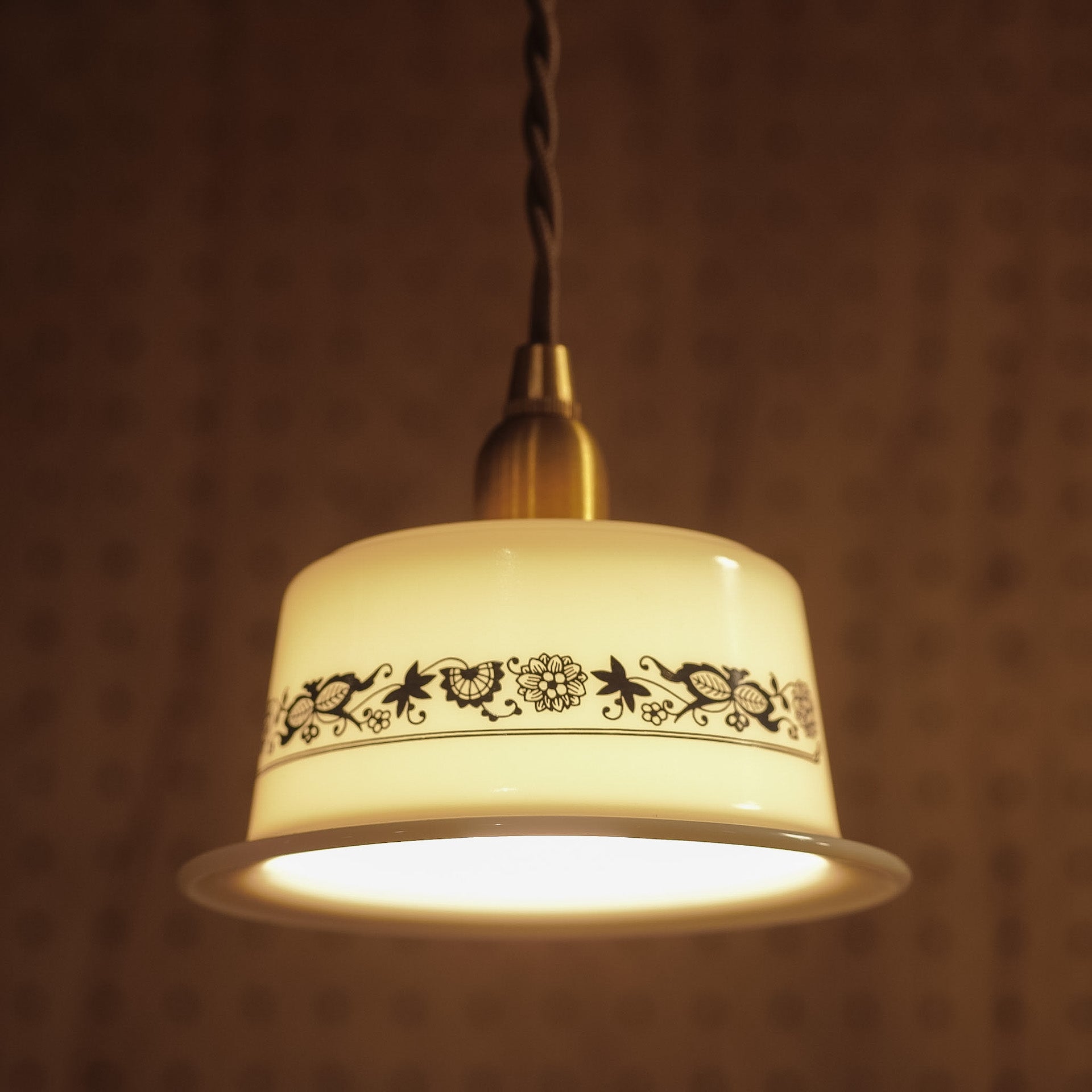 アメリカ・コーニング社のパイレックスより、オールドタウンブルー柄のバタージャーをリメイクしたペンダントライト。点灯すると、ミルクガラス全体が柔らかな光を放ち、周囲を優しく照らします。消灯時も、ミッドセンチュリーらしい素朴で愛らしい花柄が、空間のアクセントとなります。