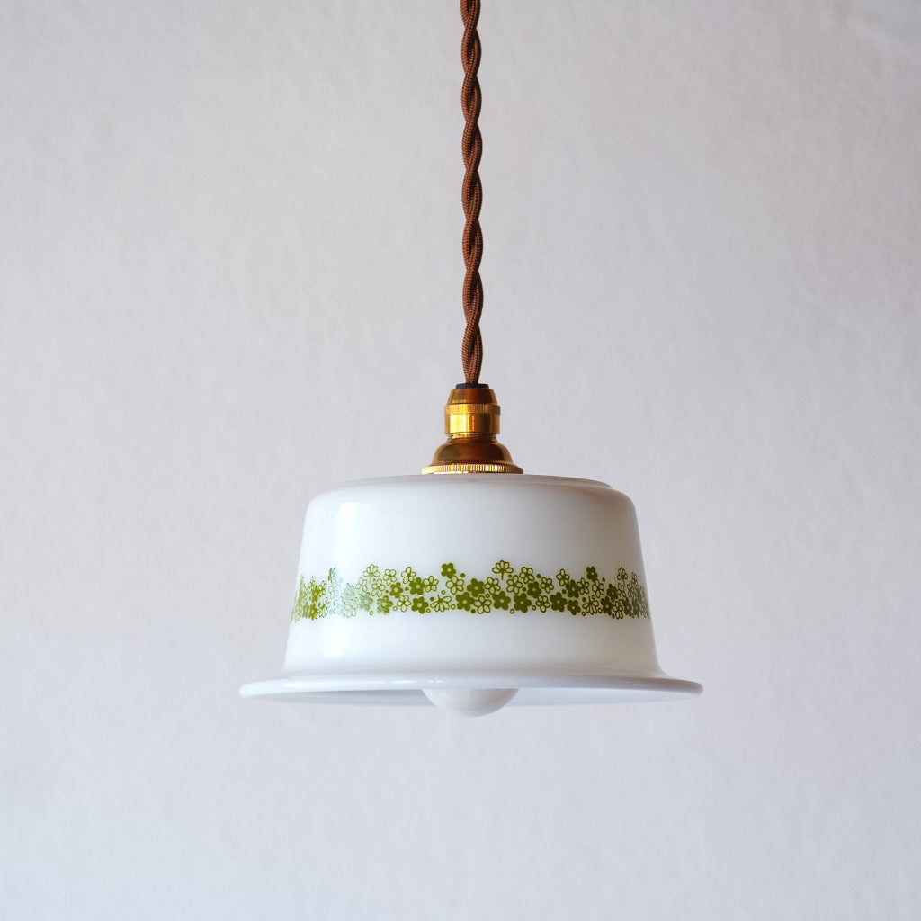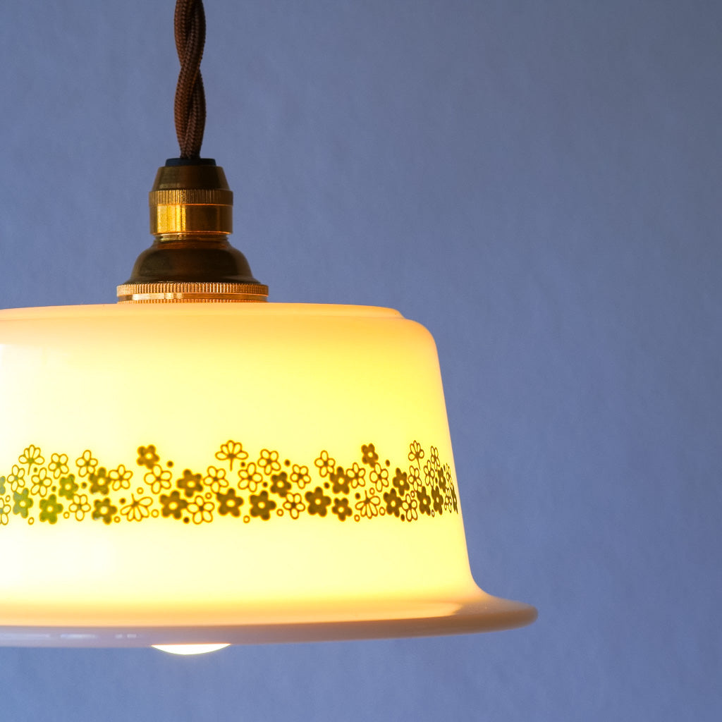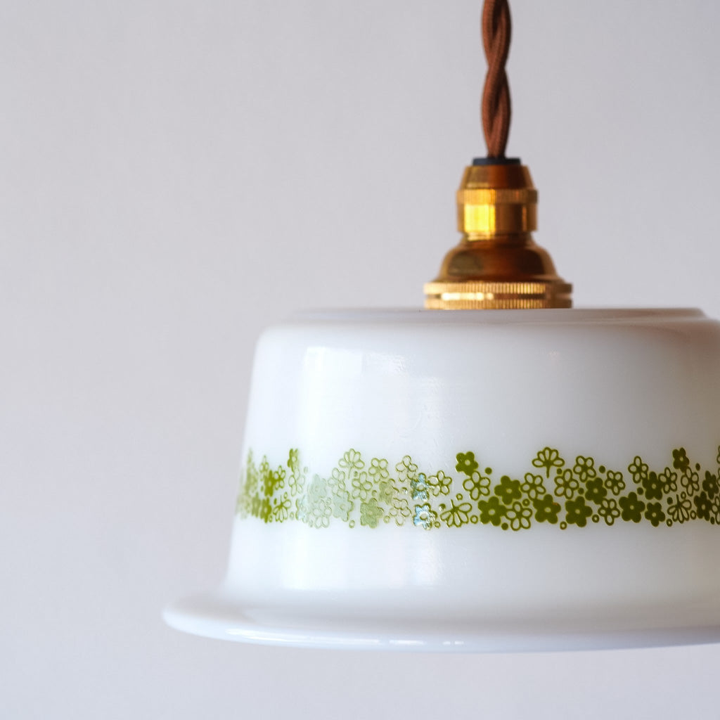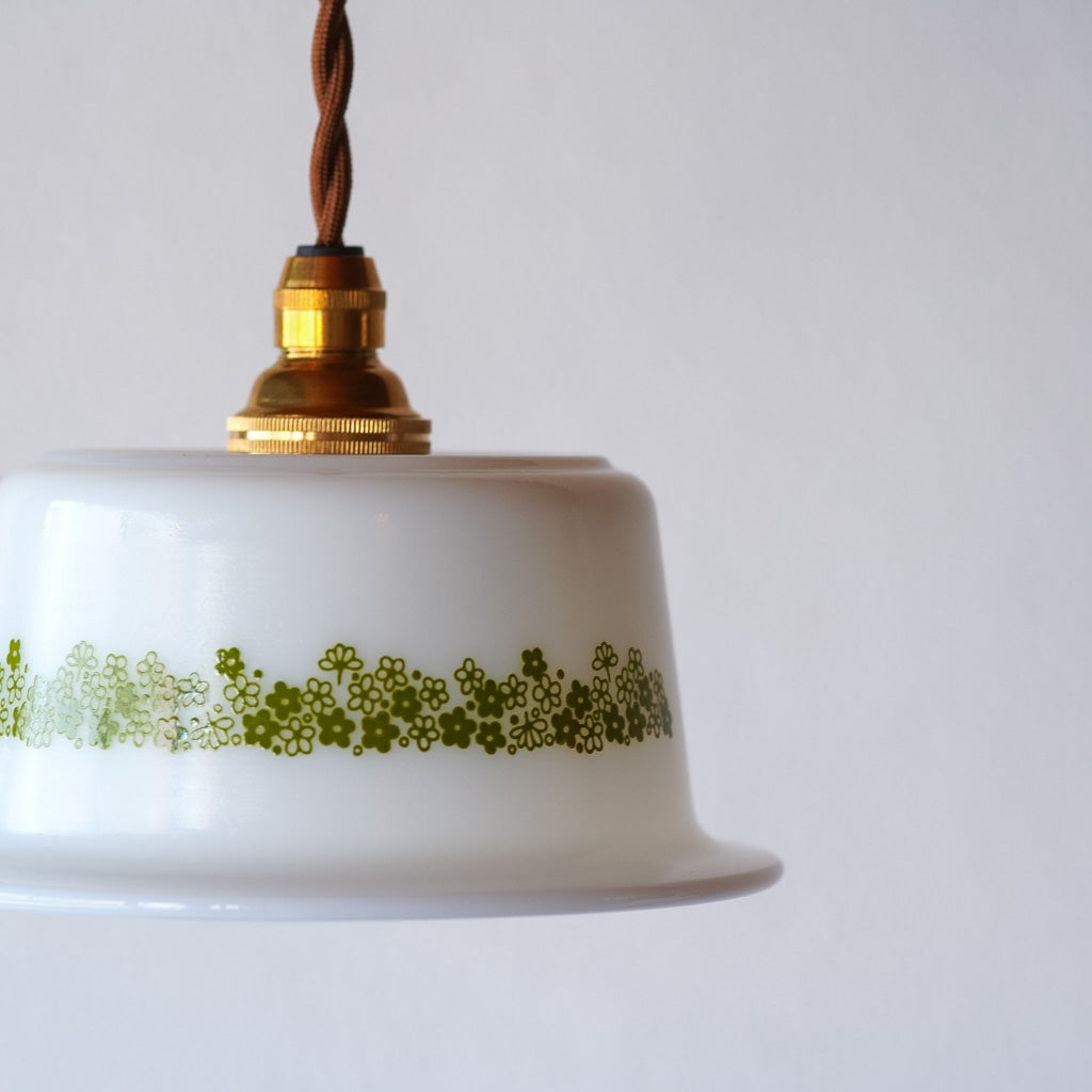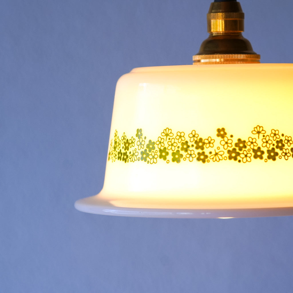 アメリカ・コーニング社のパイレックスより、クレイジーデイジー柄のバタージャーをリメイクしたペンダントライト。1960年代の雰囲気が漂う、愛らしくも大胆なデイジー(ひなぎく)柄が魅力。ミルクガラスの柔らかな白地と、鮮やかなグリーンのコントラストが、空間に明るくレトロポップな彩りを添えます。