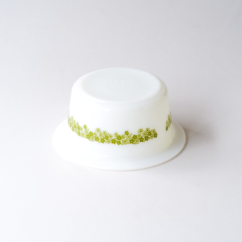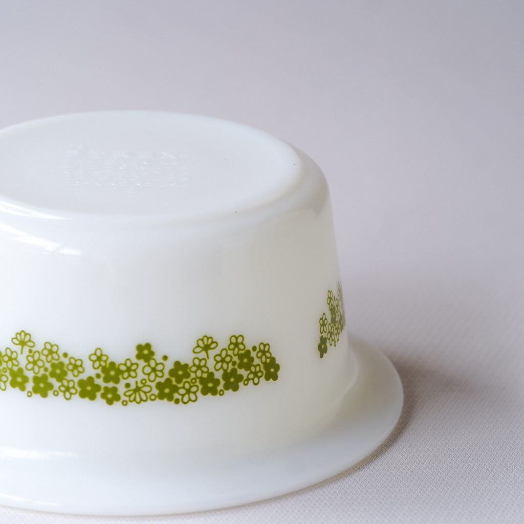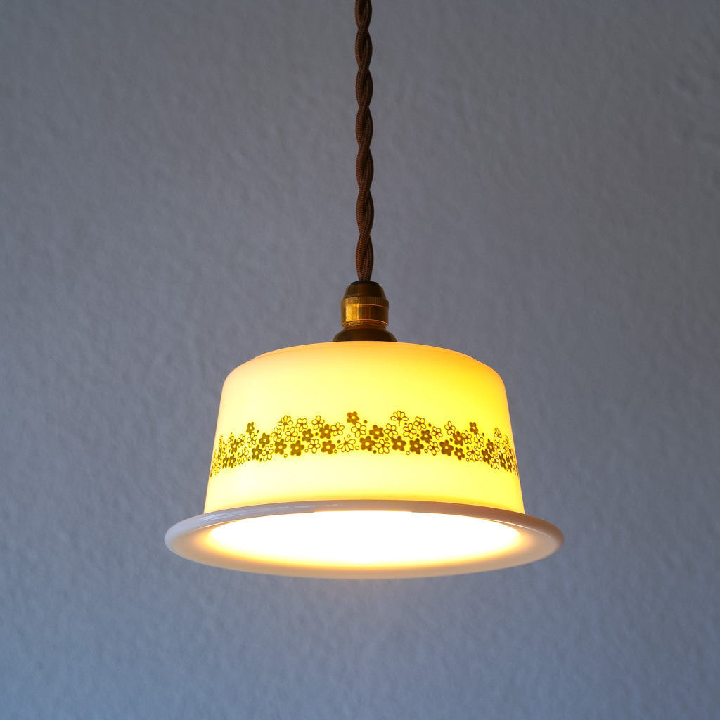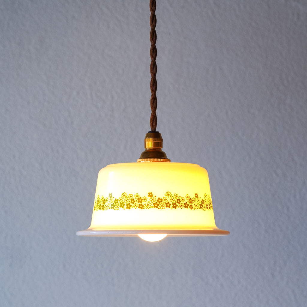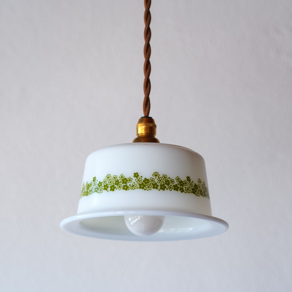 アメリカ・コーニング社のパイレックスより、クレイジーデイジー柄のバタージャーをリメイクしたペンダントライト。1960年代の雰囲気が漂う、愛らしくも大胆なデイジー(ひなぎく)柄が魅力。ミルクガラスの柔らかな白地と、鮮やかなグリーンのコントラストが、空間に明るくレトロポップな彩りを添えます。