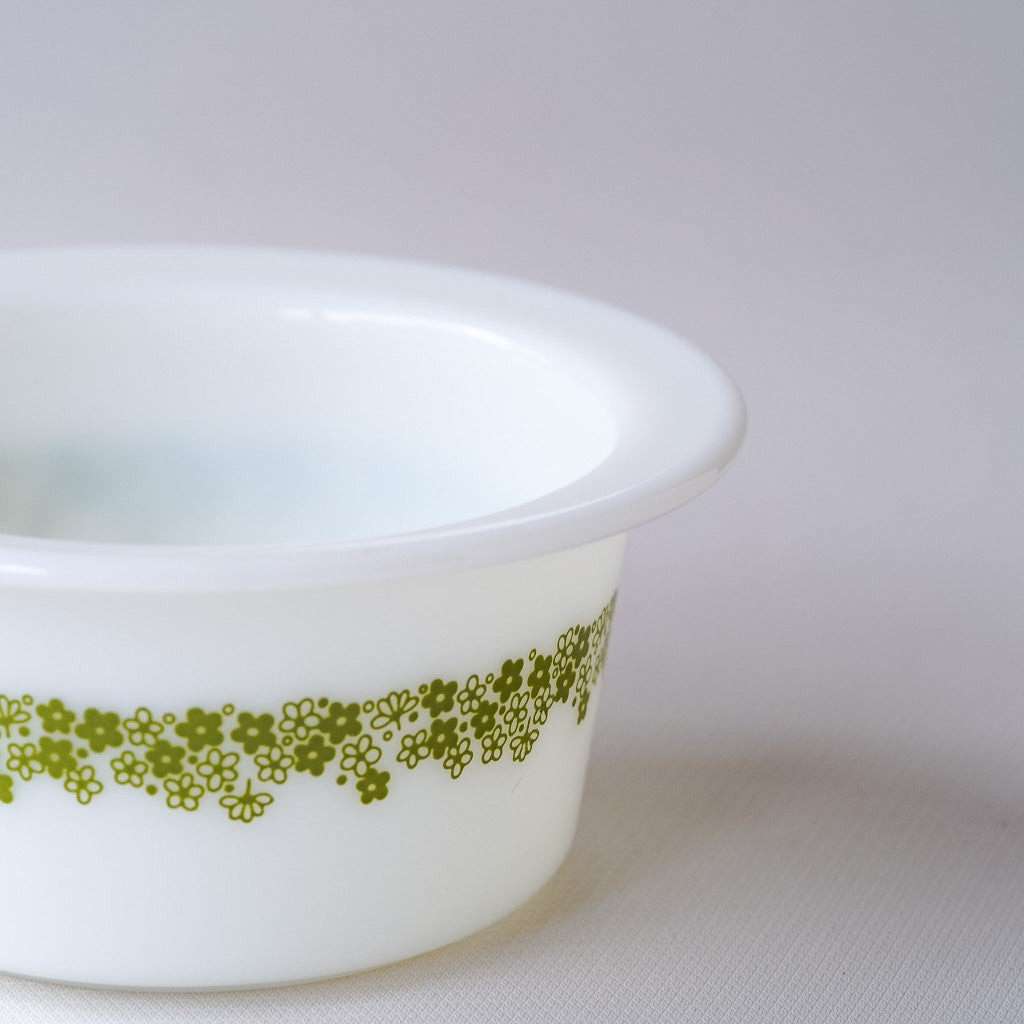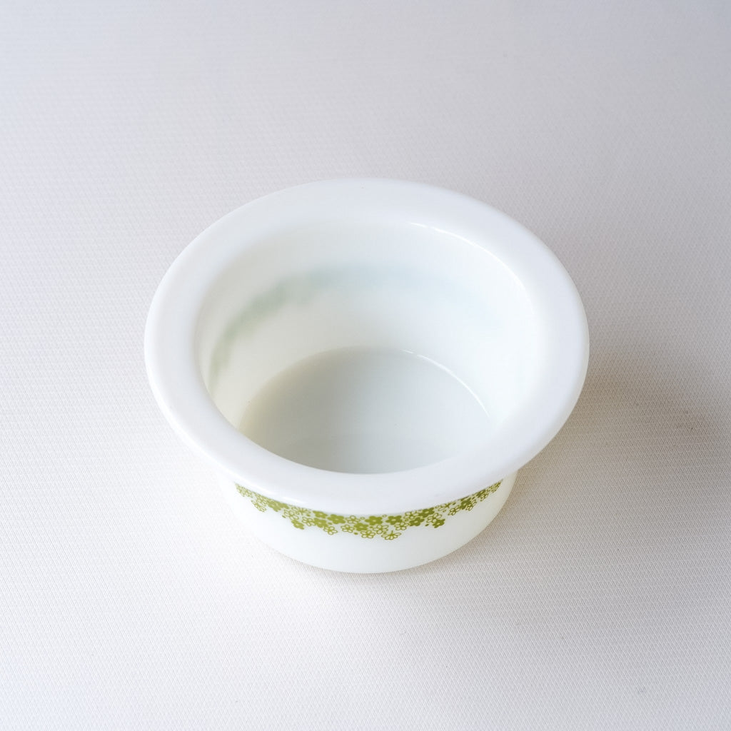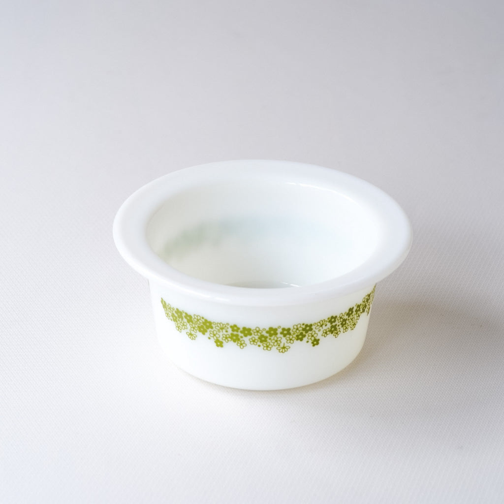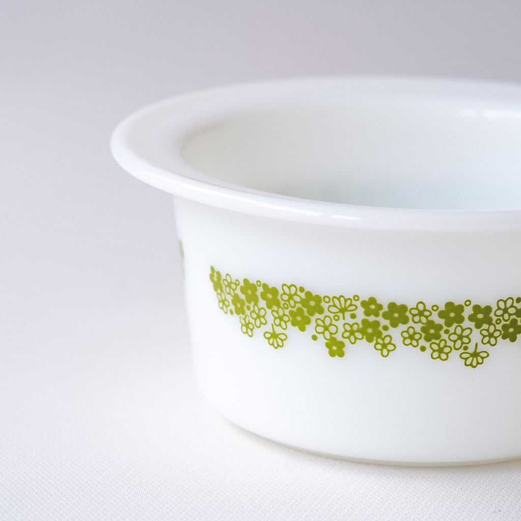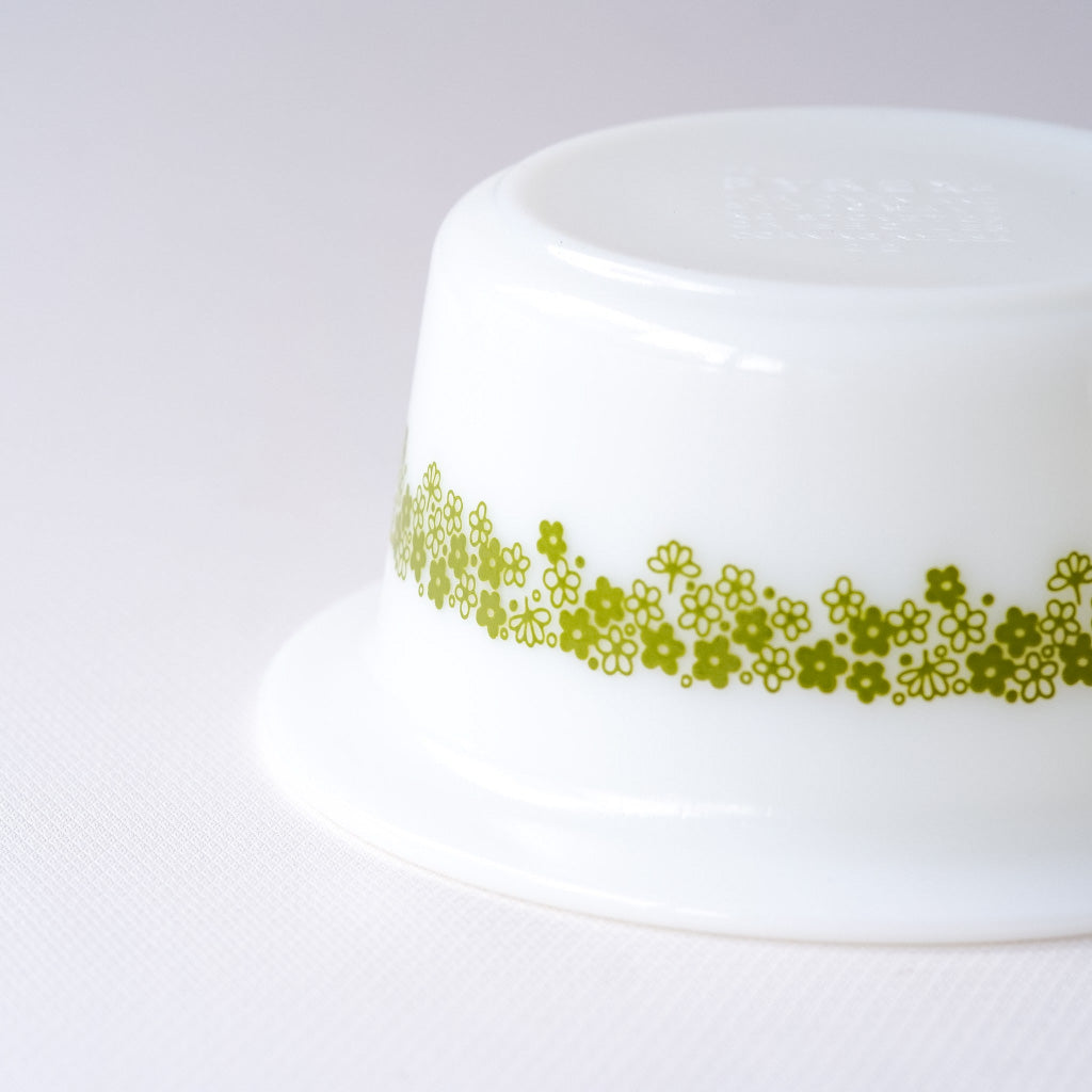 アメリカ・コーニング社のパイレックスより、クレイジーデイジー柄のバタージャーをリメイクしたペンダントライト。1960年代の雰囲気が漂う、愛らしくも大胆なデイジー(ひなぎく)柄が魅力。ミルクガラスの柔らかな白地と、鮮やかなグリーンのコントラストが、空間に明るくレトロポップな彩りを添えます。