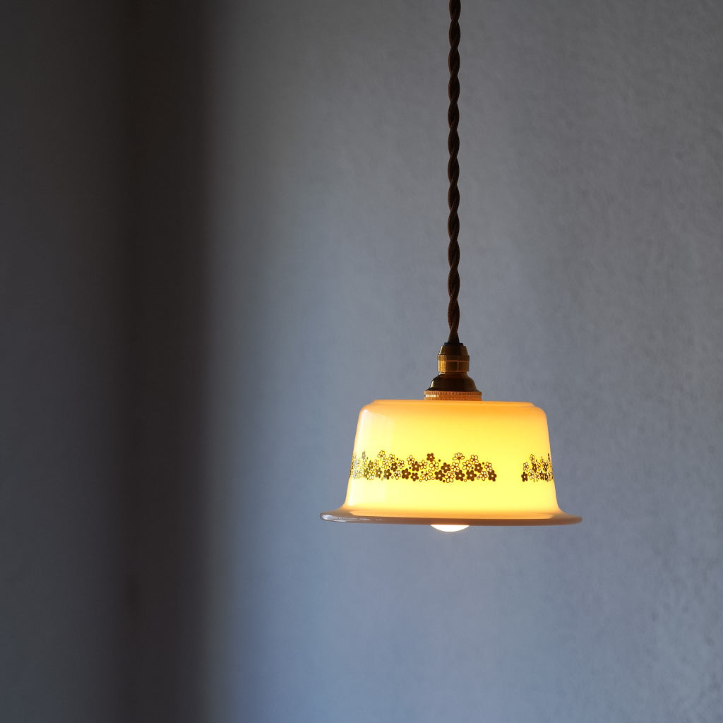 点灯時には、ミルクガラスを通して柄が優しく発光し、お部屋を包み込むような温かな光を届けます。どこか懐かしく、そして新しい、遊び心あふれる一灯です。
