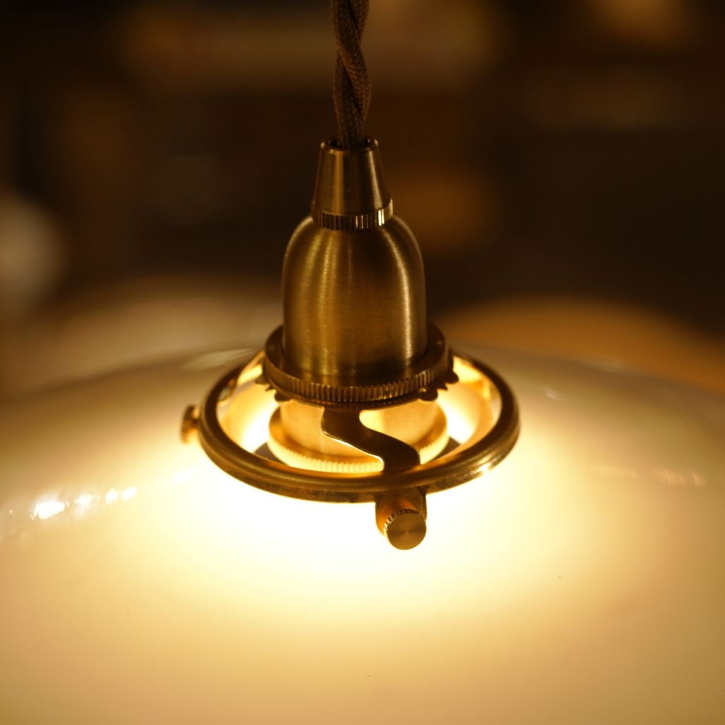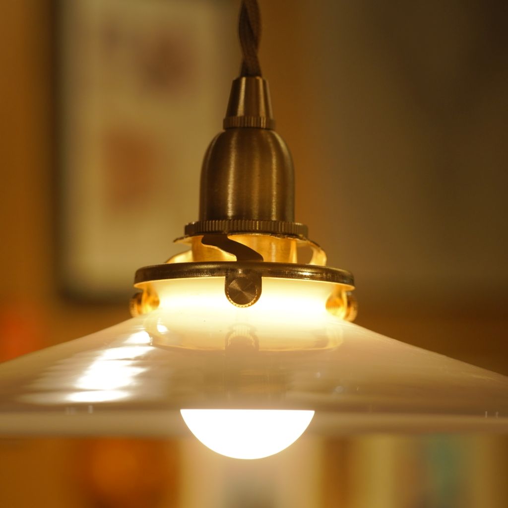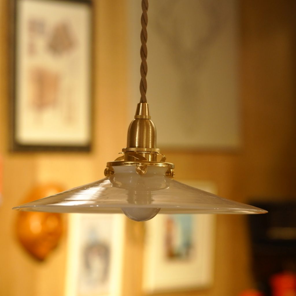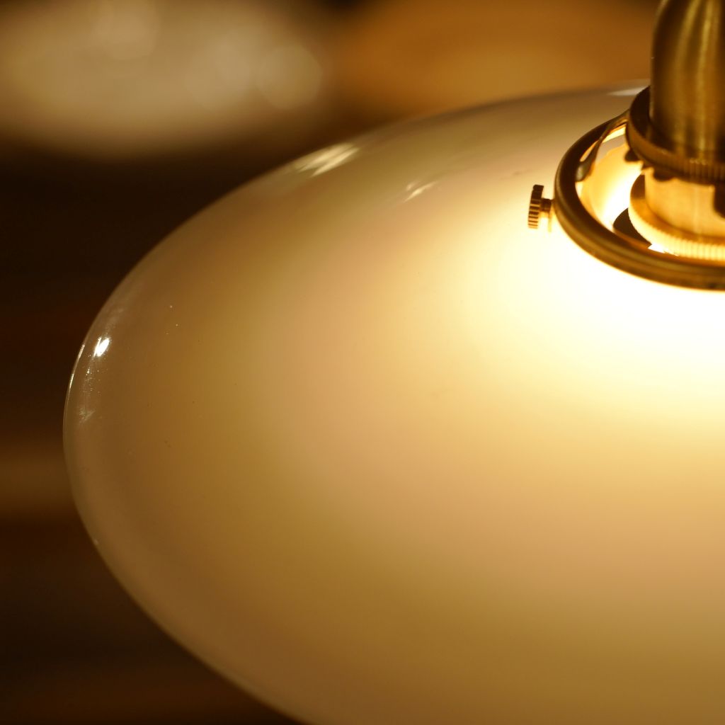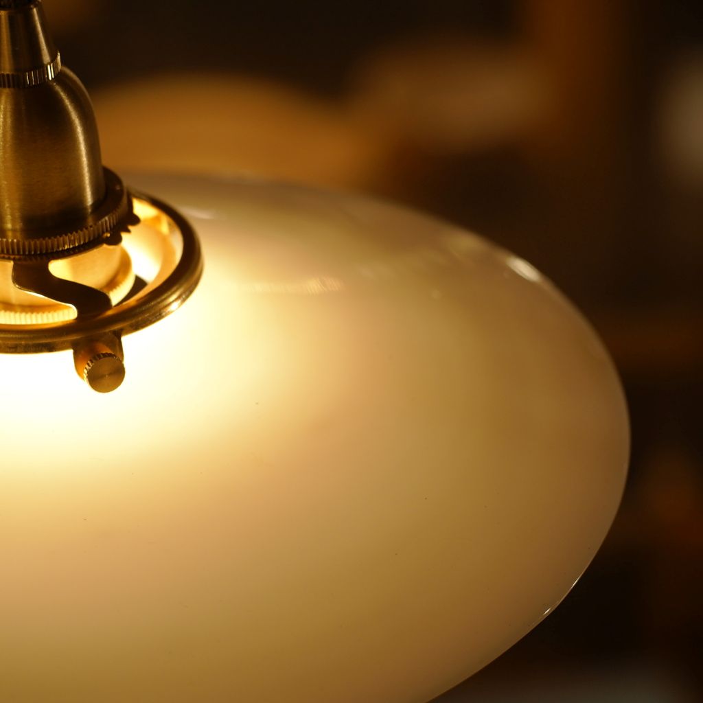 ビンテージのミルクガラス製シェードに、新品の電気部品を組み込んだペンダントライト。ミルクガラス特有の、全体がボヤっと深く光りが魅力的。シェードの上部から下部にかけて、光が優しく拡散し、空間全体に穏やかな明るさを広げます。