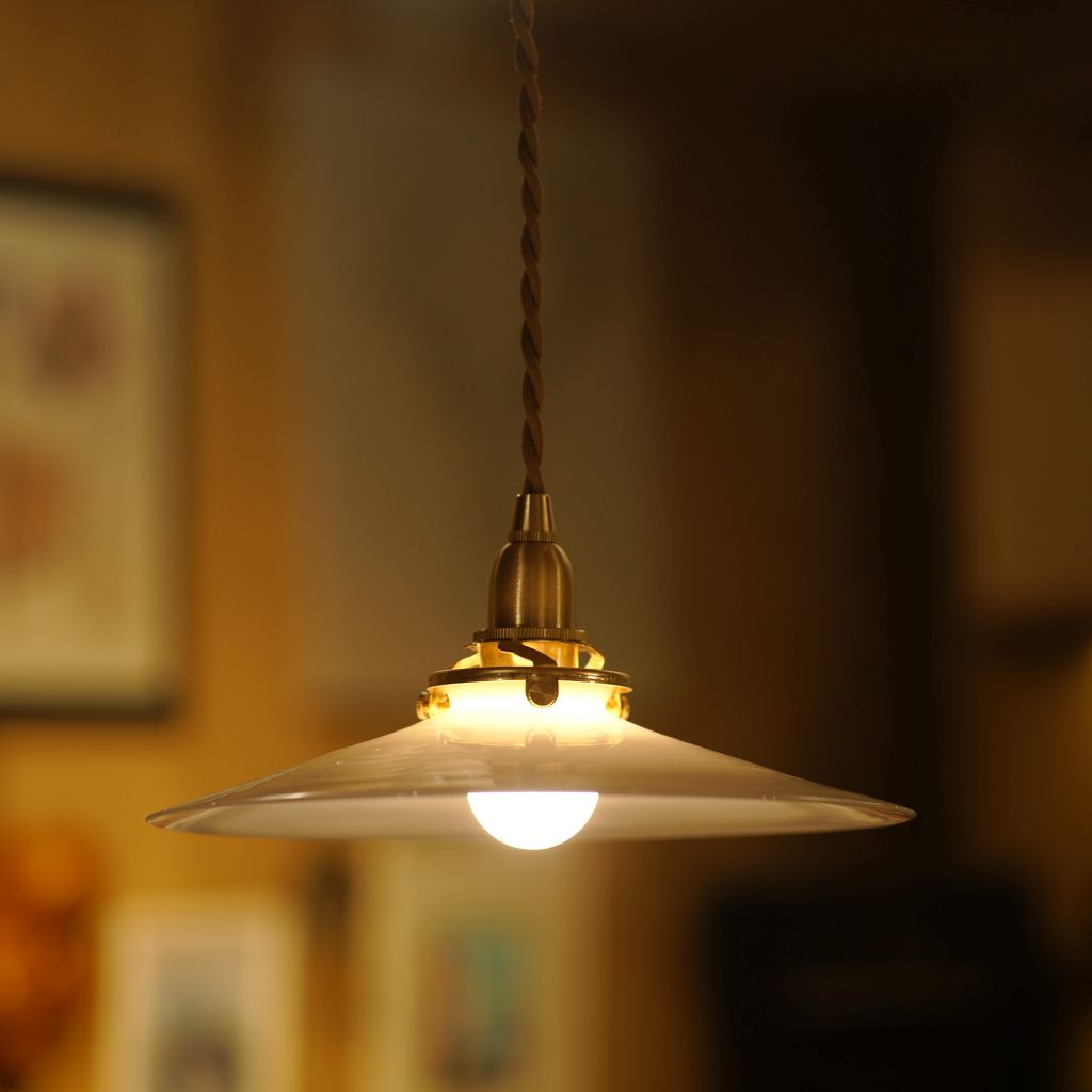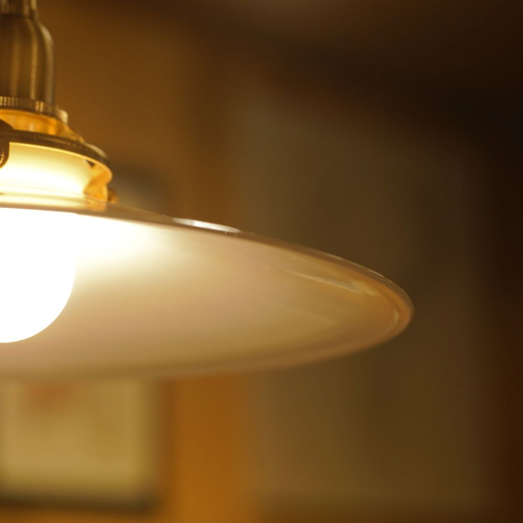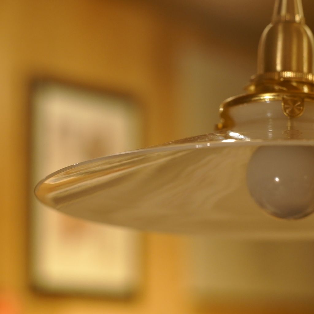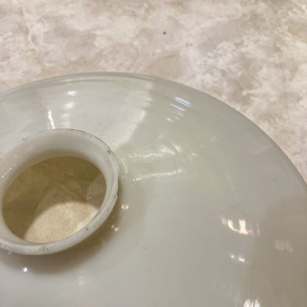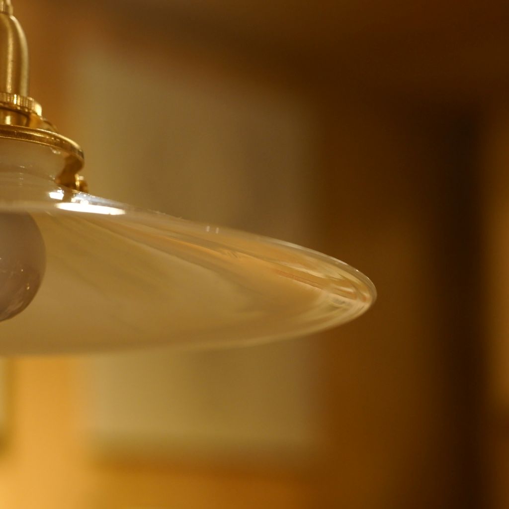 ビンテージのミルクガラス製シェードに、新品の電気部品を組み込んだペンダントライト。ミルクガラス特有の、全体がボヤっと深く光りが魅力的。シェードの上部から下部にかけて、光が優しく拡散し、空間全体に穏やかな明るさを広げます。