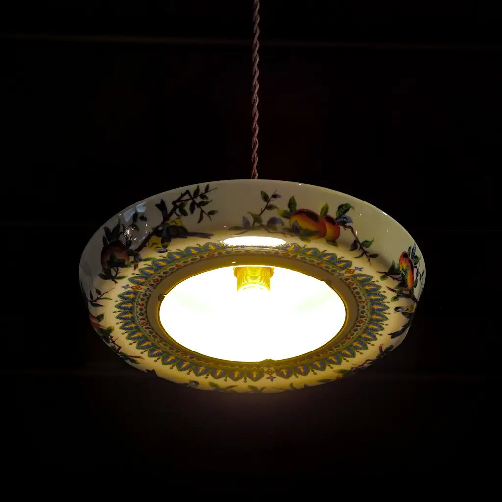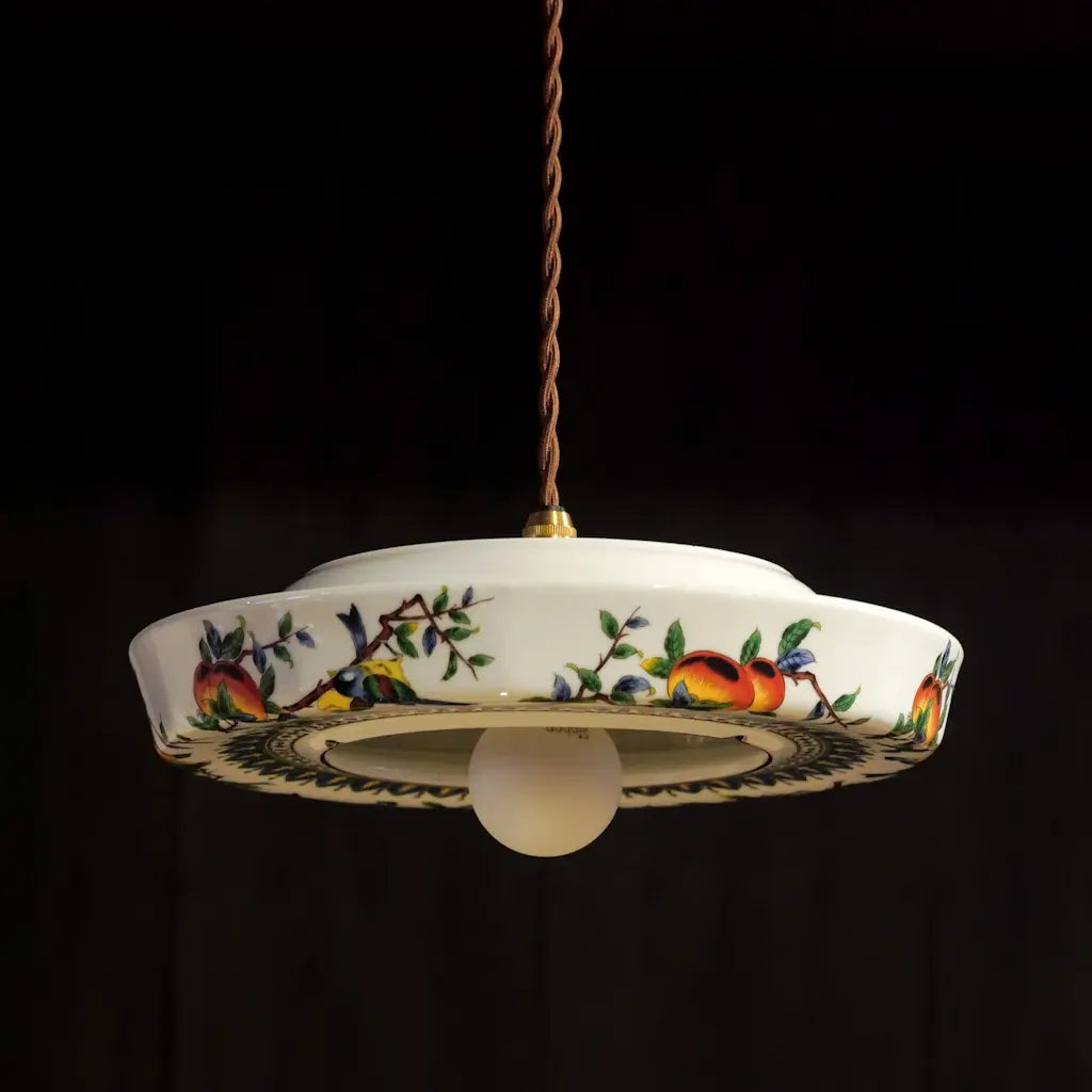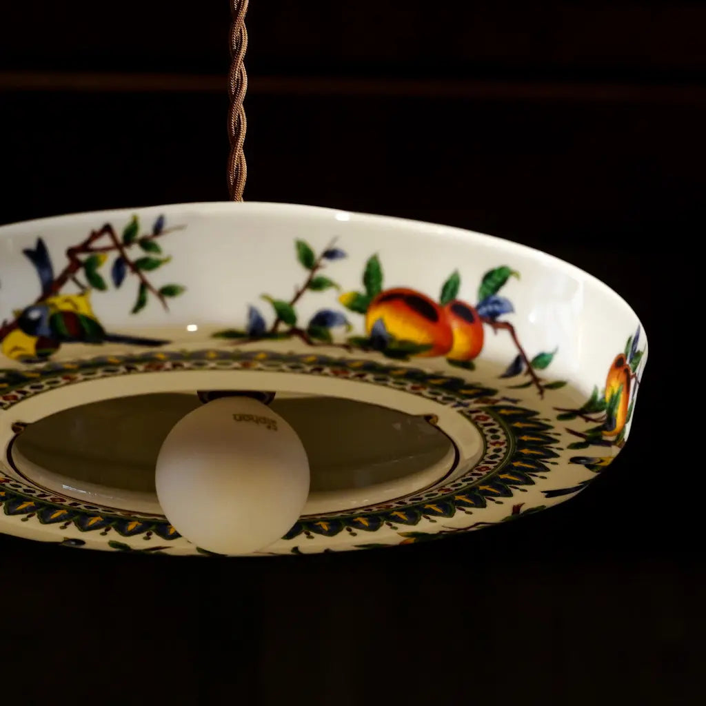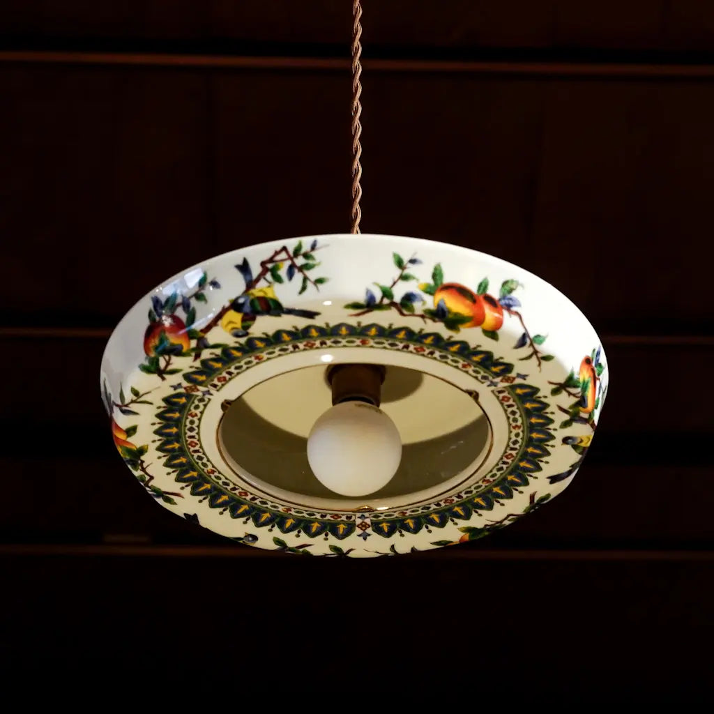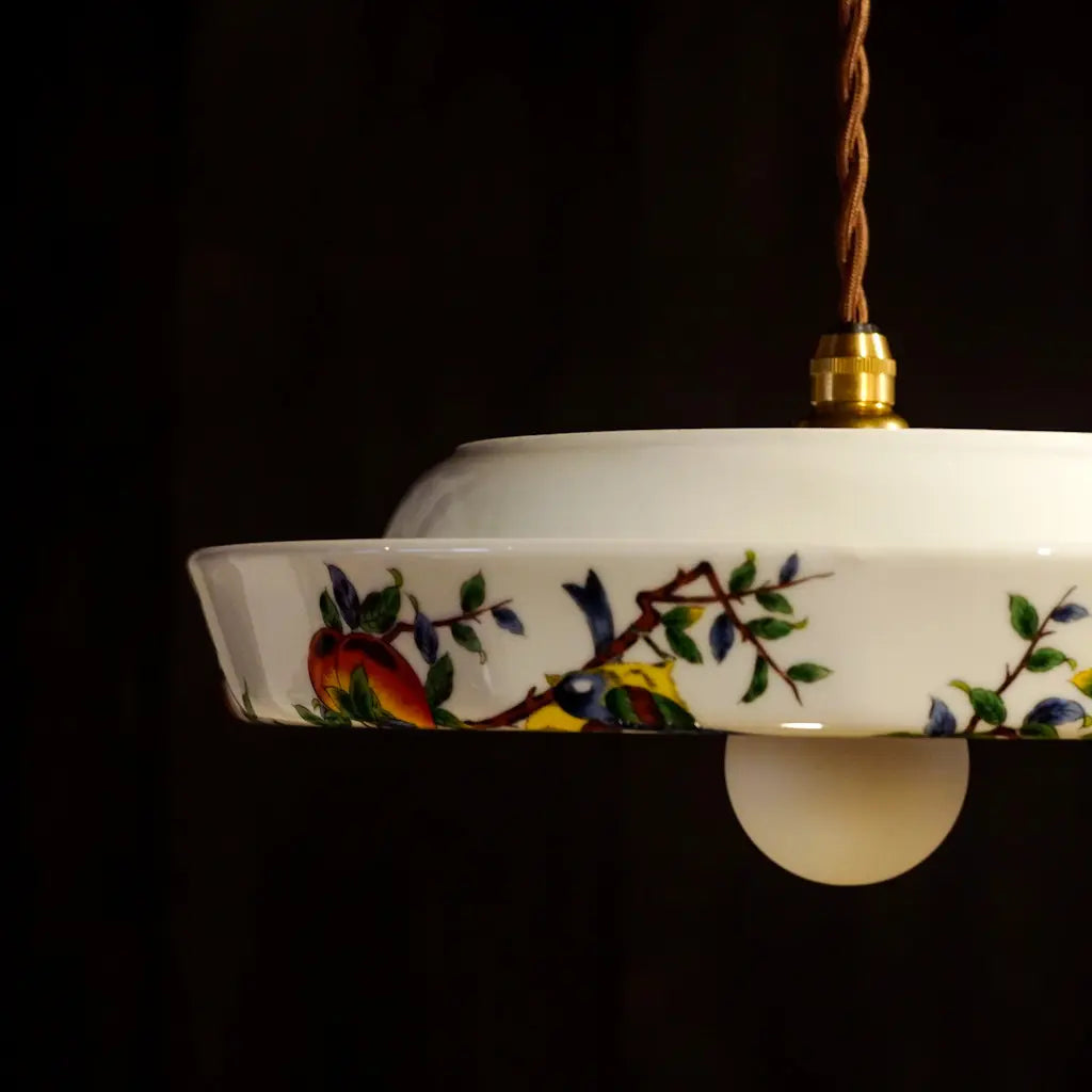 九谷焼・俊山の灰皿をリメイクしたペンダントライト。柿の実をついばむ小鳥たちが、生き生きと描かれています。繊細な絵付けと、九谷焼らしい色彩が、空間に上品な遊び心を添えます。見上げるたびに、穏やかな情景が目に浮かびます。