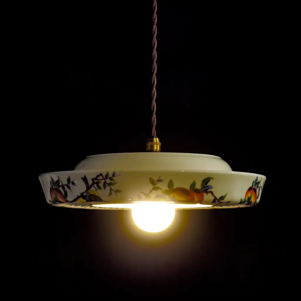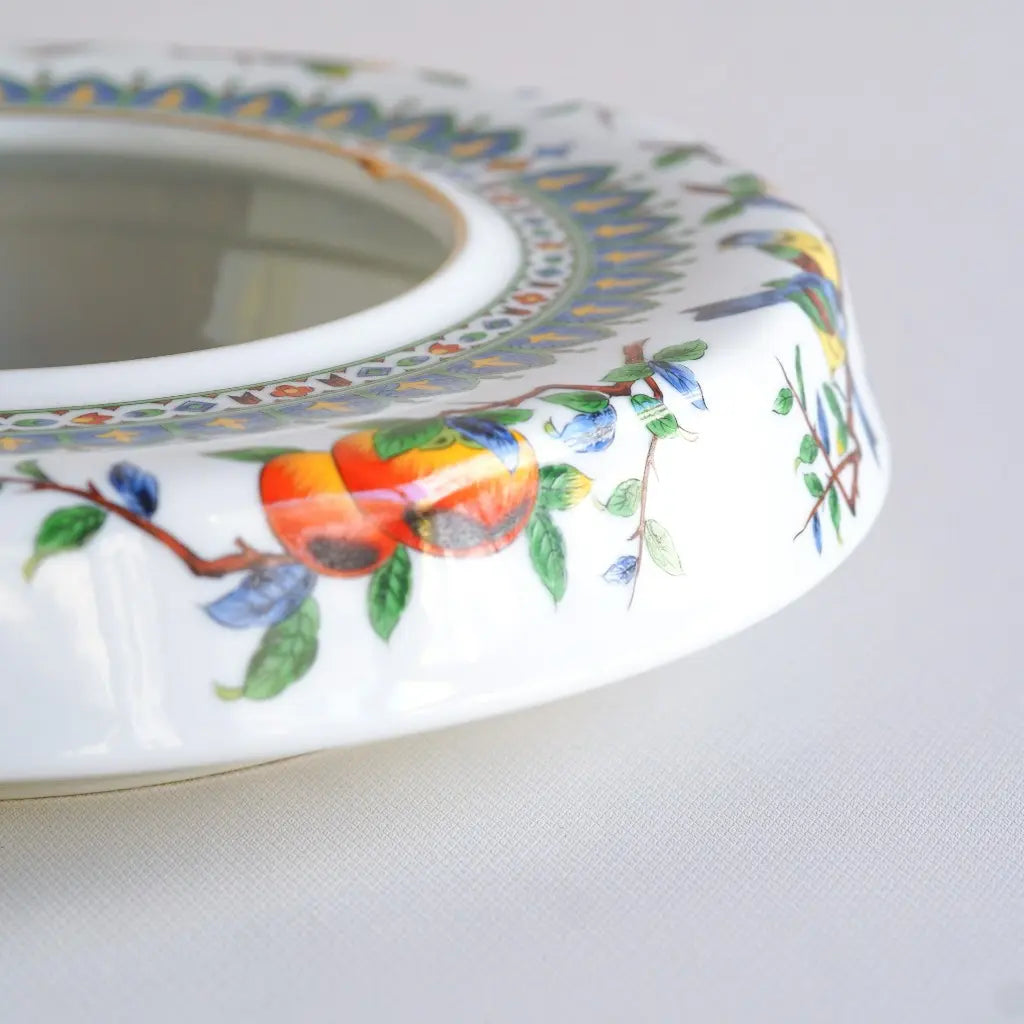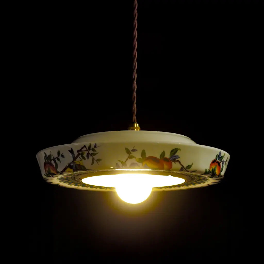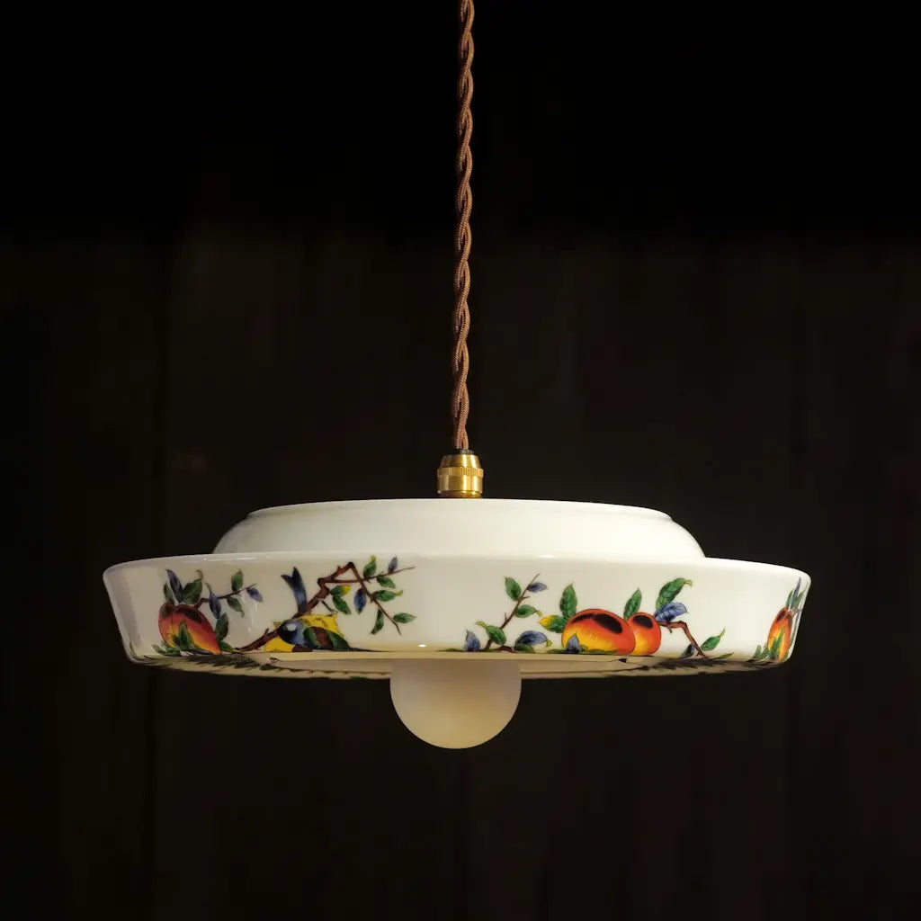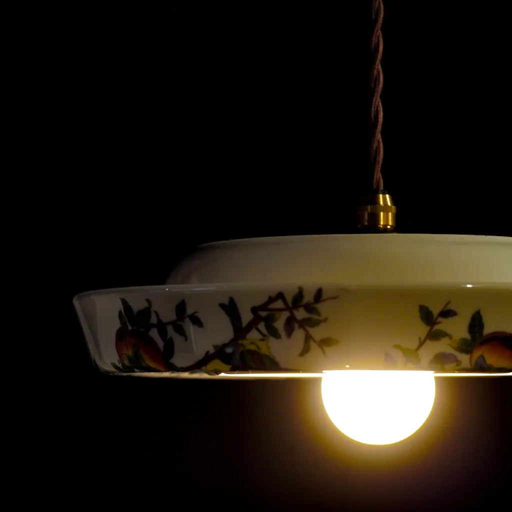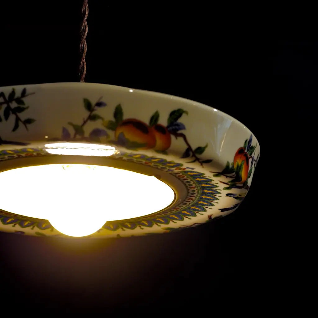 九谷焼・俊山の灰皿をリメイクしたペンダントライト。柿の実をついばむ小鳥たちが、生き生きと描かれています。繊細な絵付けと、九谷焼らしい色彩が、空間に上品な遊び心を添えます。見上げるたびに、穏やかな情景が目に浮かびます。