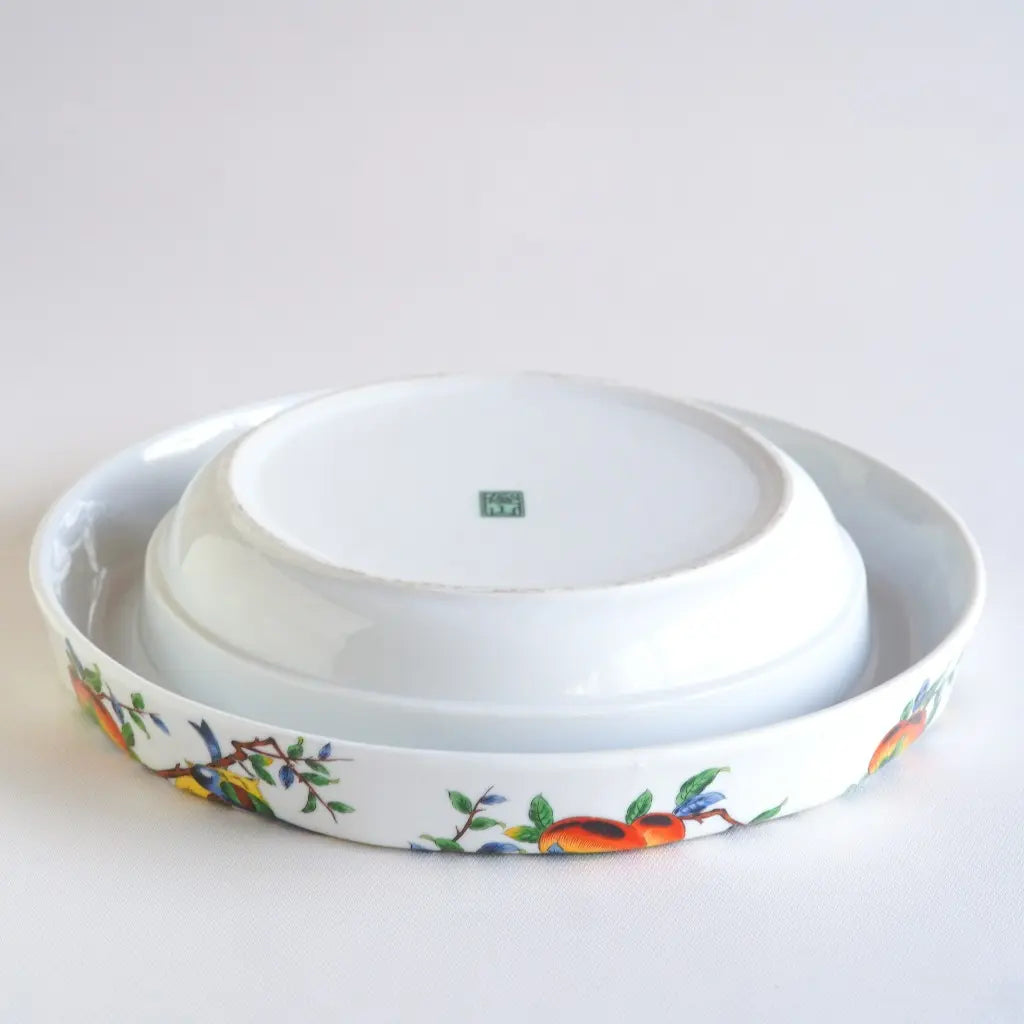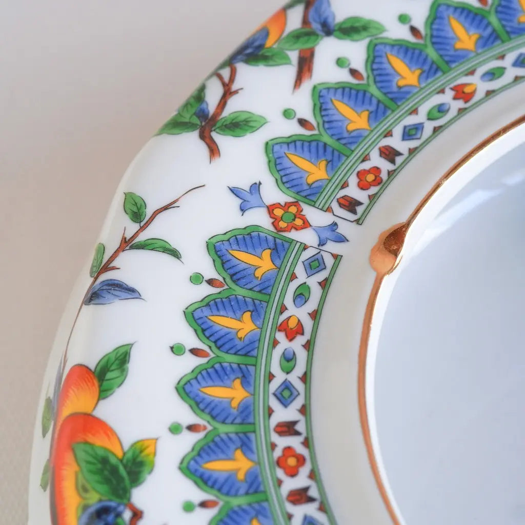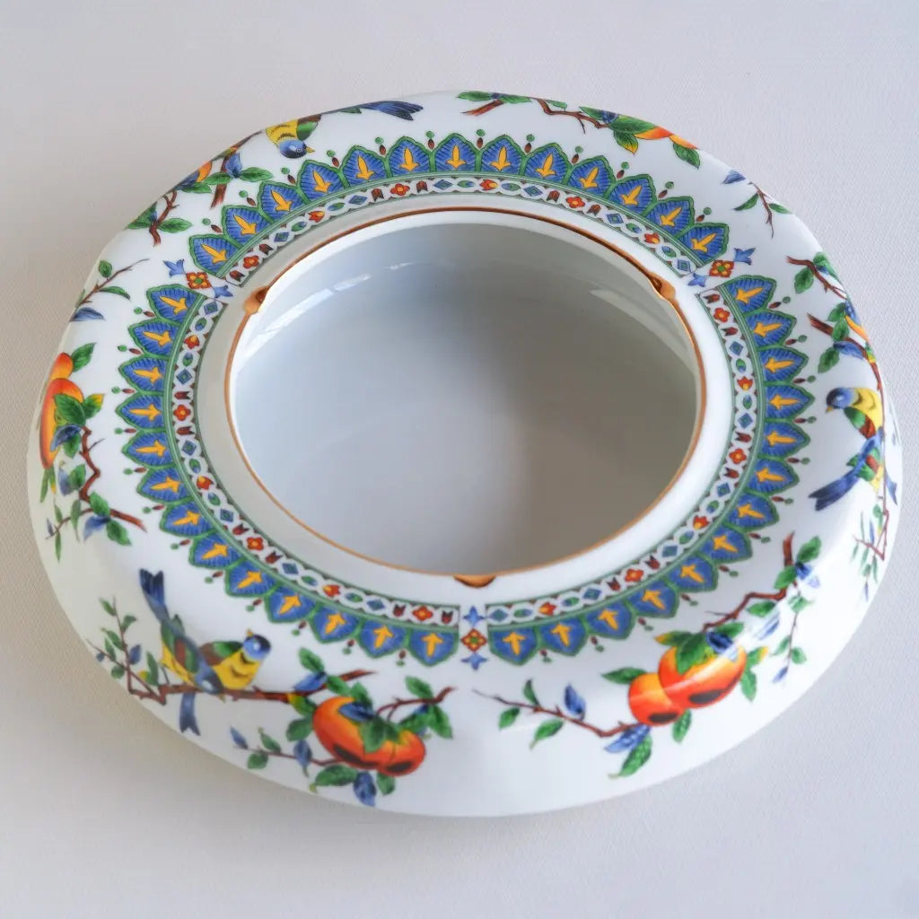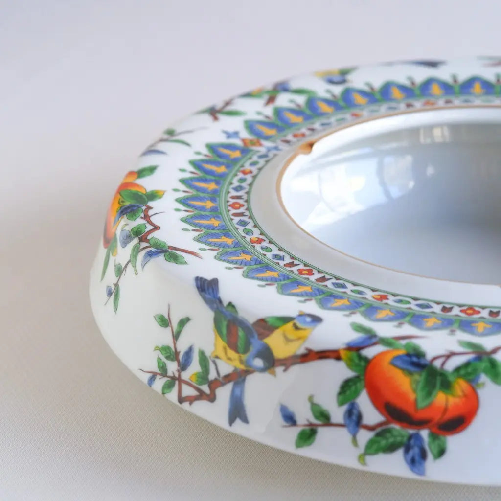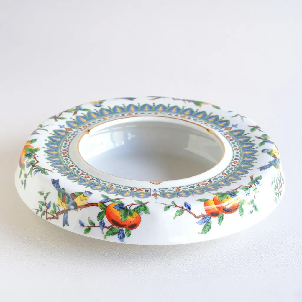 九谷焼・俊山の灰皿をリメイクしたペンダントライト。柿の実をついばむ小鳥たちが、生き生きと描かれています。繊細な絵付けと、九谷焼らしい色彩が、空間に上品な遊び心を添えます。見上げるたびに、穏やかな情景が目に浮かびます。