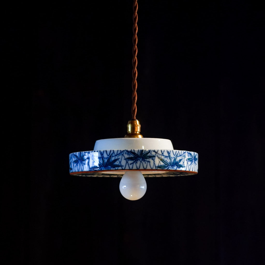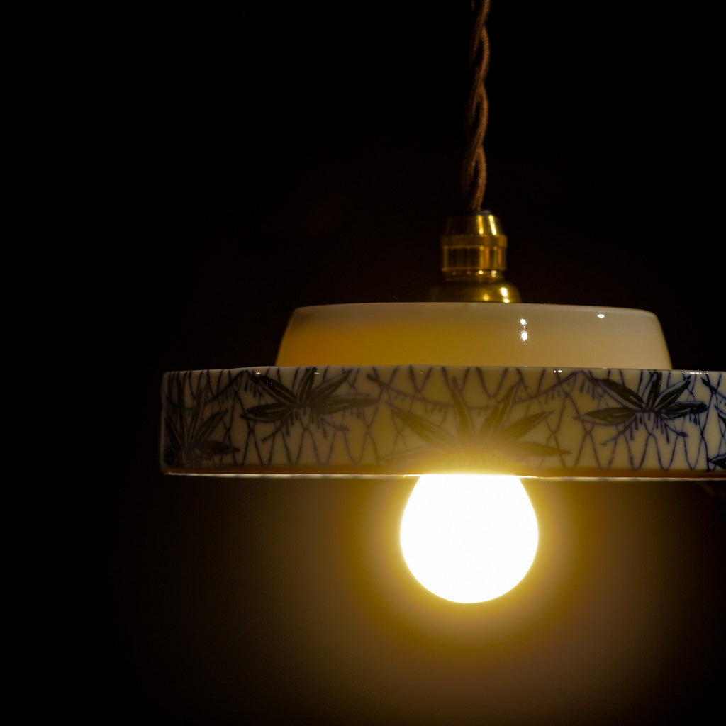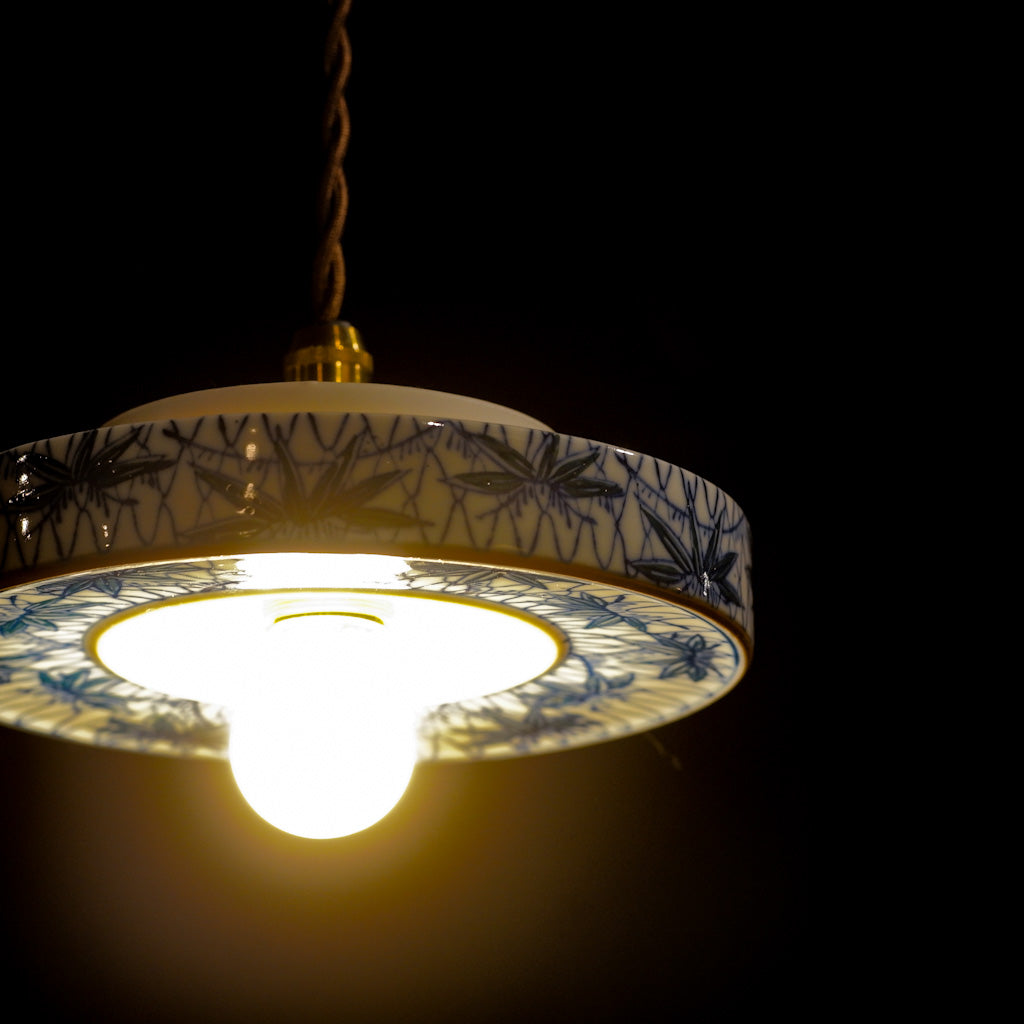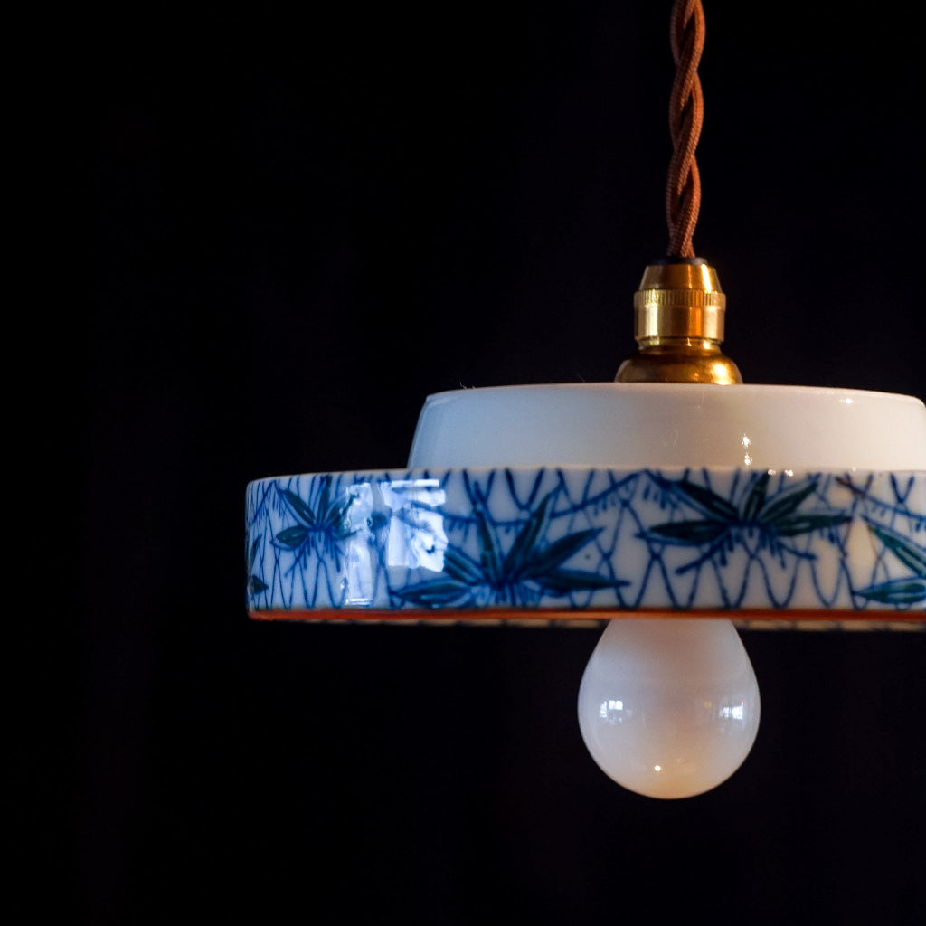 笹(ささ)の葉と網目文様が美しい灰皿をリメイクしたペンダントライト。藍色の濃淡で描かれた涼しげな笹の葉と、背景に巡らされた繊細な網目文様が、和の趣を深めます。端正な白磁の美しさと、丁寧に描かれた絵付けが、空間に凛とした上品な雰囲気を添えます。