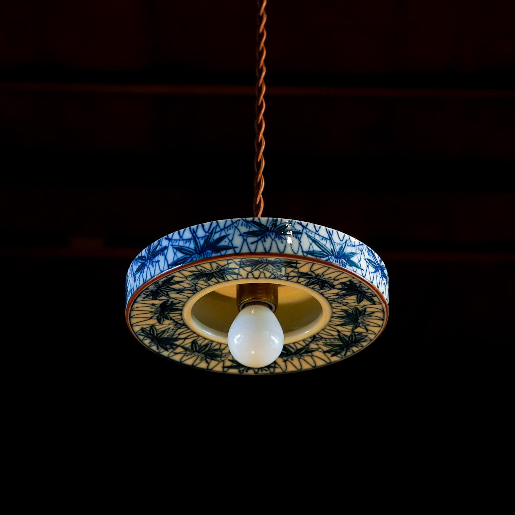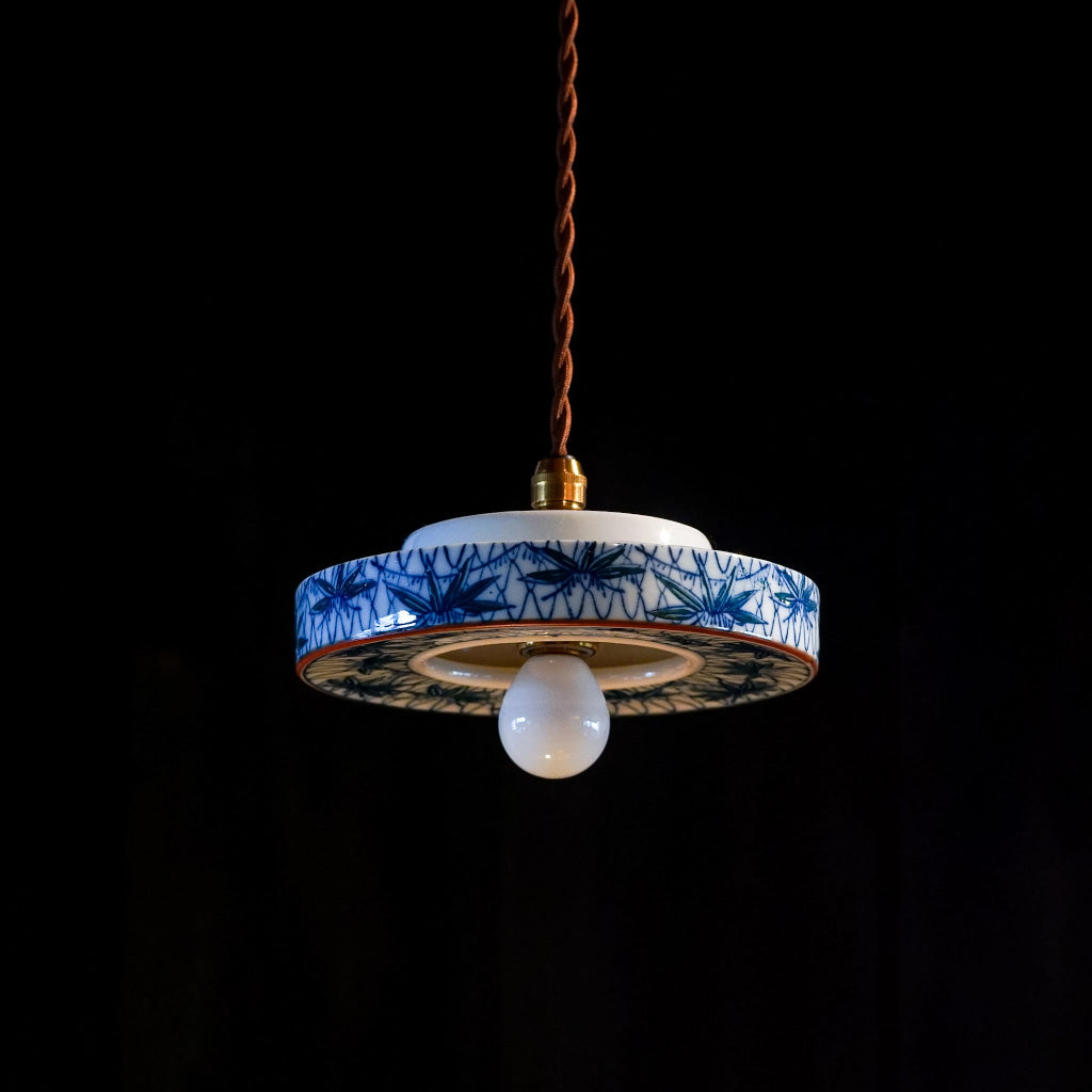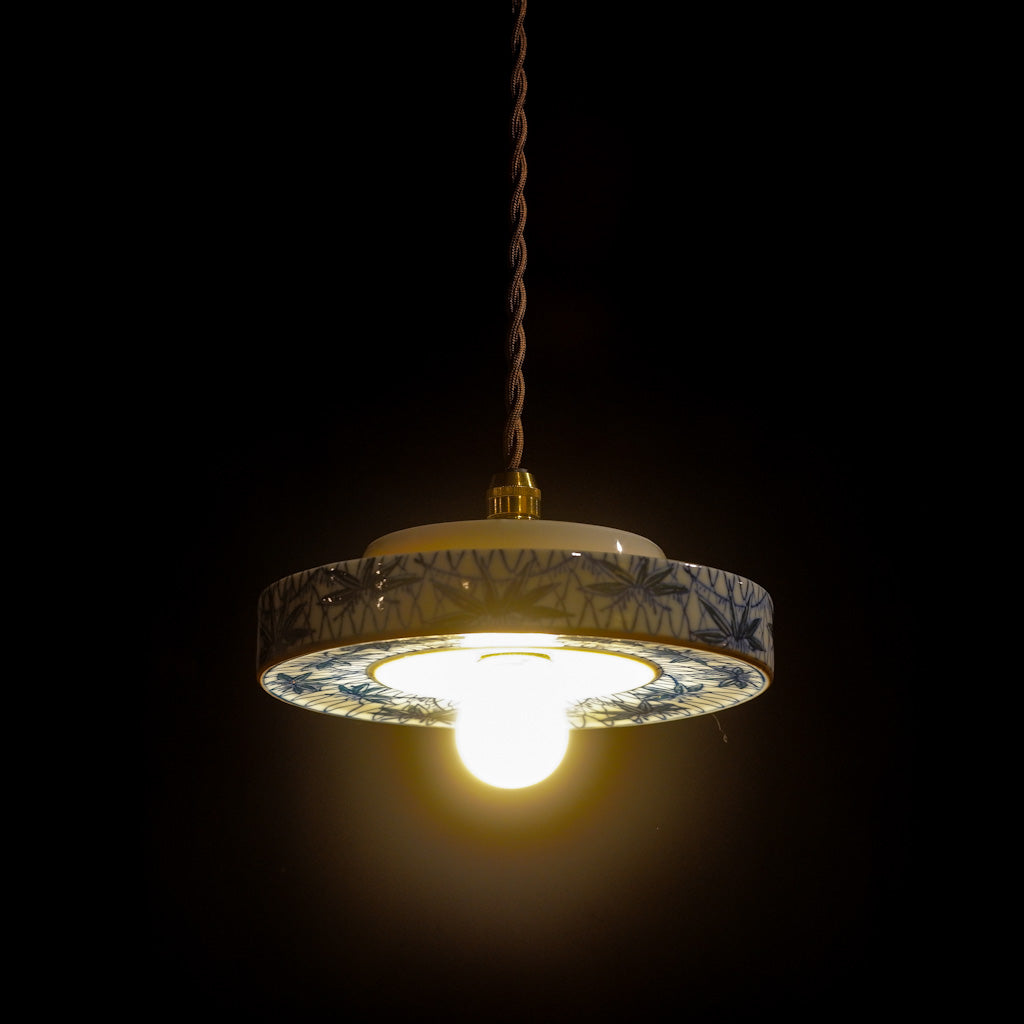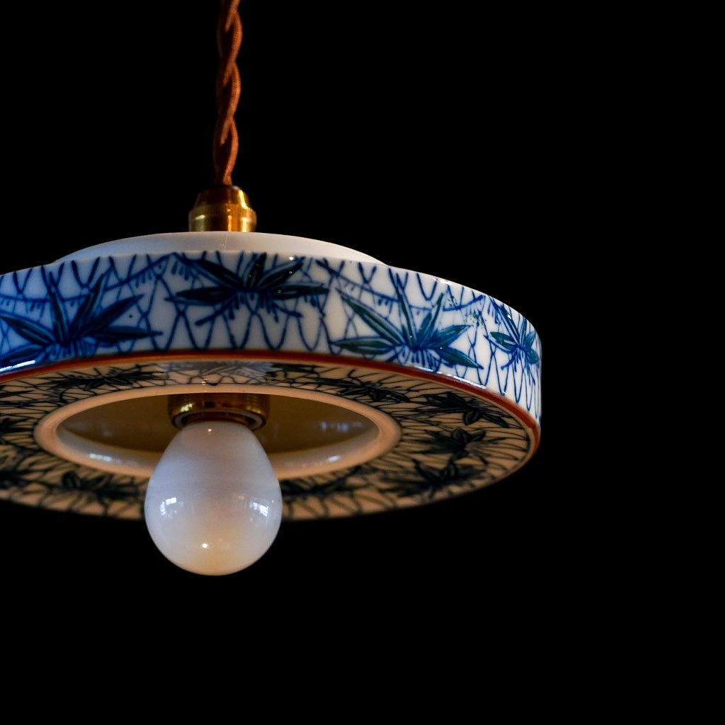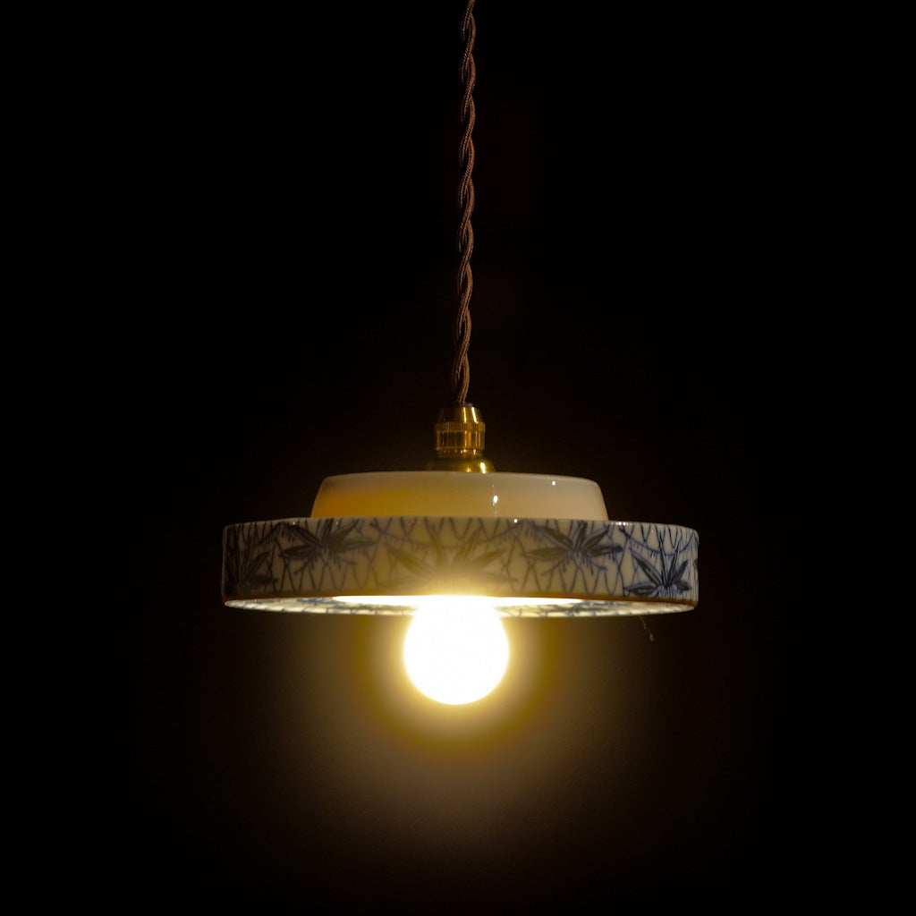 笹(ささ)の葉と網目文様が美しい灰皿をリメイクしたペンダントライト。藍色の濃淡で描かれた涼しげな笹の葉と、背景に巡らされた繊細な網目文様が、和の趣を深めます。端正な白磁の美しさと、丁寧に描かれた絵付けが、空間に凛とした上品な雰囲気を添えます。