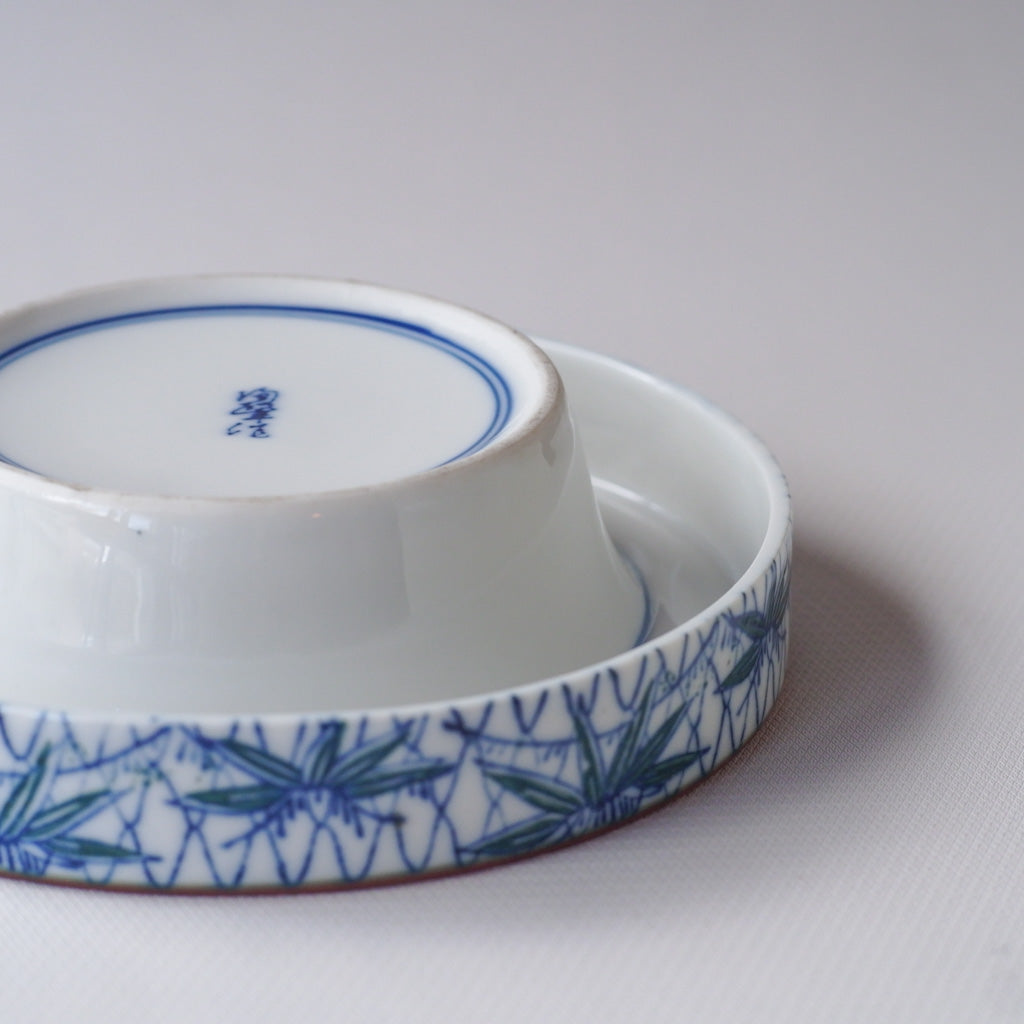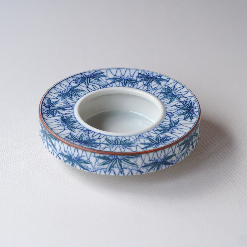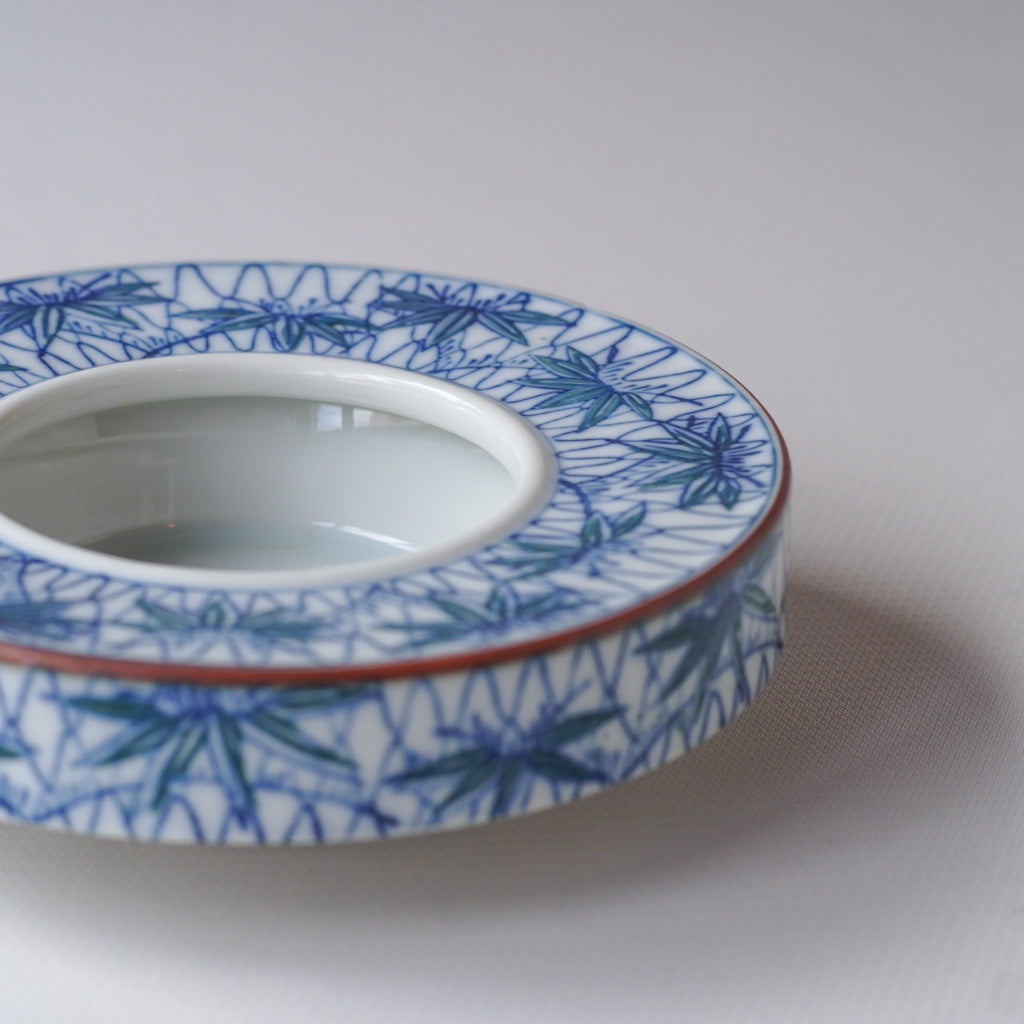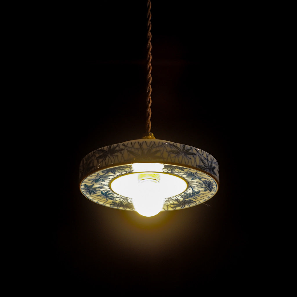笹(ささ)の葉と網目文様が美しい灰皿をリメイクしたペンダントライト。藍色の濃淡で描かれた涼しげな笹の葉と、背景に巡らされた繊細な網目文様が、和の趣を深めます。端正な白磁の美しさと、丁寧に描かれた絵付けが、空間に凛とした上品な雰囲気を添えます。
