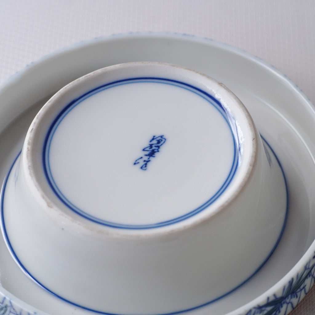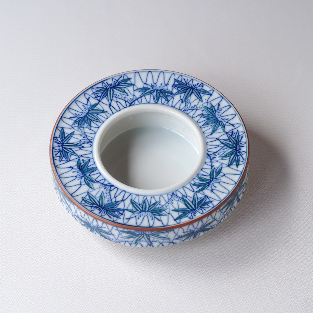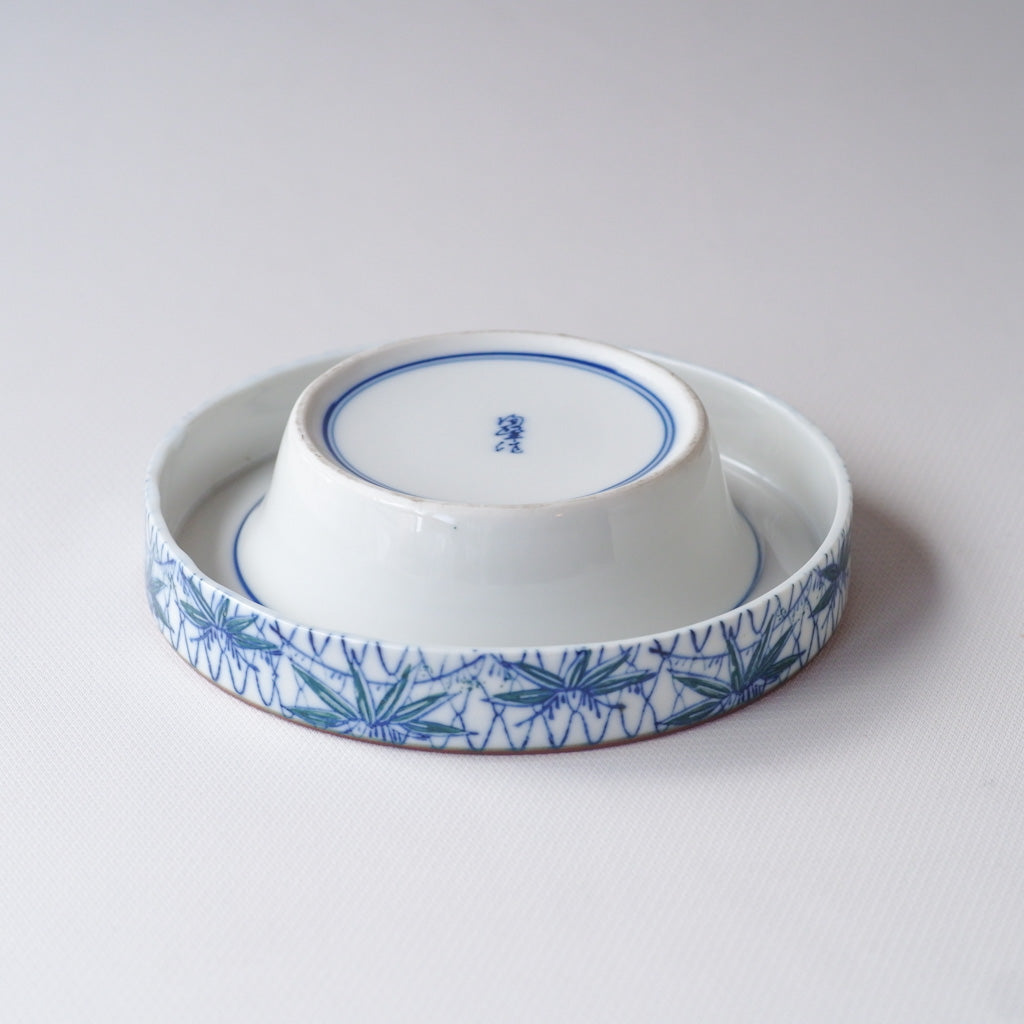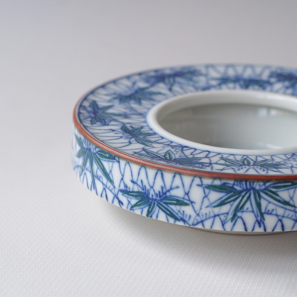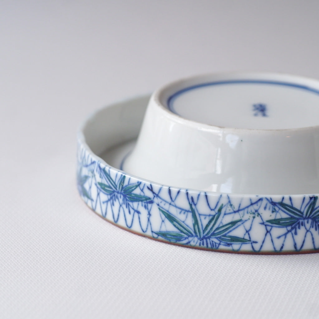 笹(ささ)の葉と網目文様が美しい灰皿をリメイクしたペンダントライト。藍色の濃淡で描かれた涼しげな笹の葉と、背景に巡らされた繊細な網目文様が、和の趣を深めます。端正な白磁の美しさと、丁寧に描かれた絵付けが、空間に凛とした上品な雰囲気を添えます。