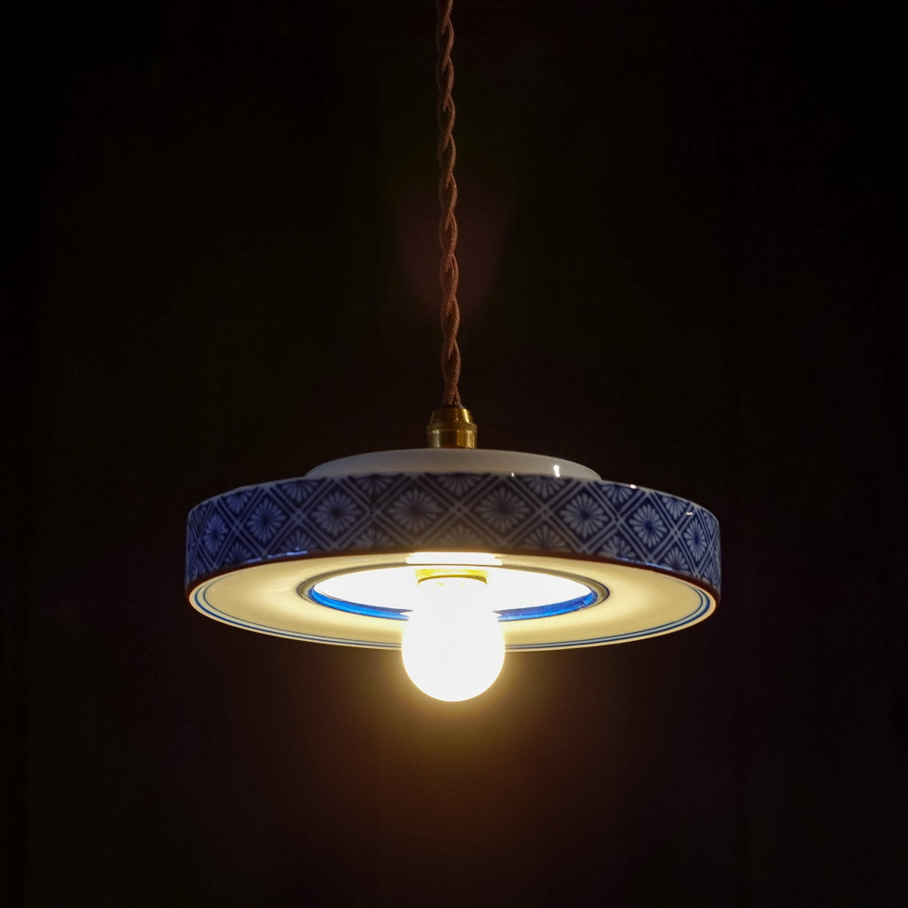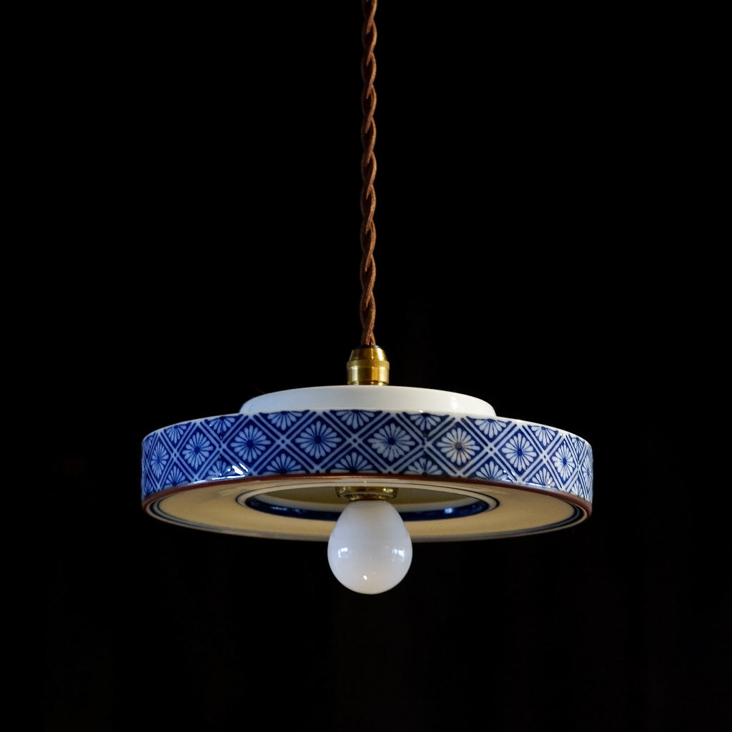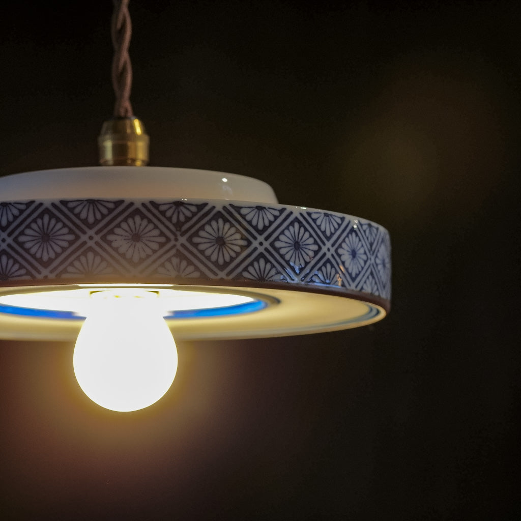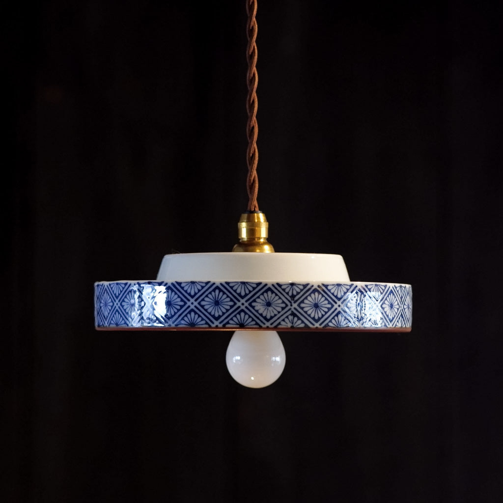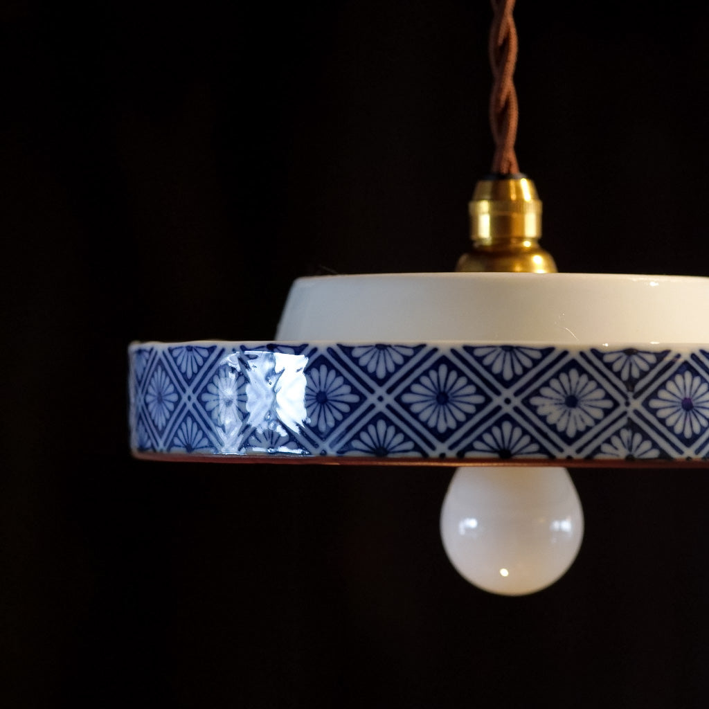 有田焼・清陶苑の灰皿をリメイクしたペンダントライト。紫陽花(あじさい)の図柄が印象的。梅雨に濡れる紫陽花のように、瑞々しく落ち着いた雰囲気を醸し出します。