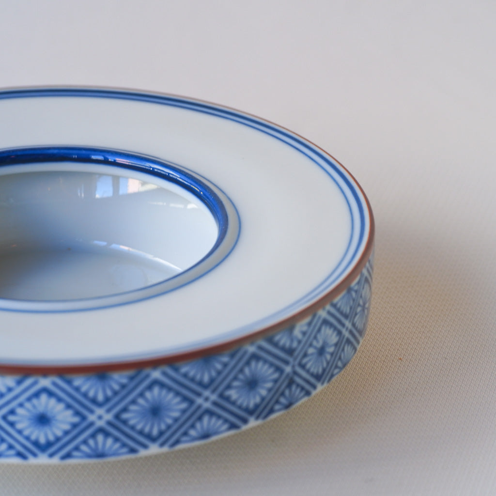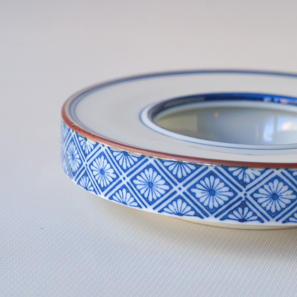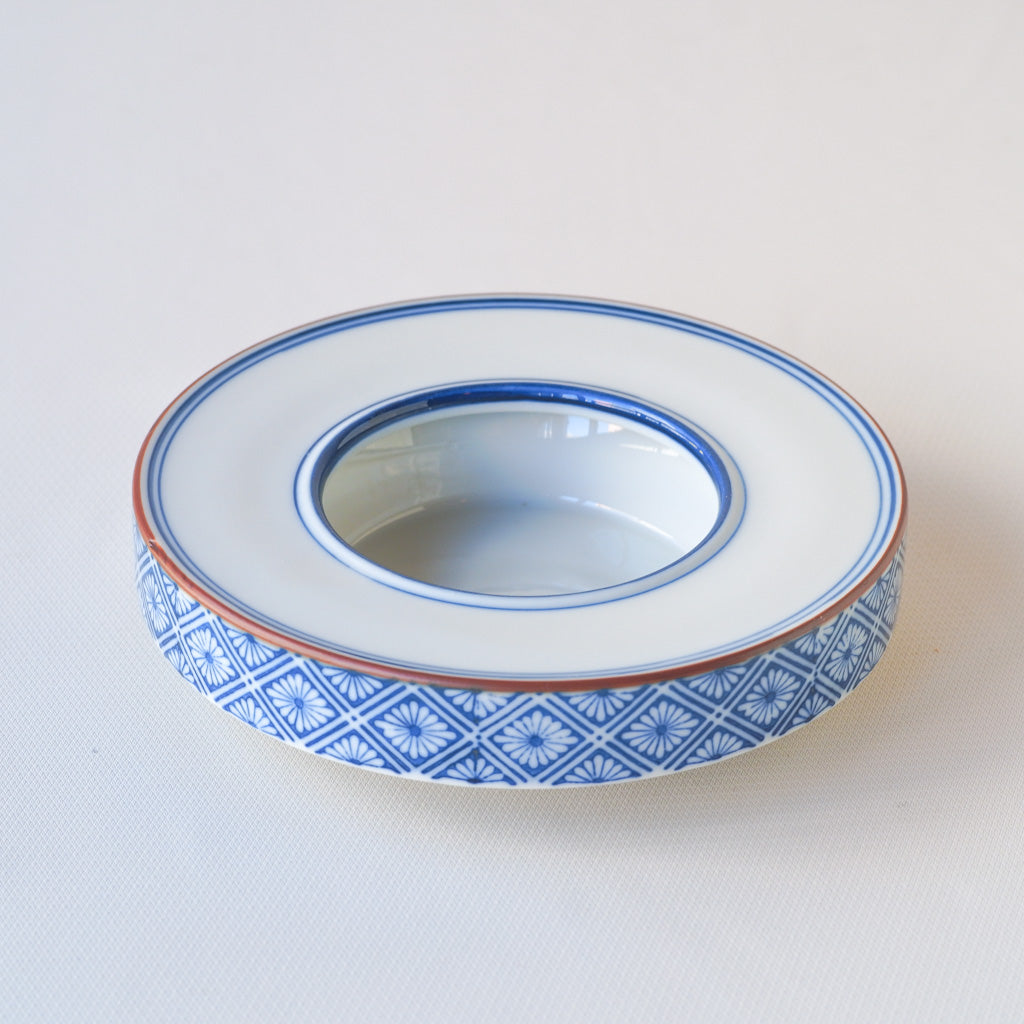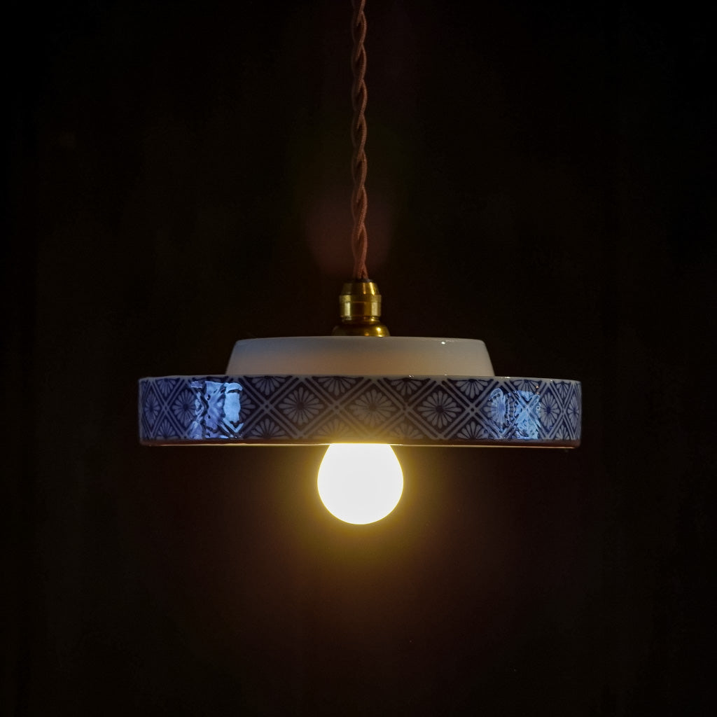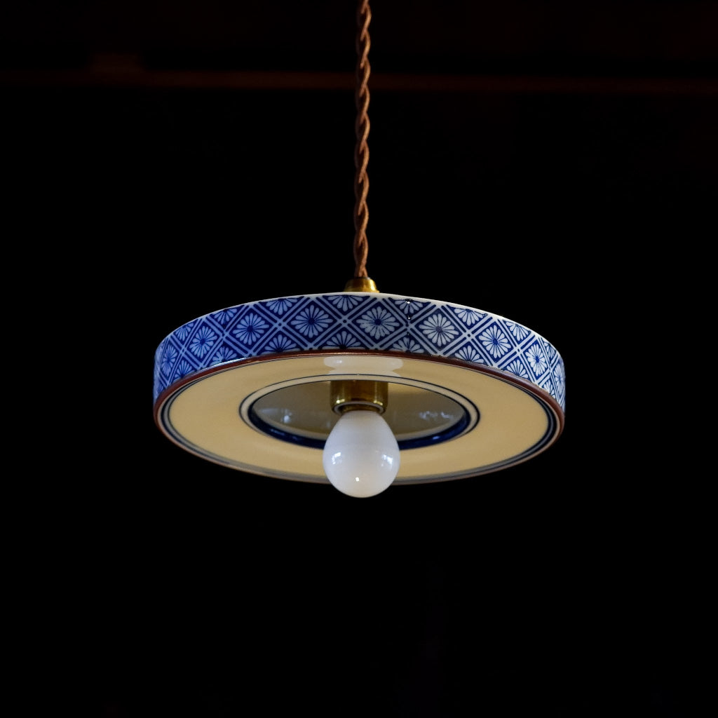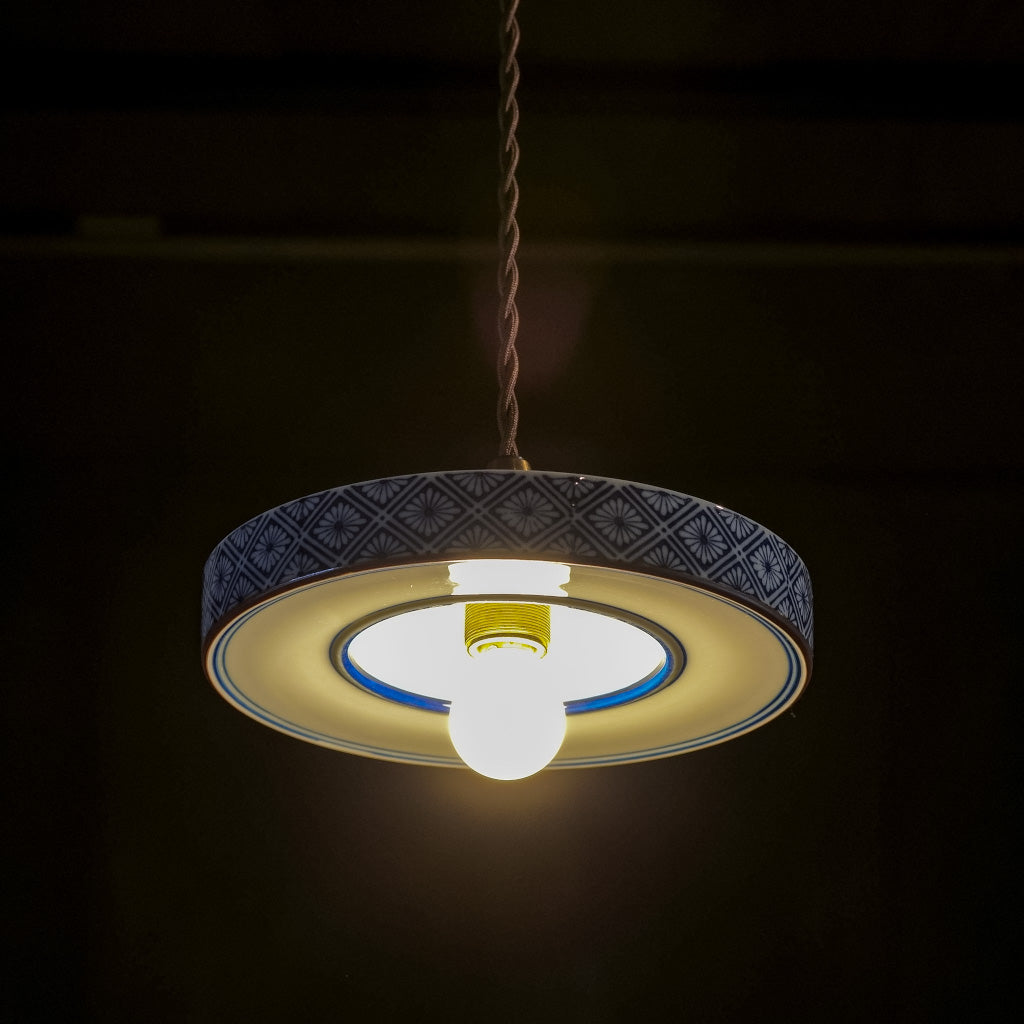 有田焼・清陶苑の灰皿をリメイクしたペンダントライト。紫陽花(あじさい)の図柄が印象的。梅雨に濡れる紫陽花のように、瑞々しく落ち着いた雰囲気を醸し出します。