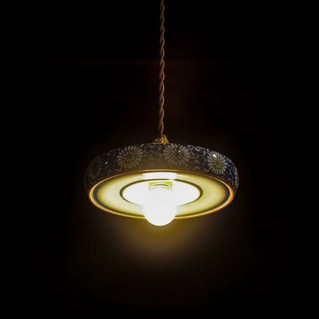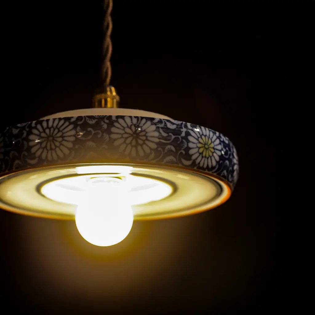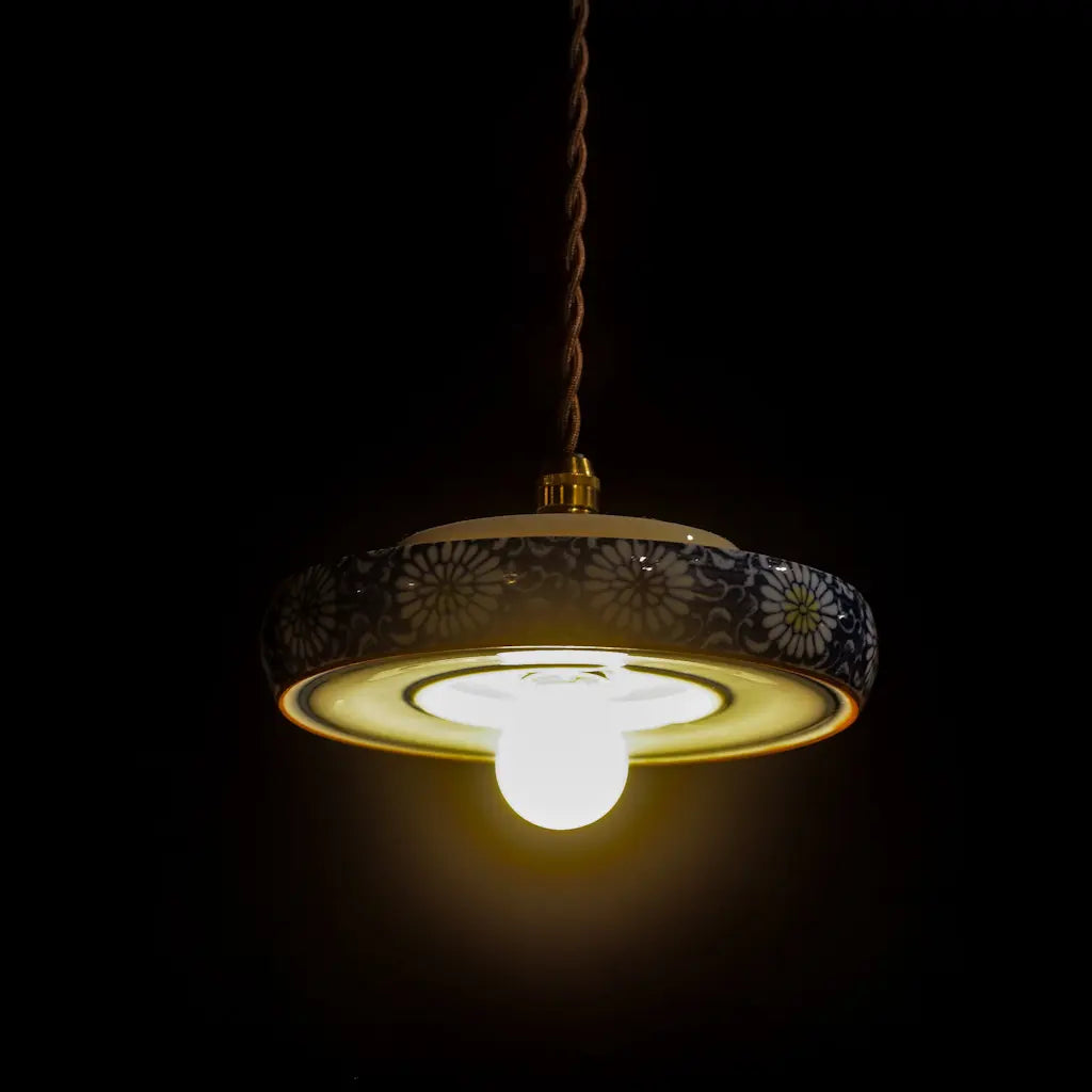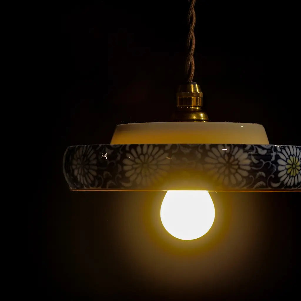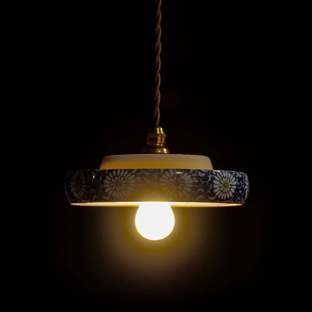 丸みを帯びた愛らしい灰皿をリメイクしたペンダントライト。落ち着いた藍色で描かれた菊と唐草文様は、和の格調を感じさます。灰皿のふっくらした形状がそのままシェードの優しい曲面となり、空間に柔らかな表情を添えます。白磁の上に繊細な文様がくっきりと浮かび上がり、日本の美意識が詰まった上質な光を届けます。