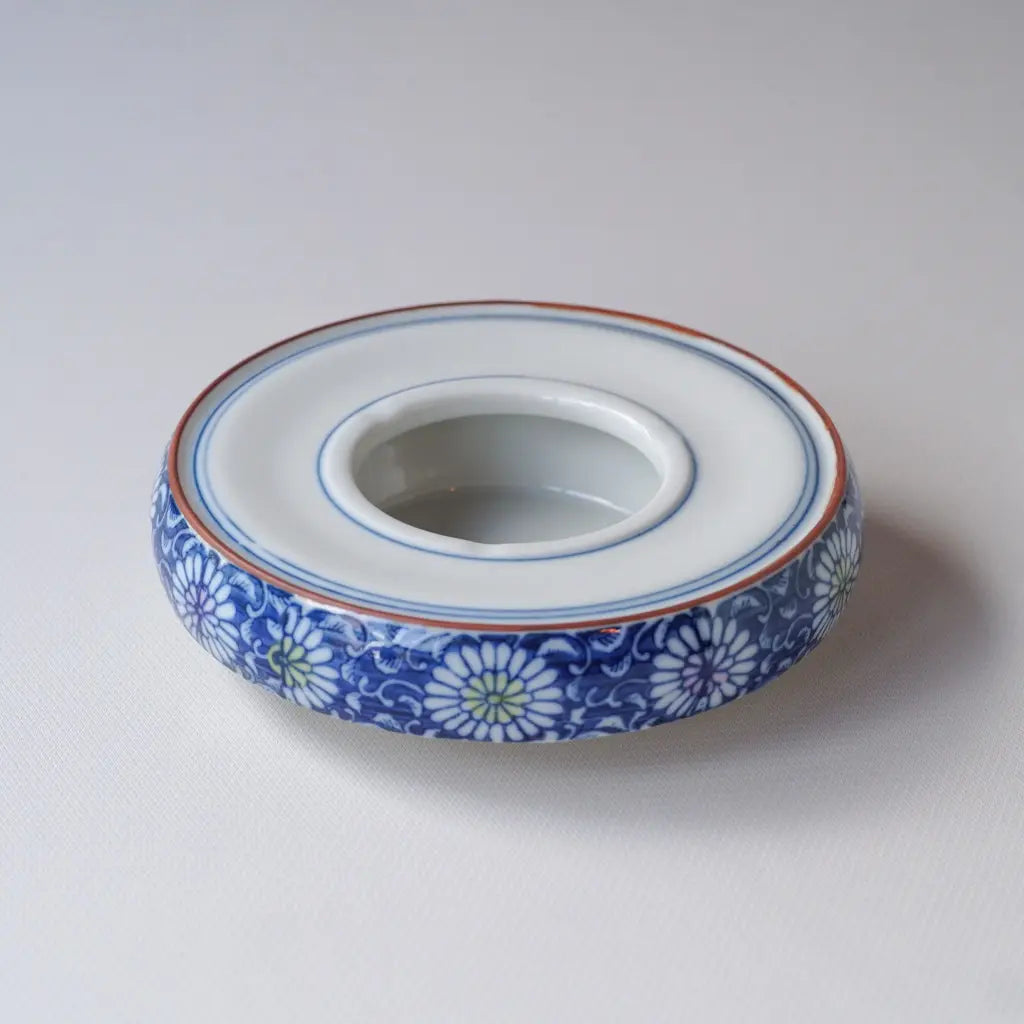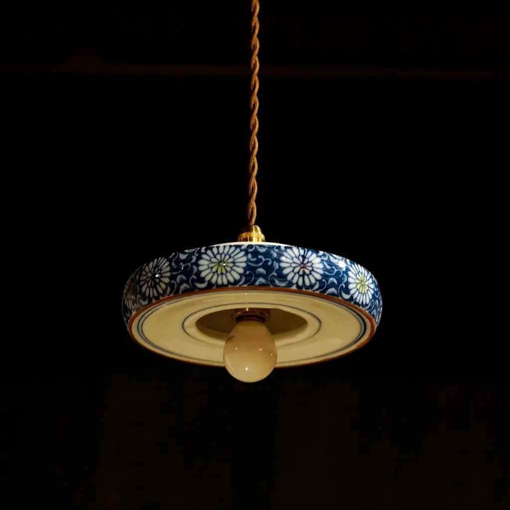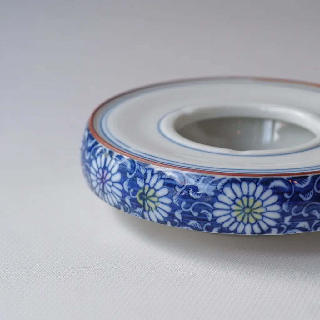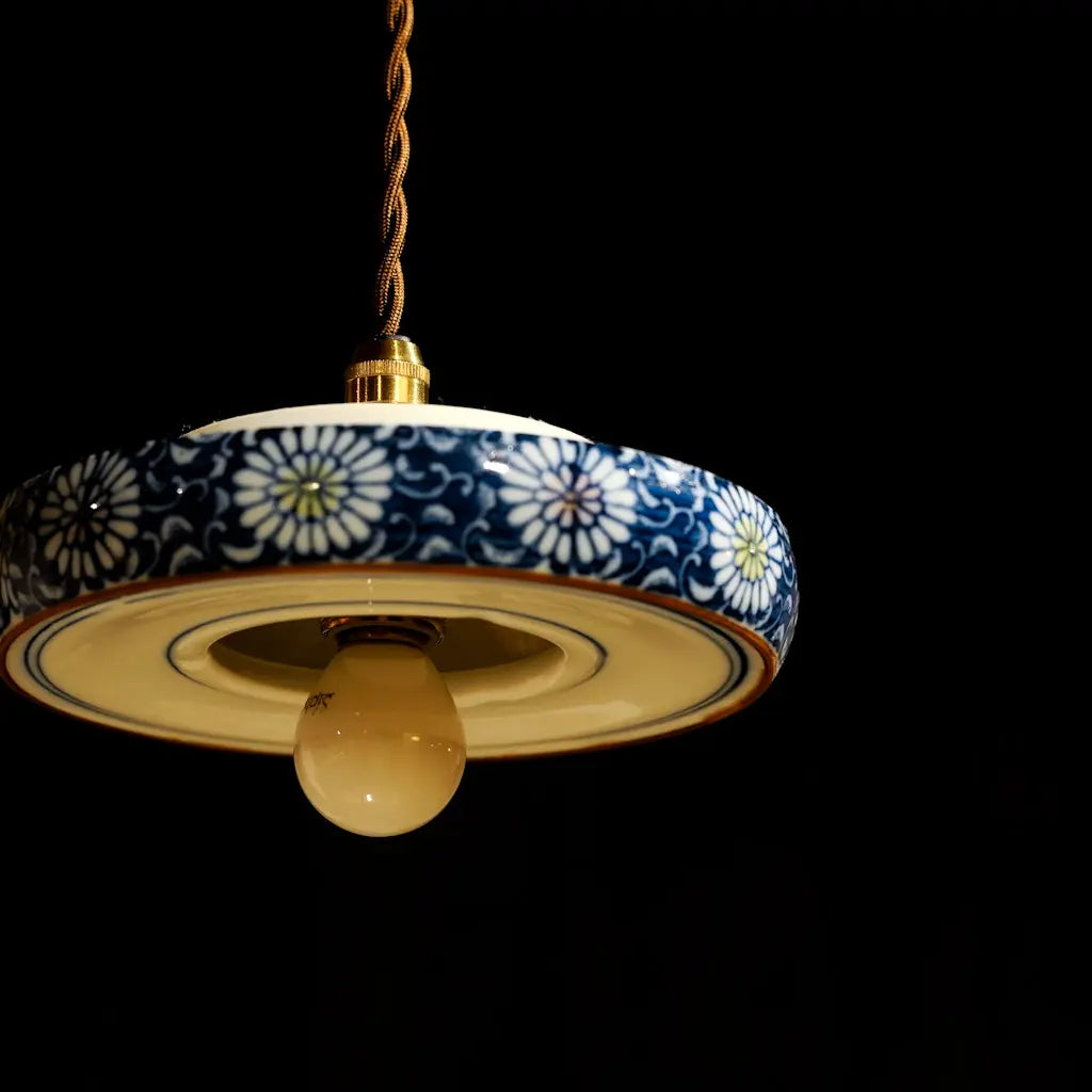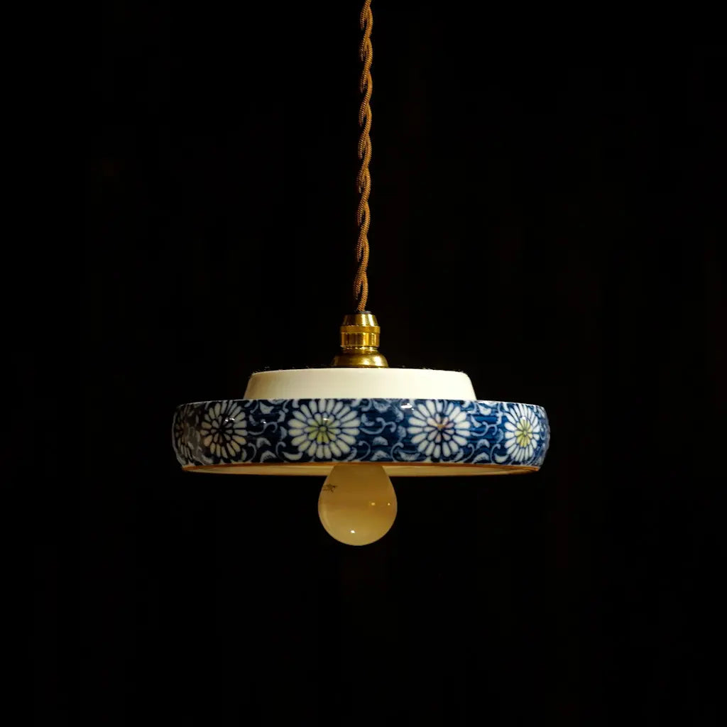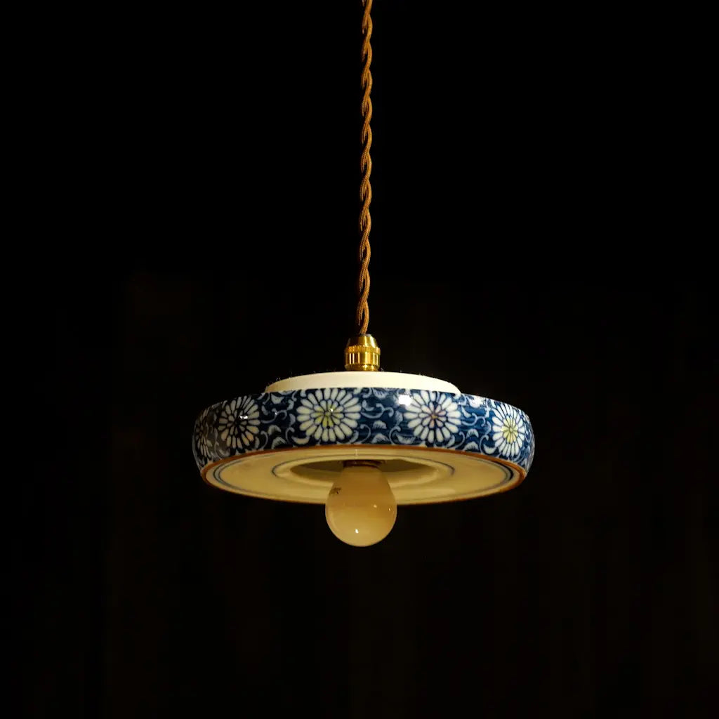 丸みを帯びた愛らしい灰皿をリメイクしたペンダントライト。落ち着いた藍色で描かれた菊と唐草文様は、和の格調を感じさます。灰皿のふっくらした形状がそのままシェードの優しい曲面となり、空間に柔らかな表情を添えます。白磁の上に繊細な文様がくっきりと浮かび上がり、日本の美意識が詰まった上質な光を届けます。