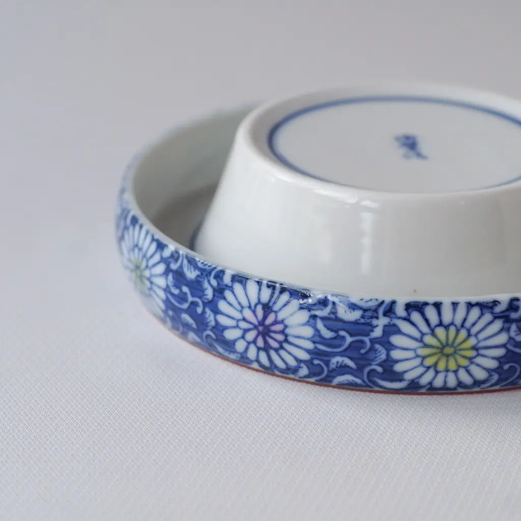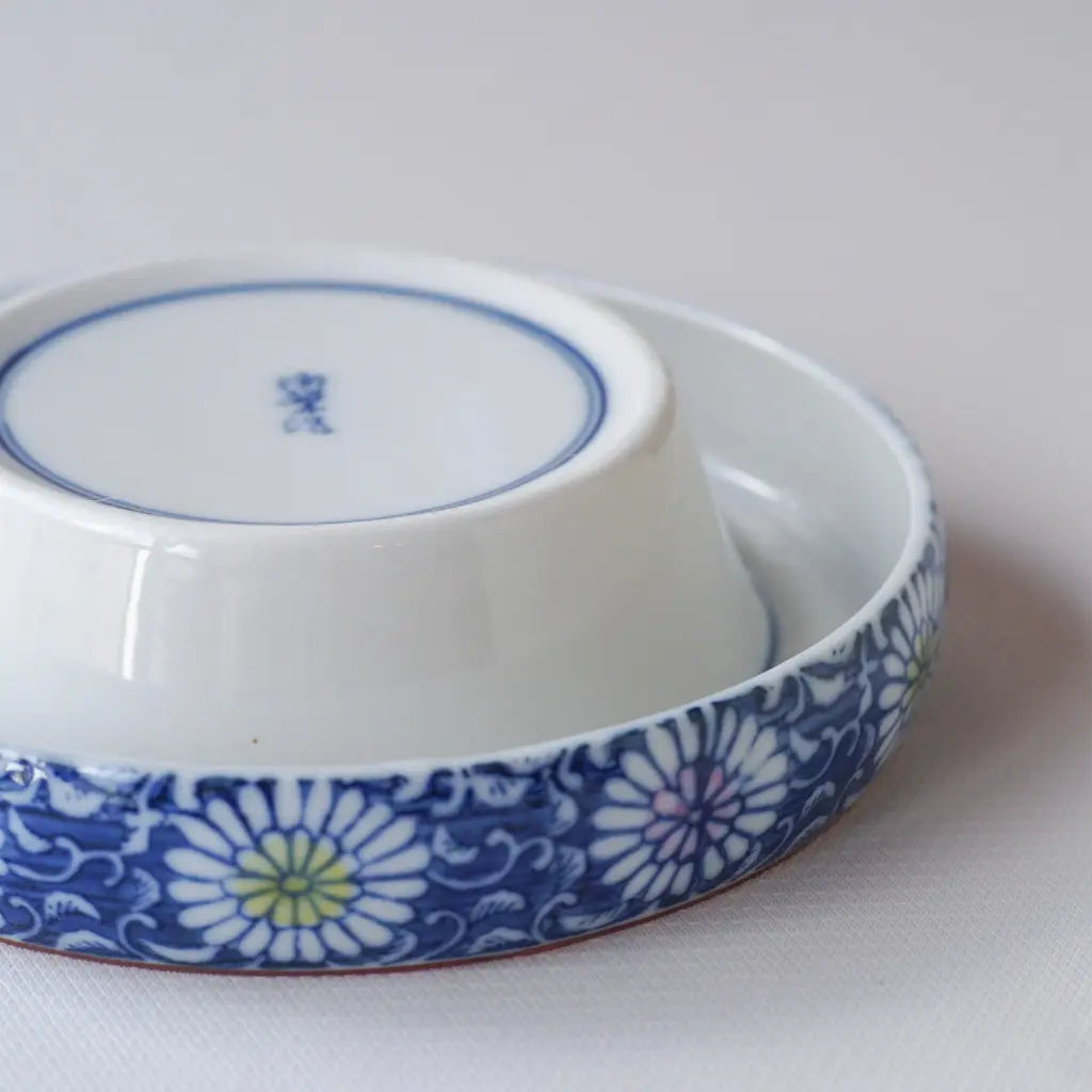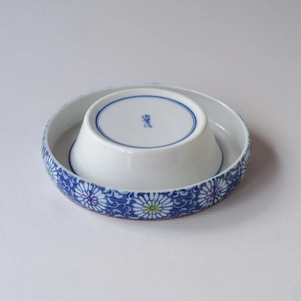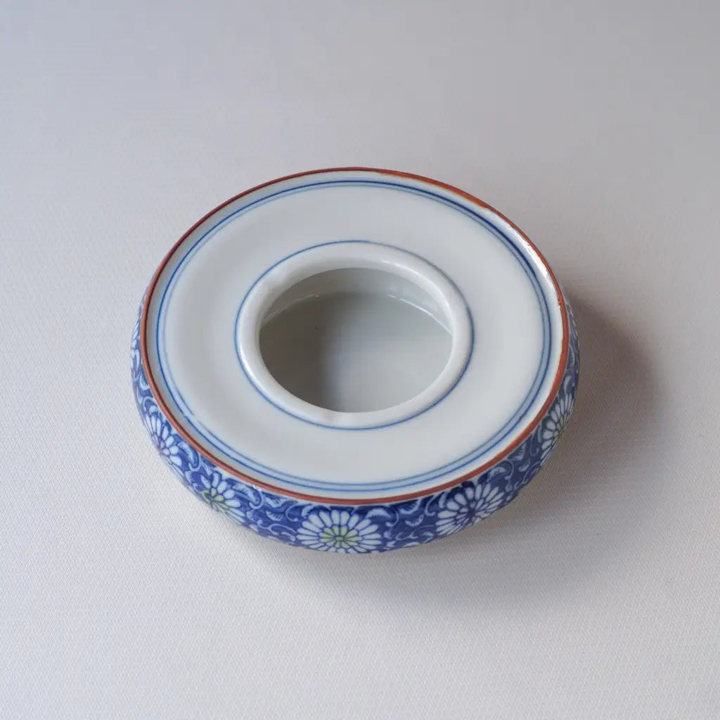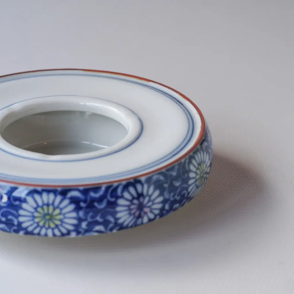 丸みを帯びた愛らしい灰皿をリメイクしたペンダントライト。落ち着いた藍色で描かれた菊と唐草文様は、和の格調を感じさます。灰皿のふっくらした形状がそのままシェードの優しい曲面となり、空間に柔らかな表情を添えます。白磁の上に繊細な文様がくっきりと浮かび上がり、日本の美意識が詰まった上質な光を届けます。