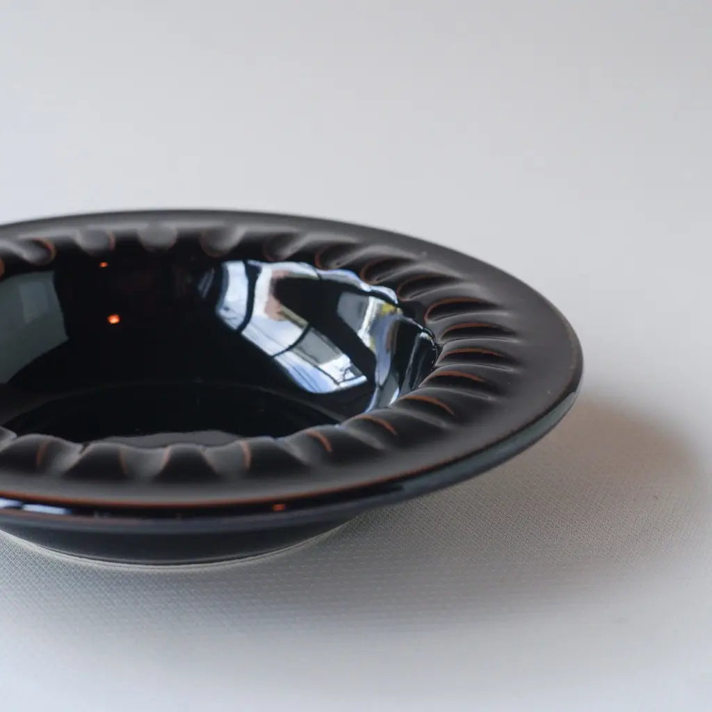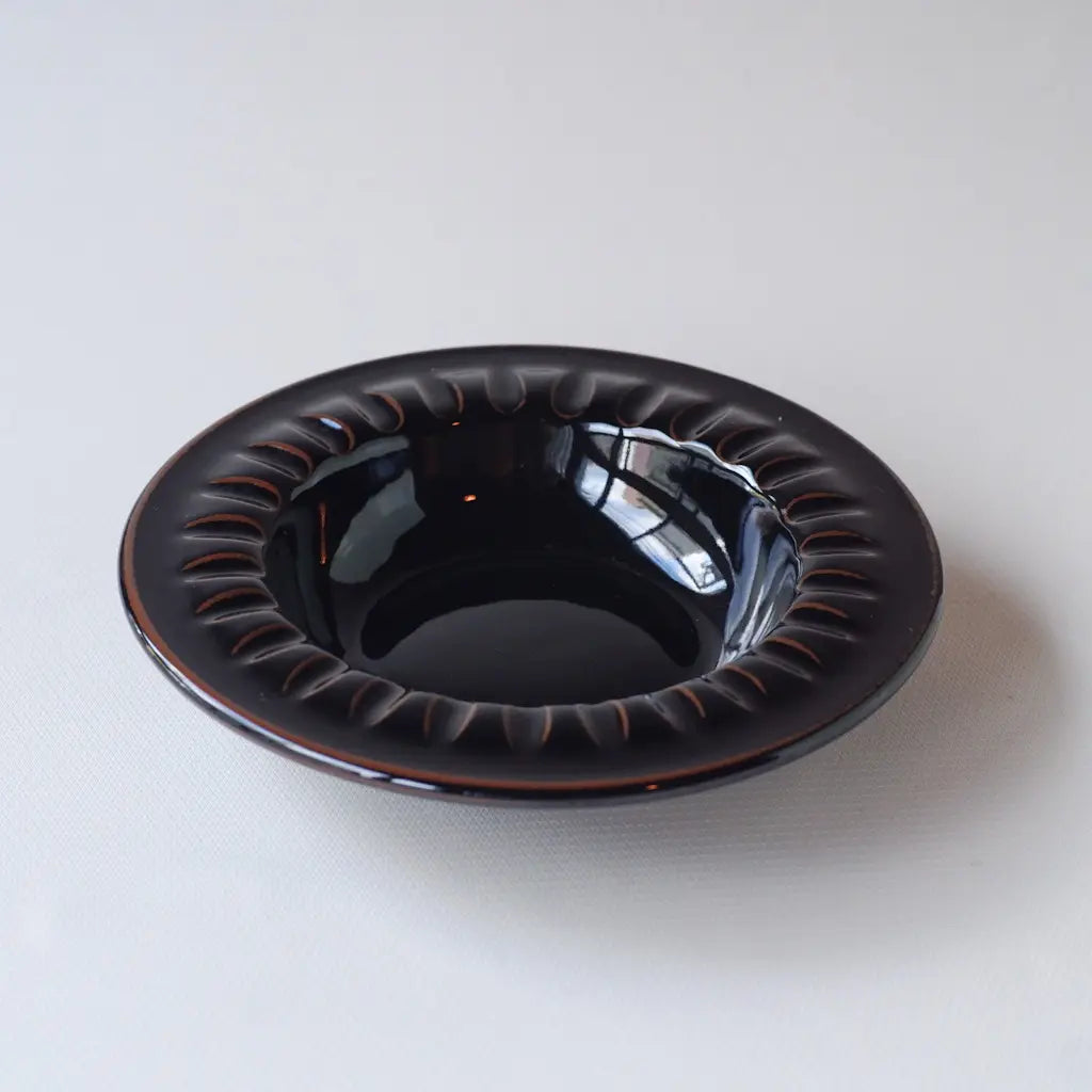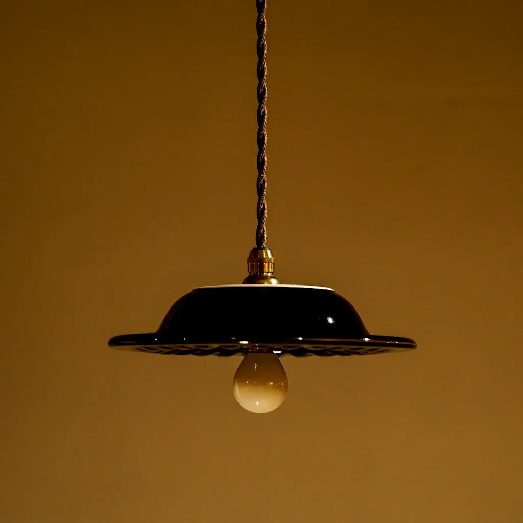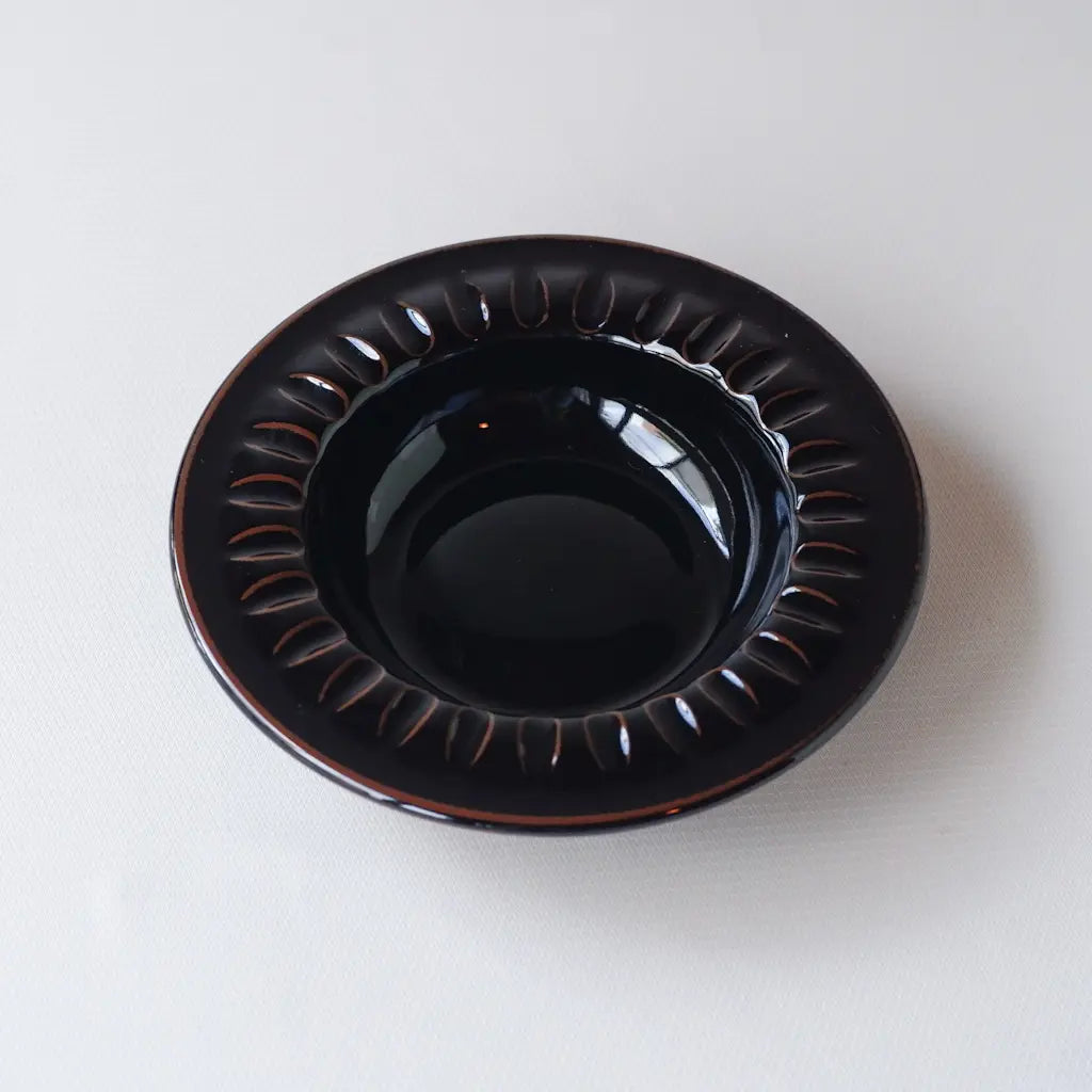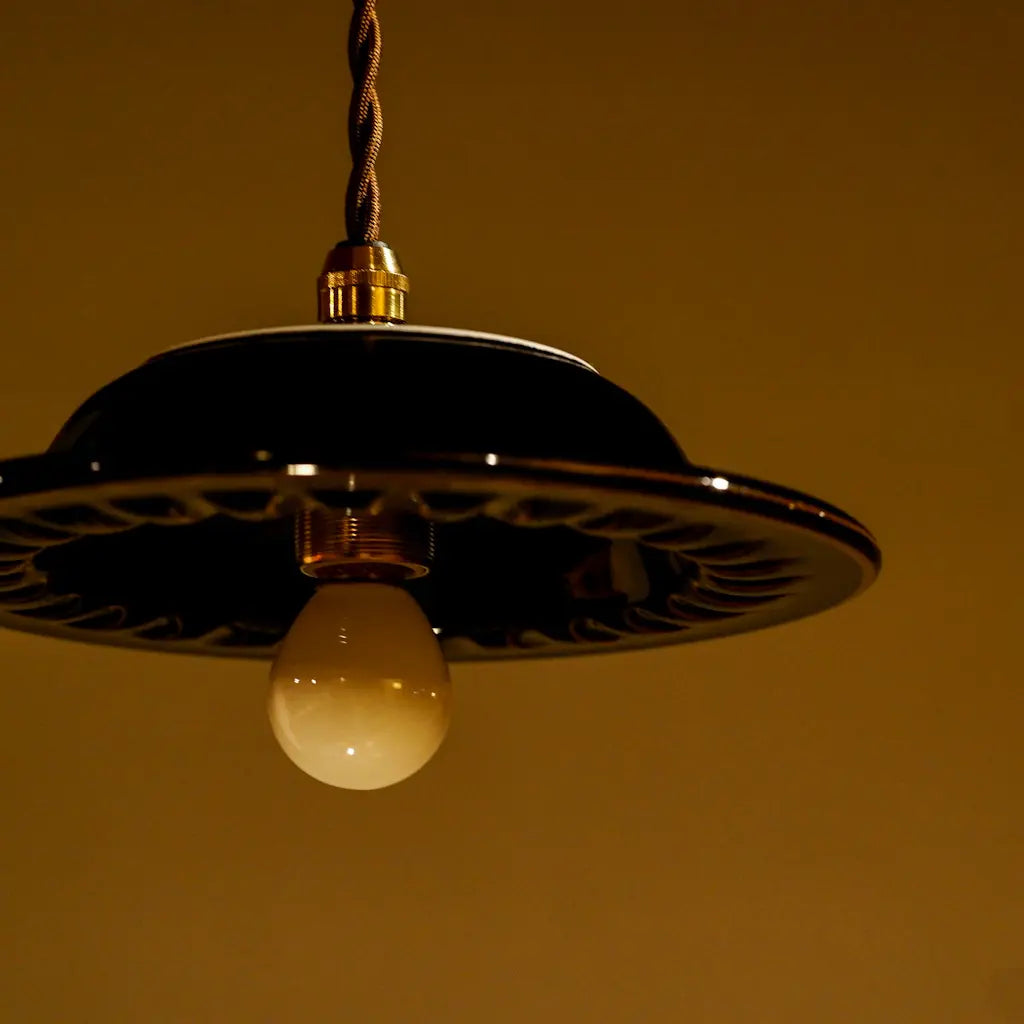 黒釉で艶やかに仕上げられた灰皿をリメイクしたペンダントライト。黒一色だからこそ際立つ、リブ形状(凹凸)。シンプルな造形は、光を受けたときに陰影を生み出し、表情を作ります。黒色は日本的な静謐さとモダンさを両立。和室にも洋室にも寄り添う、研ぎ澄まされたデザインです。