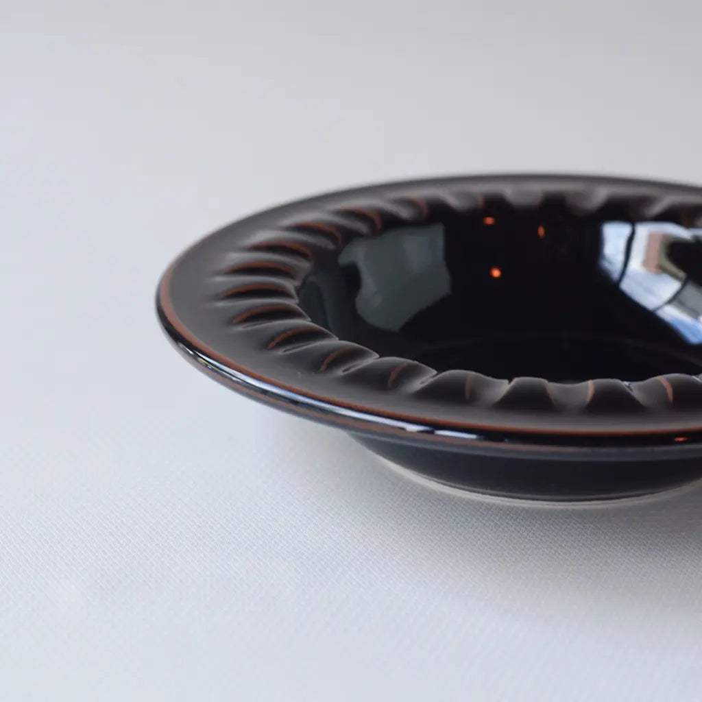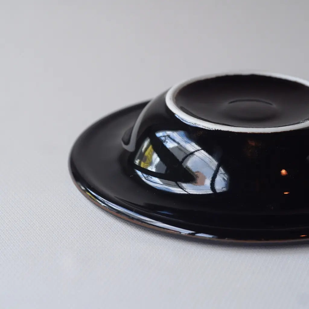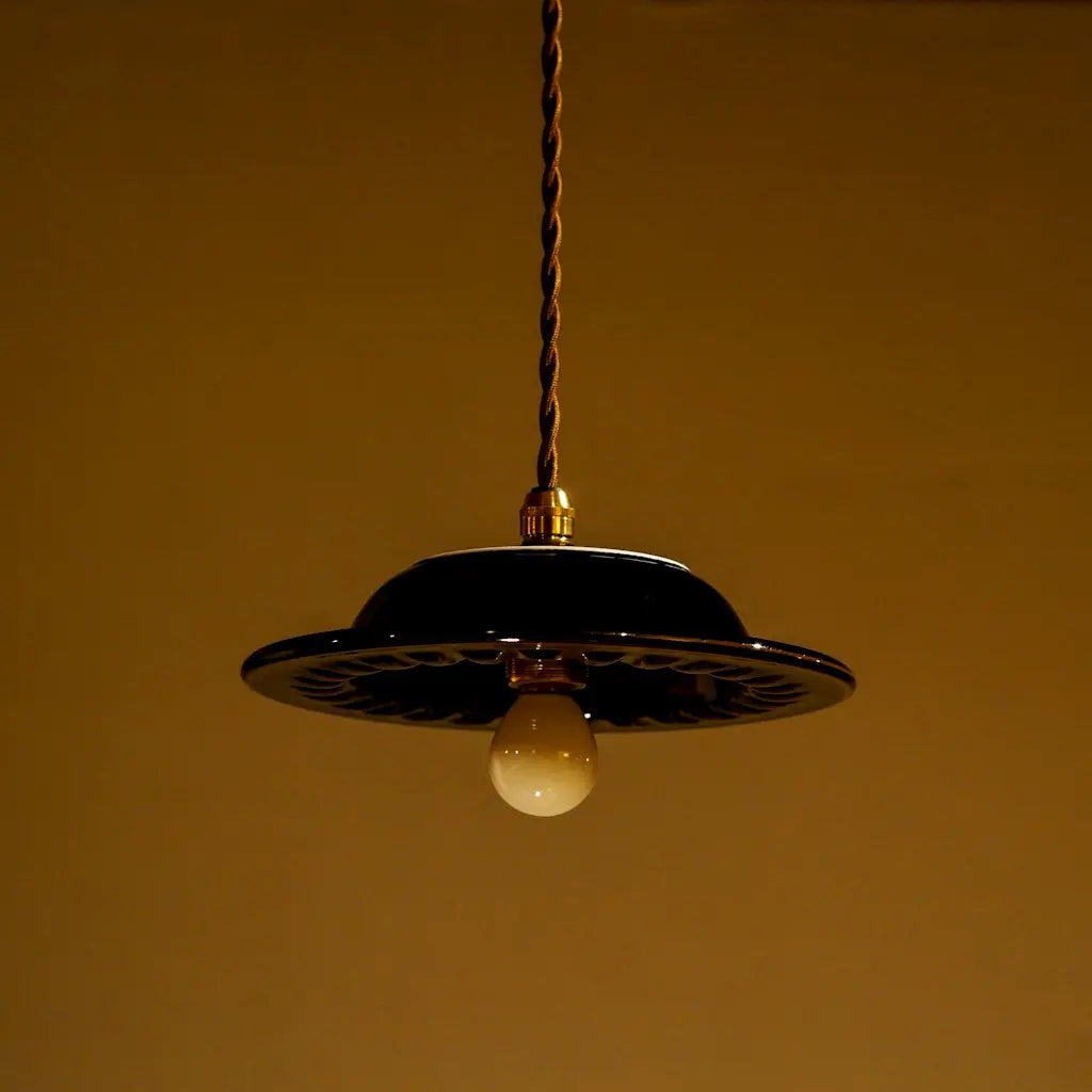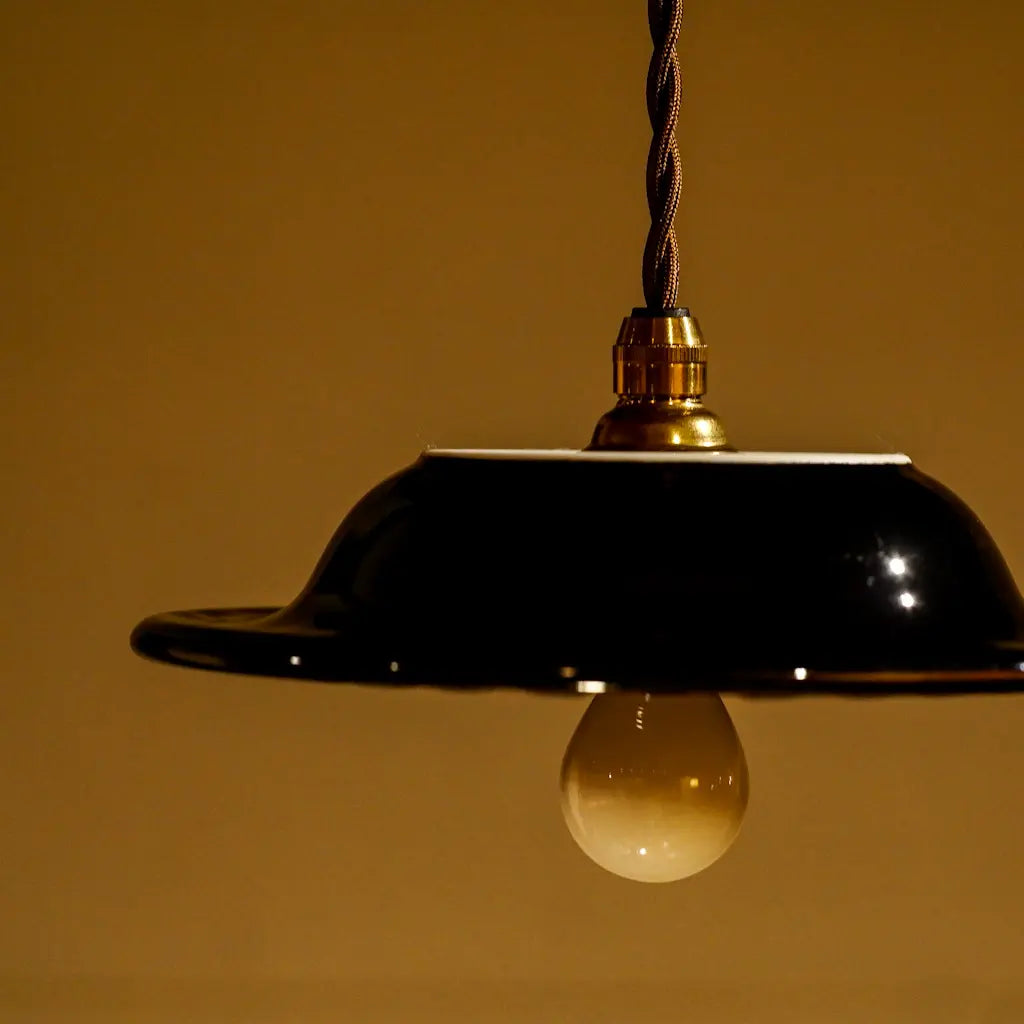 黒釉で艶やかに仕上げられた灰皿をリメイクしたペンダントライト。黒一色だからこそ際立つ、リブ形状(凹凸)。シンプルな造形は、光を受けたときに陰影を生み出し、表情を作ります。黒色は日本的な静謐さとモダンさを両立。和室にも洋室にも寄り添う、研ぎ澄まされたデザインです。