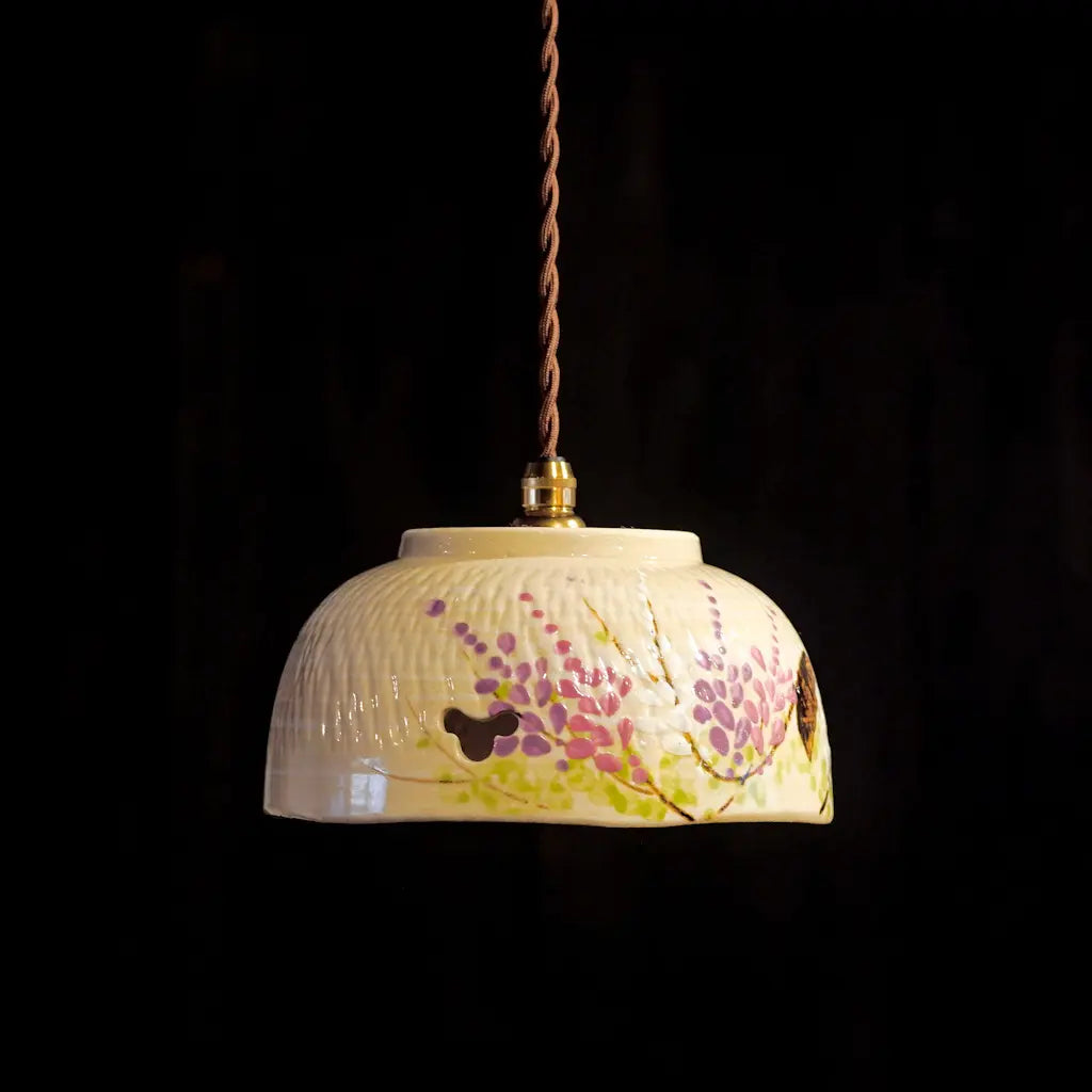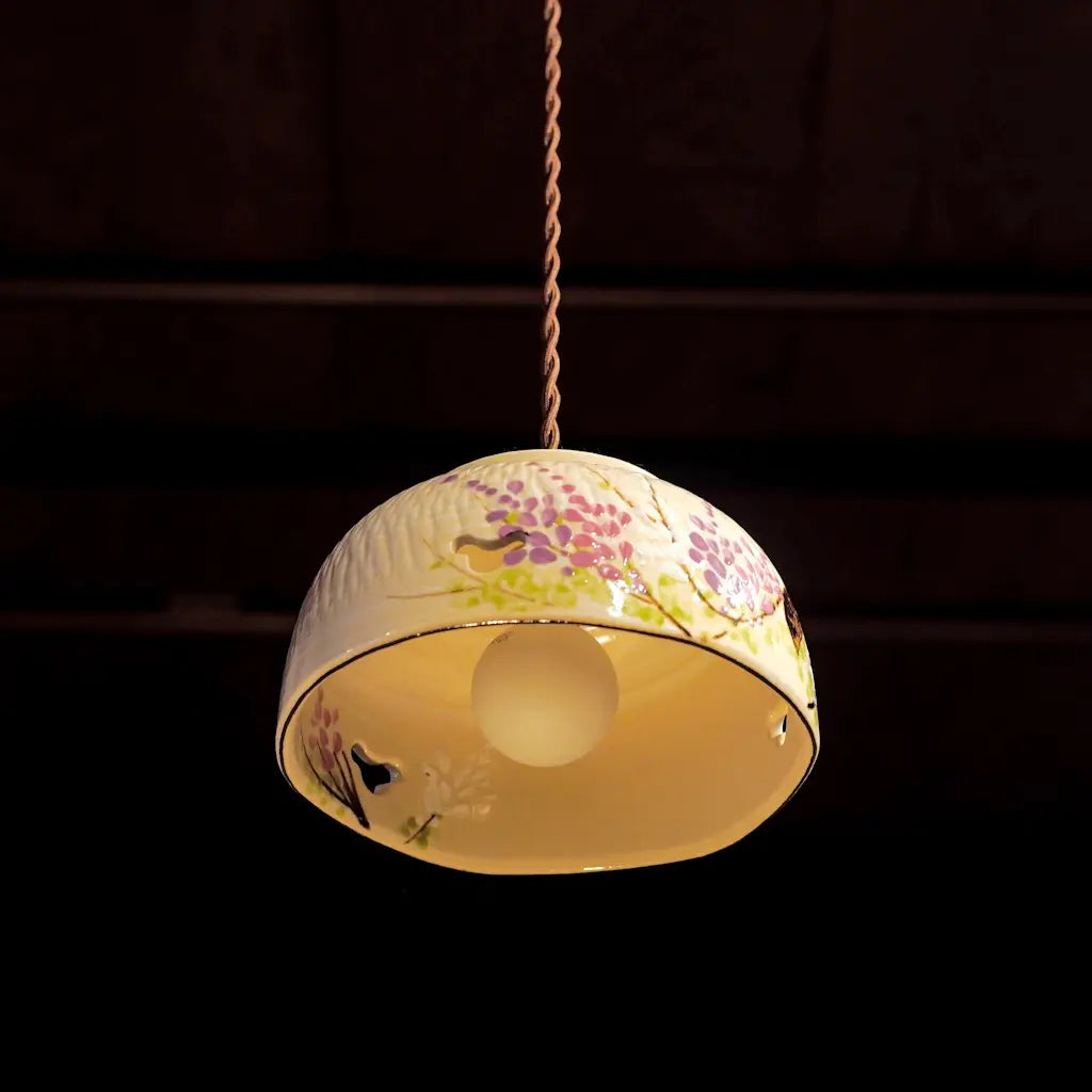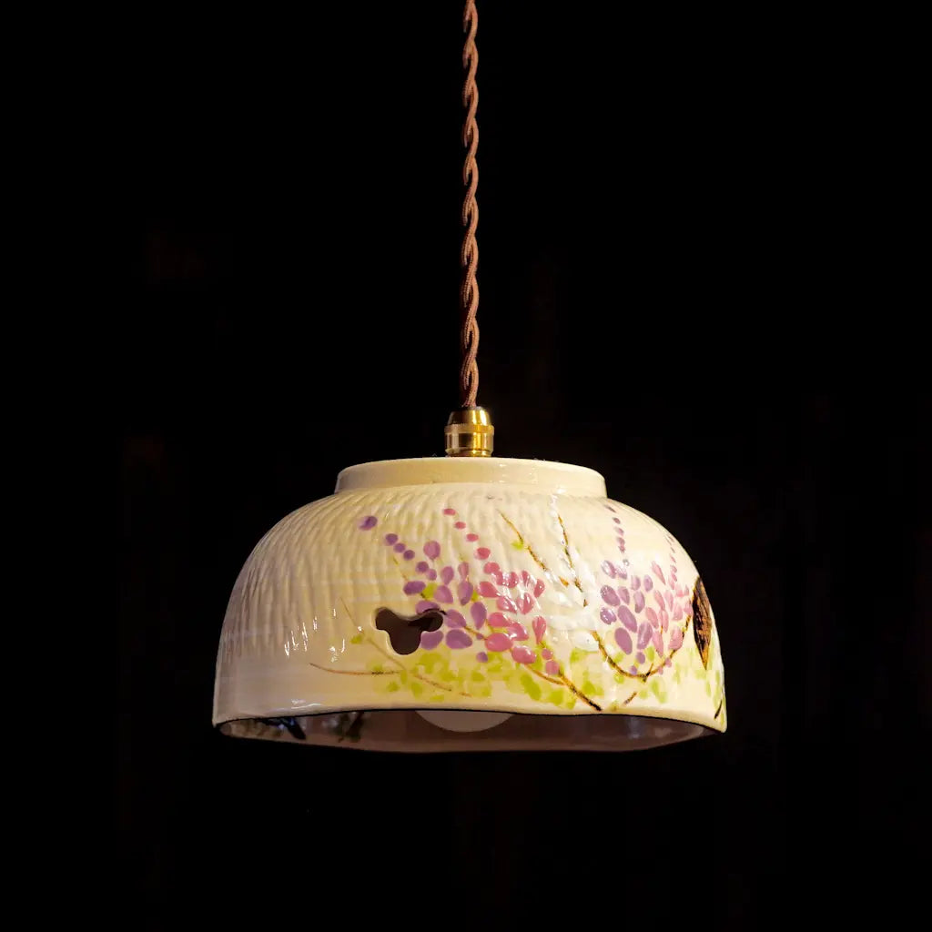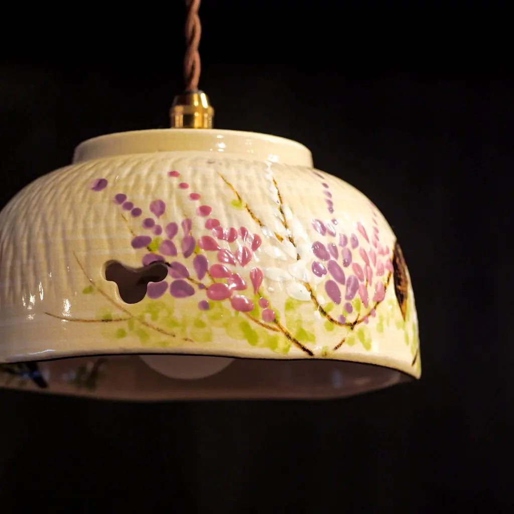 清水焼・井泉の菓子鉢をリメイクしたペンダントライト。淡いクリーム色の地に、やわらかな筆致で描かれた藤の花。愛らしい花房が、紫とピンクのグラデーションで表現されています。 一部に空けられた蝶の形にも見える小窓からは、光がふわりとこぼれ、空間に幻想的な陰影を落とします。 京焼・清水焼らしい上品さと温かさが調和した、心を安らげる一灯です。