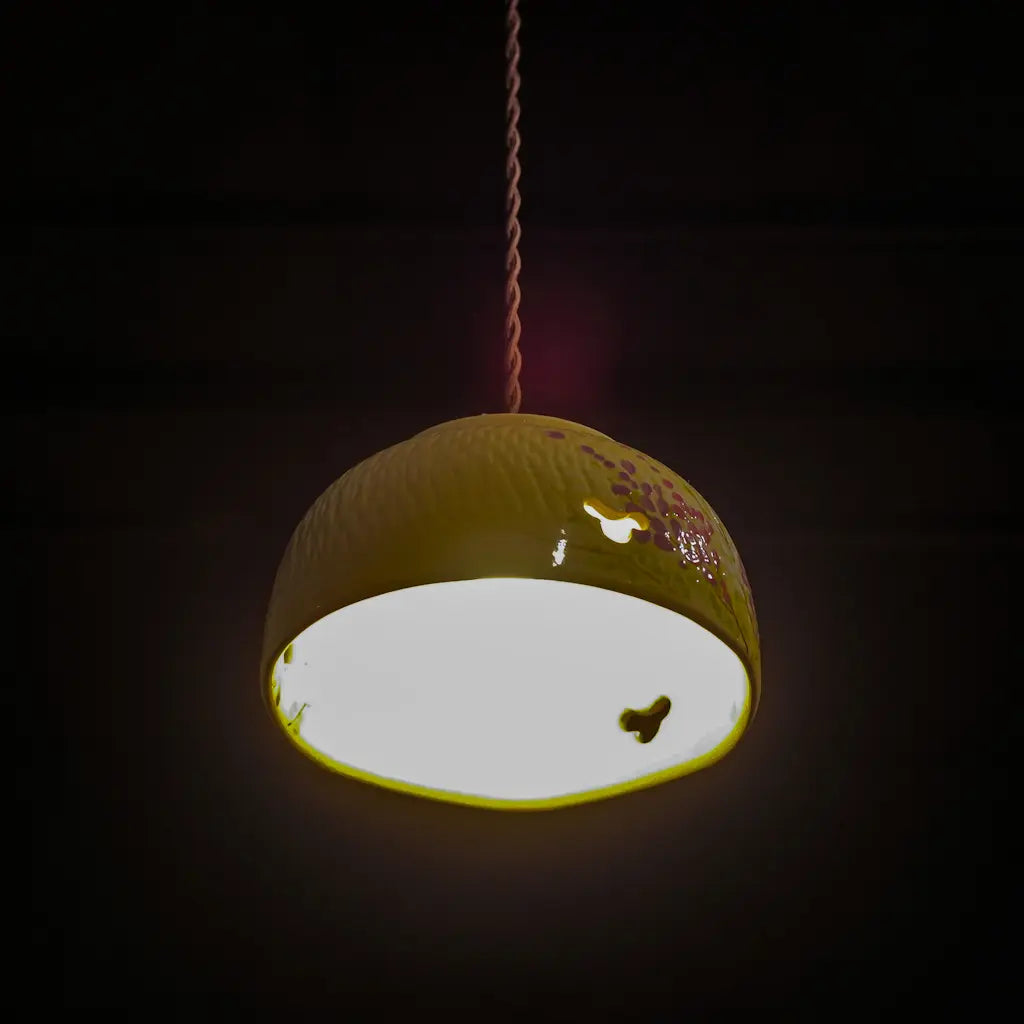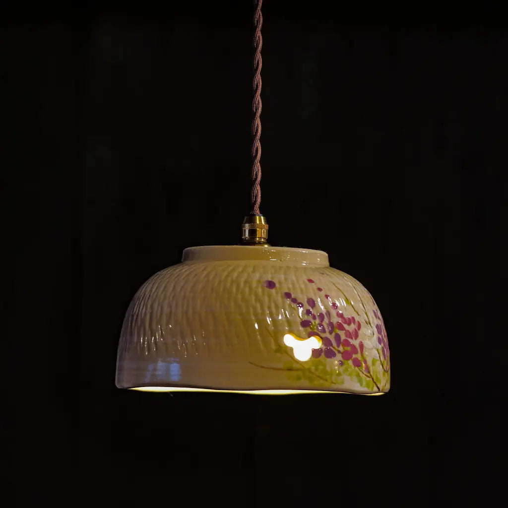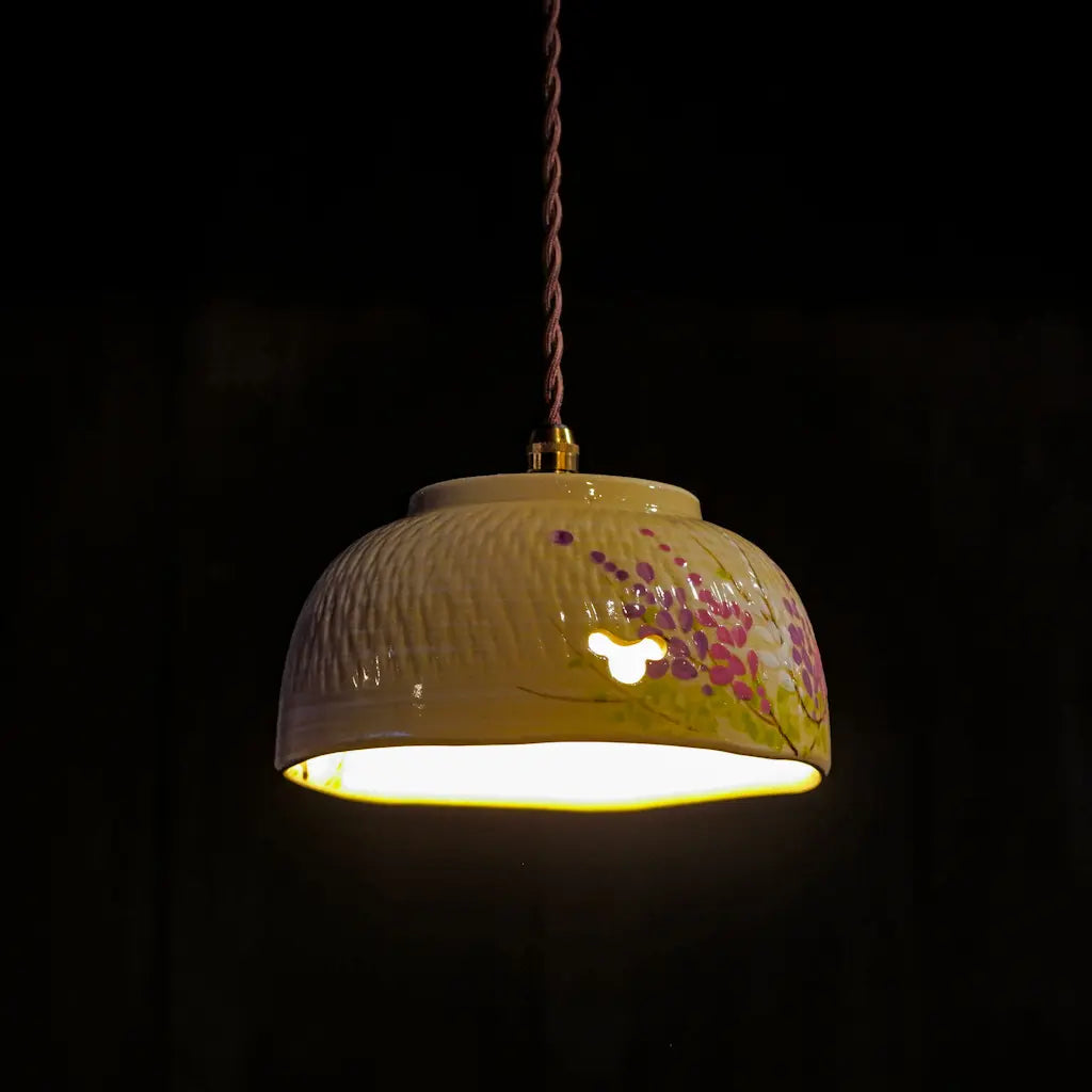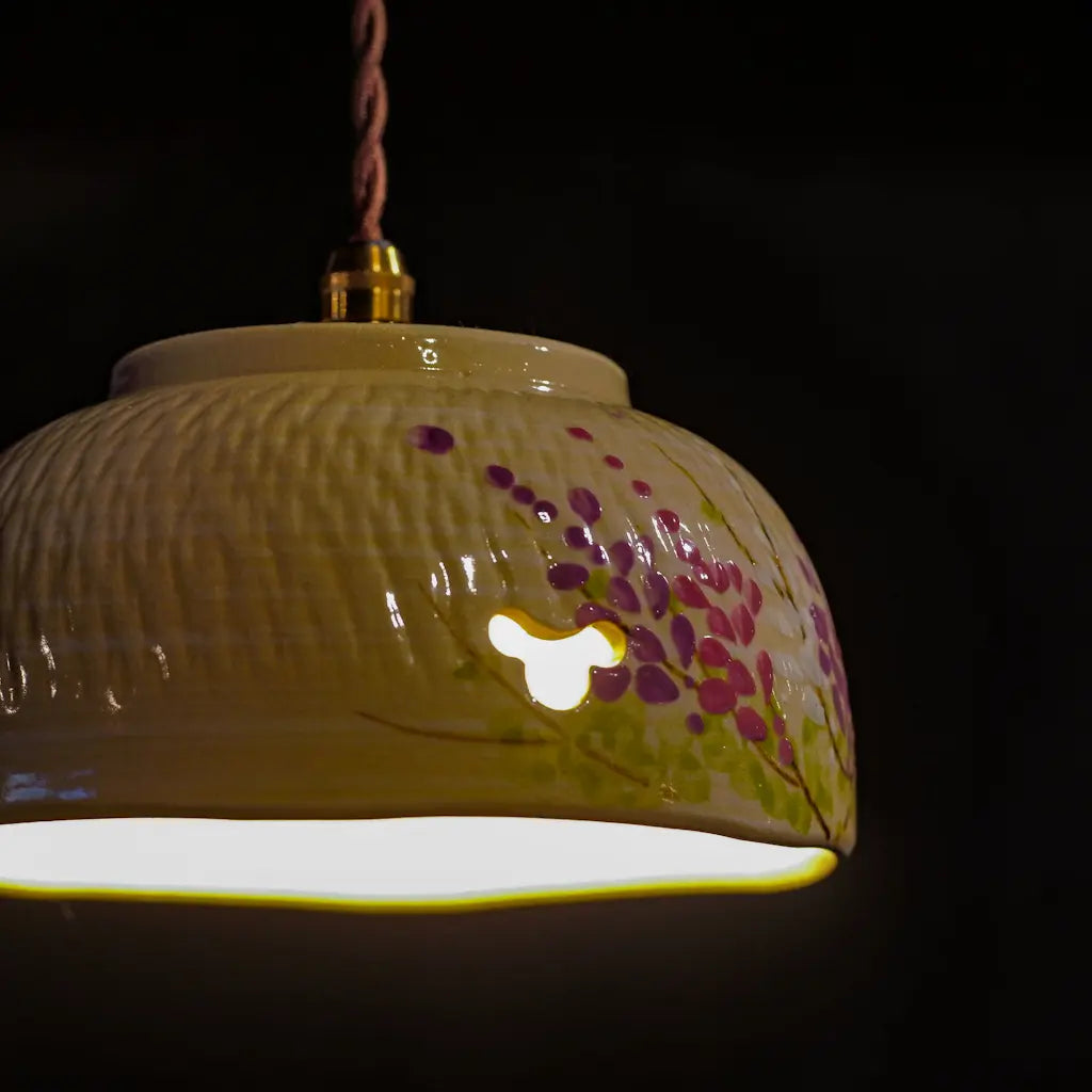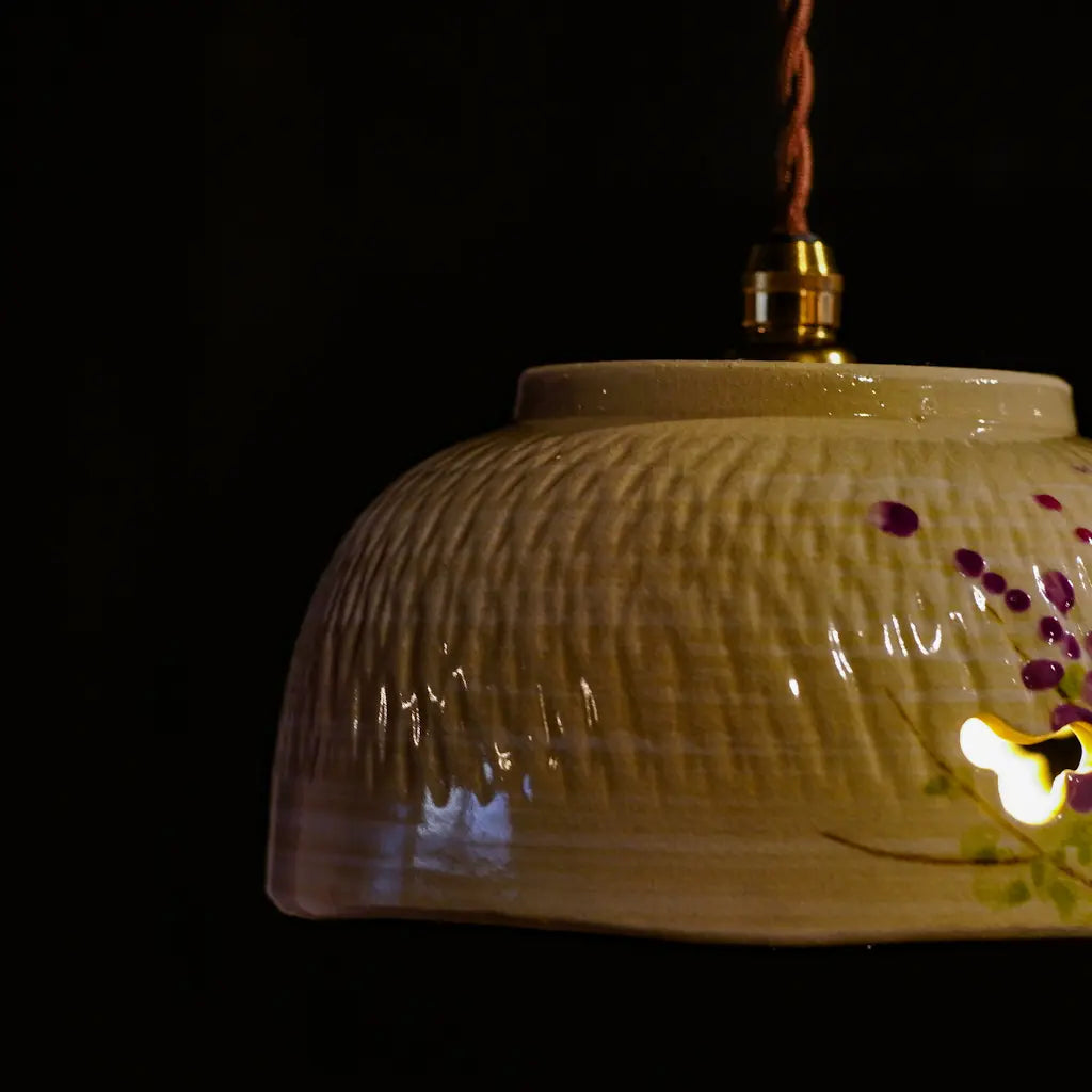 清水焼・井泉の菓子鉢をリメイクしたペンダントライト。淡いクリーム色の地に、やわらかな筆致で描かれた藤の花。愛らしい花房が、紫とピンクのグラデーションで表現されています。 一部に空けられた蝶の形にも見える小窓からは、光がふわりとこぼれ、空間に幻想的な陰影を落とします。 京焼・清水焼らしい上品さと温かさが調和した、心を安らげる一灯です。