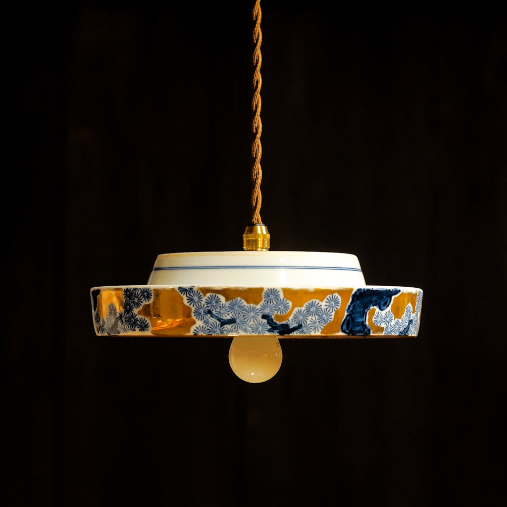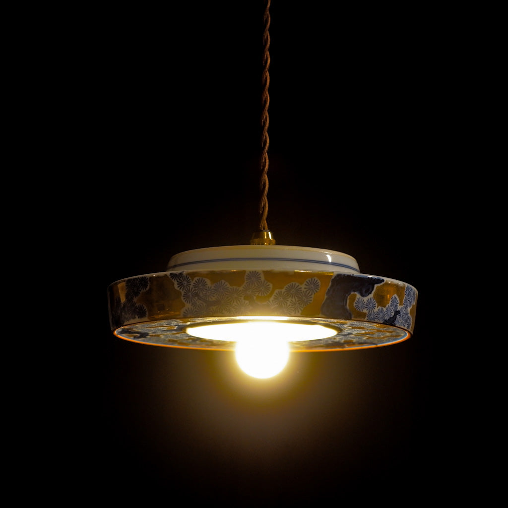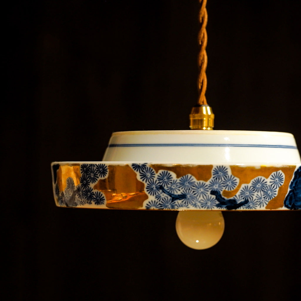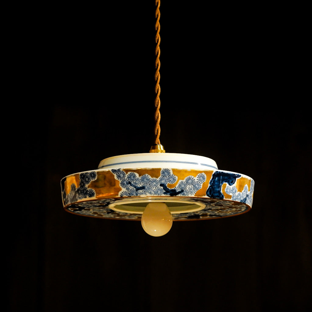 有田焼・應山作(おうざんさく)の灰皿をリメイクしたペンダントライト。鮮やかな金彩と、深く落ち着いた藍色の松葉文様が器全体を彩ります。まるで夜空に金色の星が瞬くような、格調高く華やかな意匠です。灯りをともすと、金彩が力強く輝き、白磁の柔らかな光と相まって、空間を優雅に照らします。伝統とモダンが調和した、存在感のある一灯です。