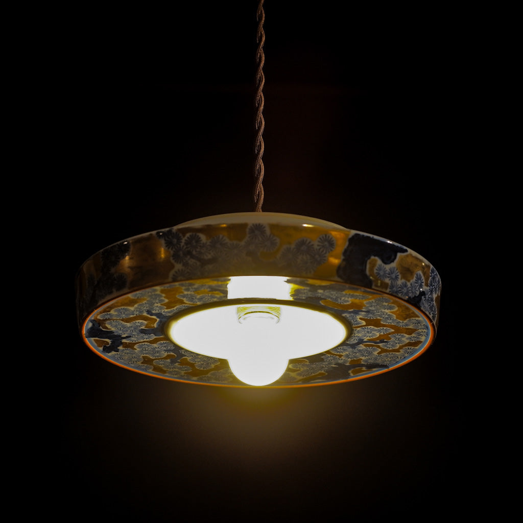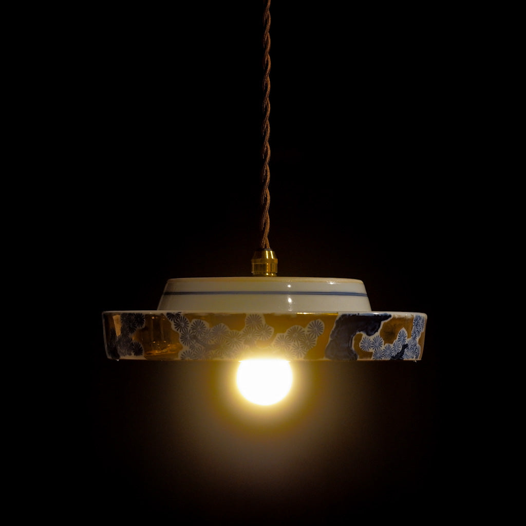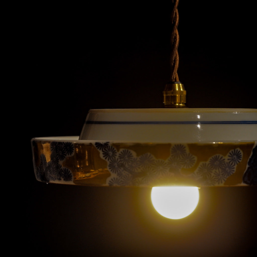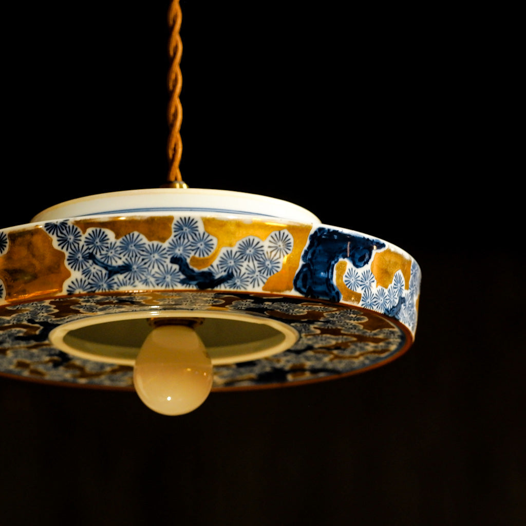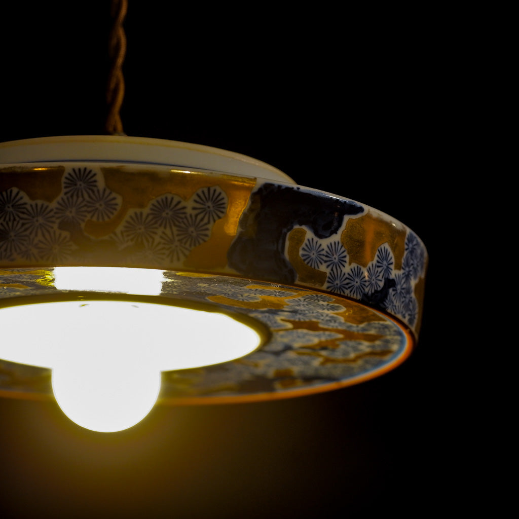 有田焼・應山作(おうざんさく)の灰皿をリメイクしたペンダントライト。鮮やかな金彩と、深く落ち着いた藍色の松葉文様が器全体を彩ります。まるで夜空に金色の星が瞬くような、格調高く華やかな意匠です。灯りをともすと、金彩が力強く輝き、白磁の柔らかな光と相まって、空間を優雅に照らします。伝統とモダンが調和した、存在感のある一灯です。