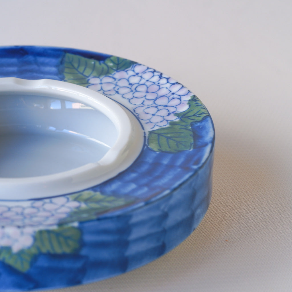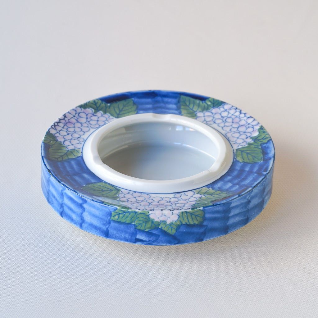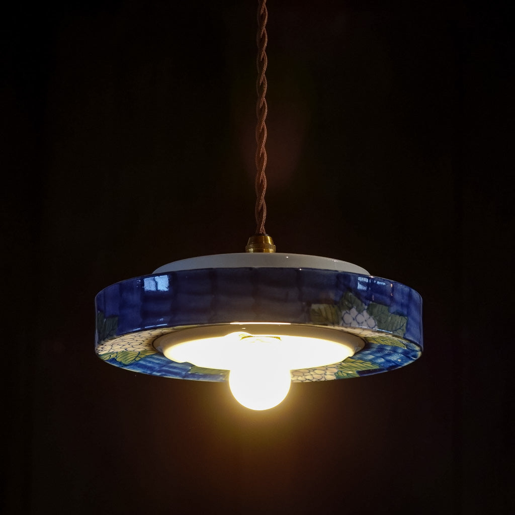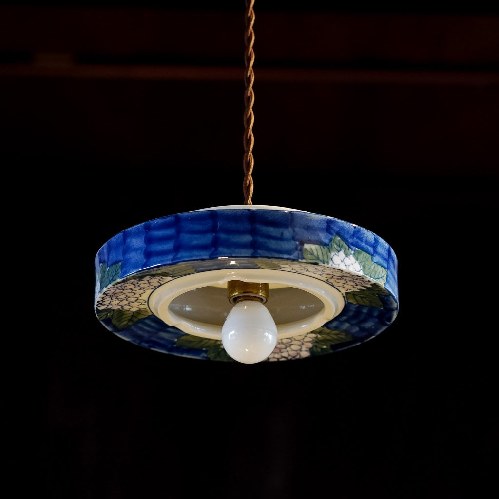 有田焼・清陶苑の灰皿をリメイクしたペンダントライト。紫陽花(あじさい)の図柄が印象的。梅雨に濡れる紫陽花のように、瑞々しく落ち着いた雰囲気を醸し出します。