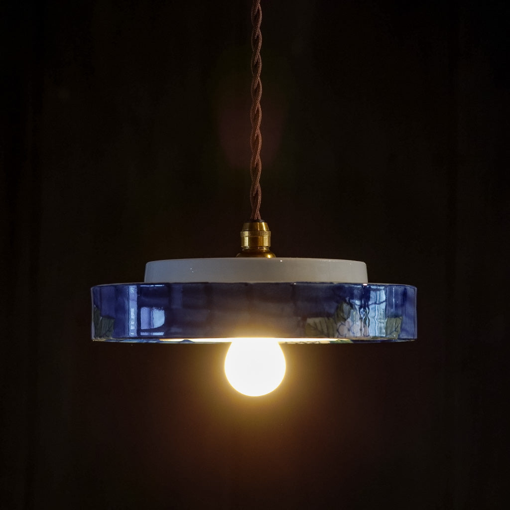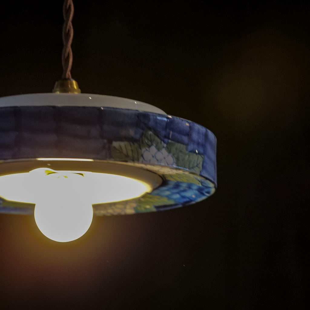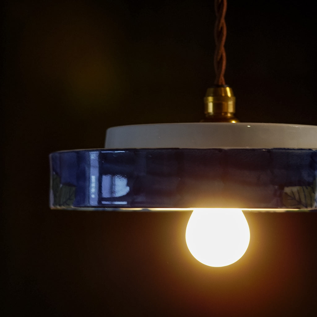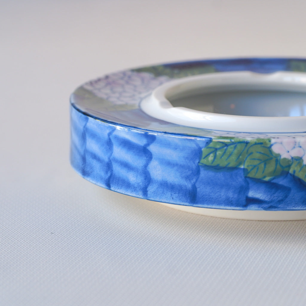 有田焼・清陶苑の灰皿をリメイクしたペンダントライト。紫陽花(あじさい)の図柄が印象的。梅雨に濡れる紫陽花のように、瑞々しく落ち着いた雰囲気を醸し出します。