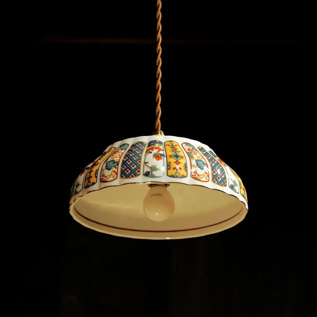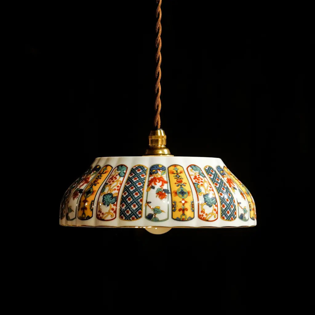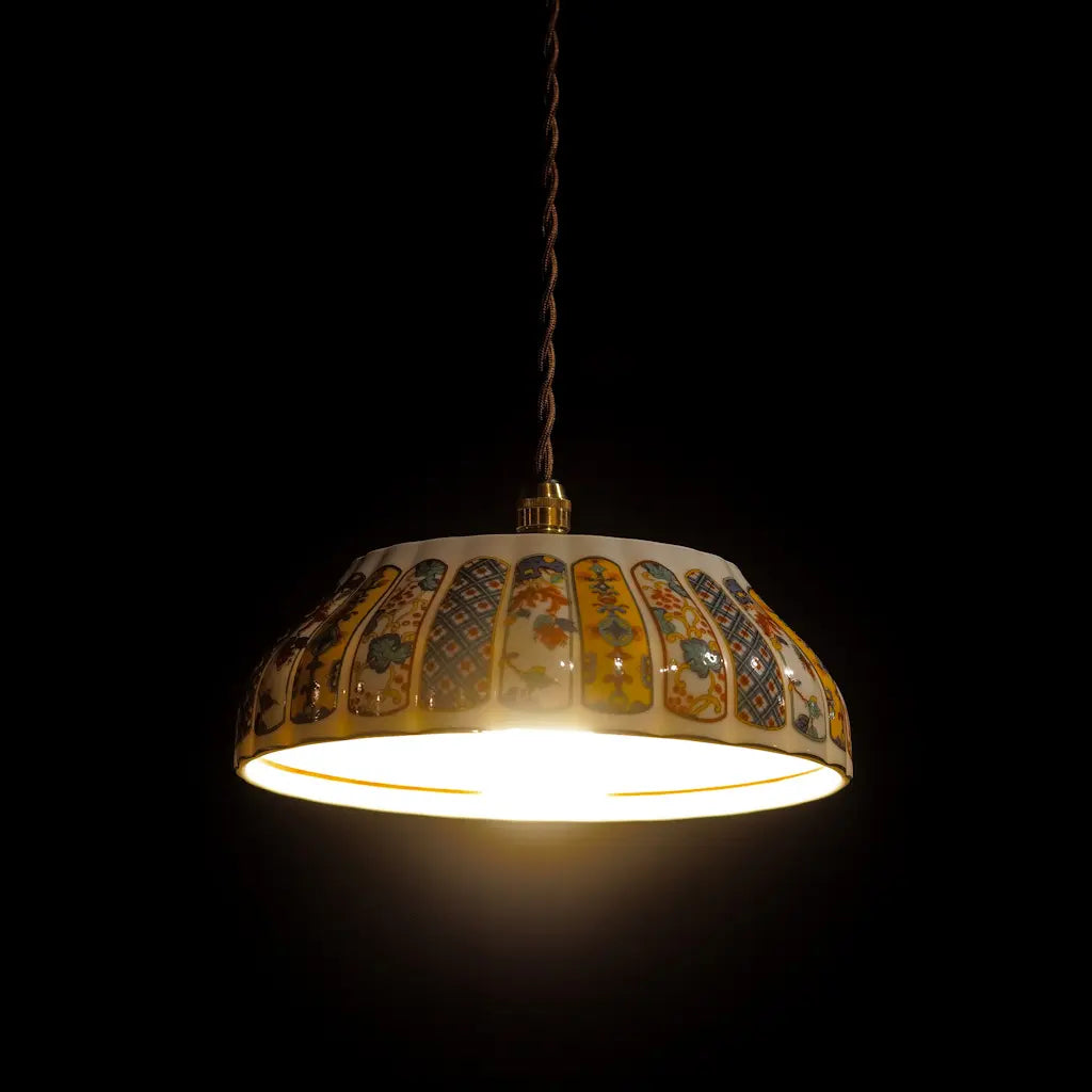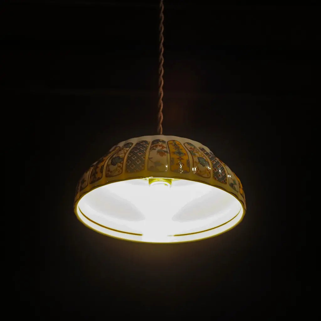 有田焼・福寿の盛り鉢をリメイクしたペンダントライト。細部にまで描き込まれた鮮やかな錦絵の文様が、光を受けて一段と華やかに輝きます。大ぶりで存在感があり、食卓やリビングを彩るメインのあかりとして最適です。和の格調と、モダンな色彩が融合した、心躍る一灯です。