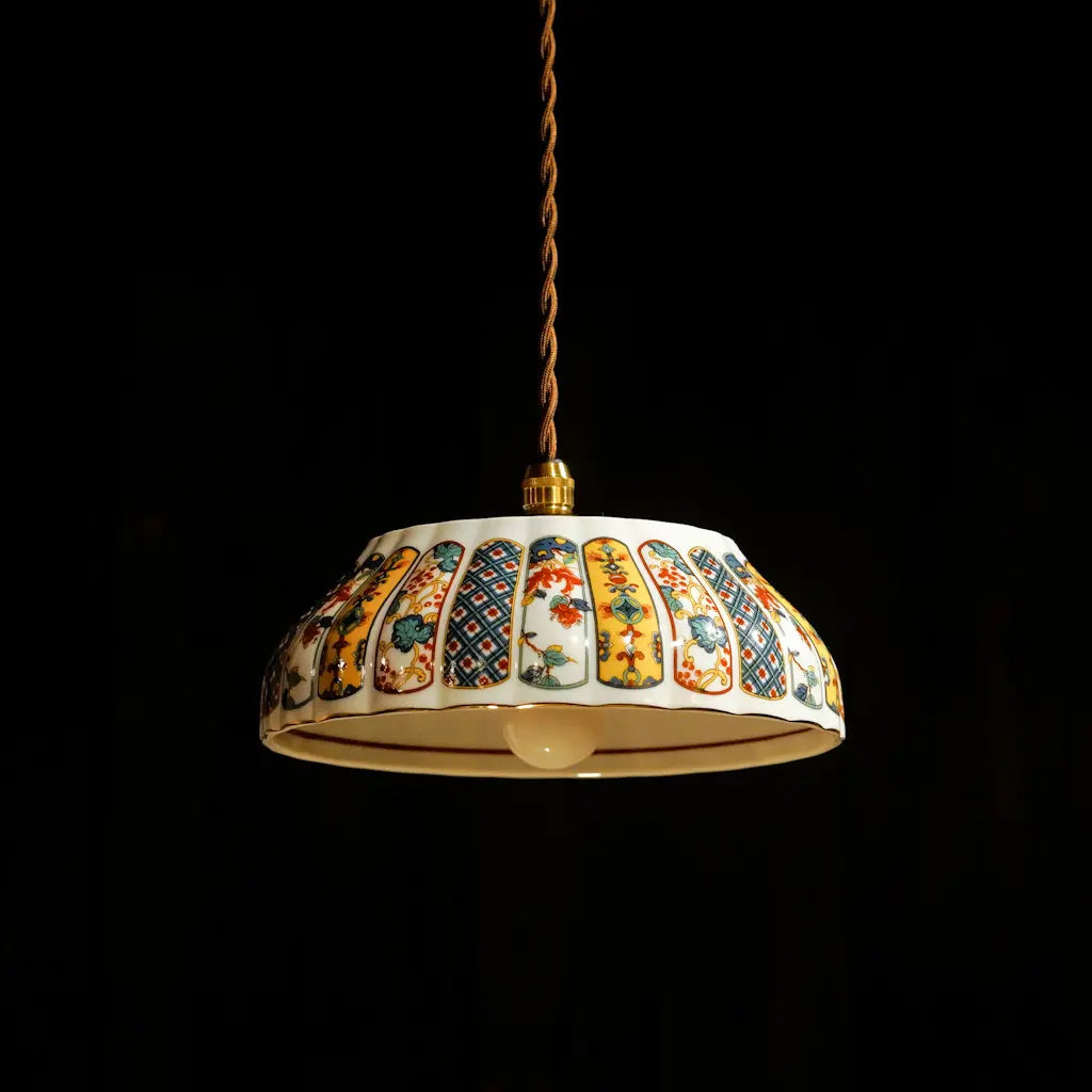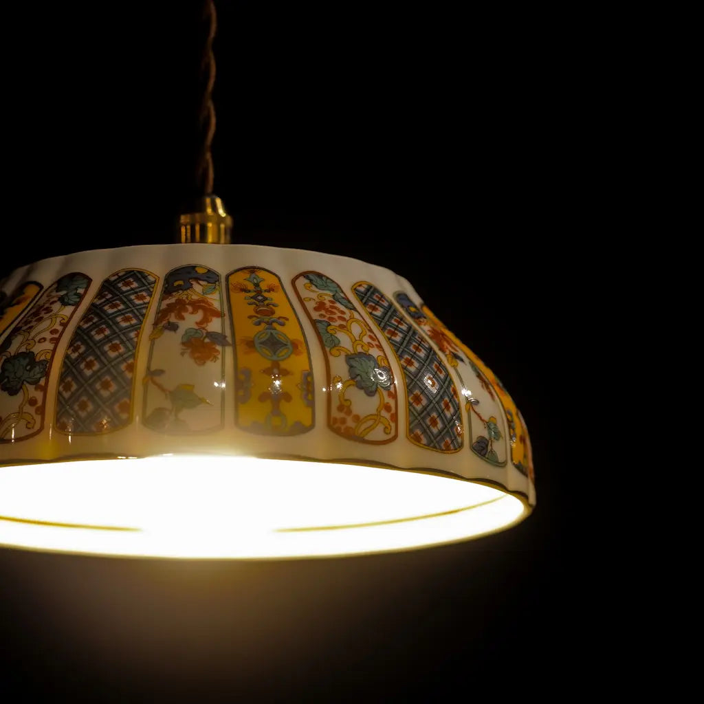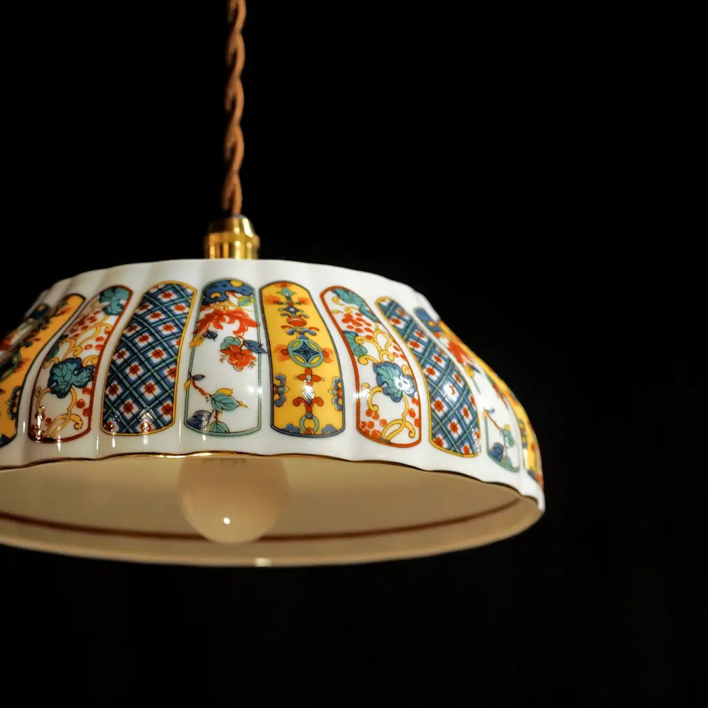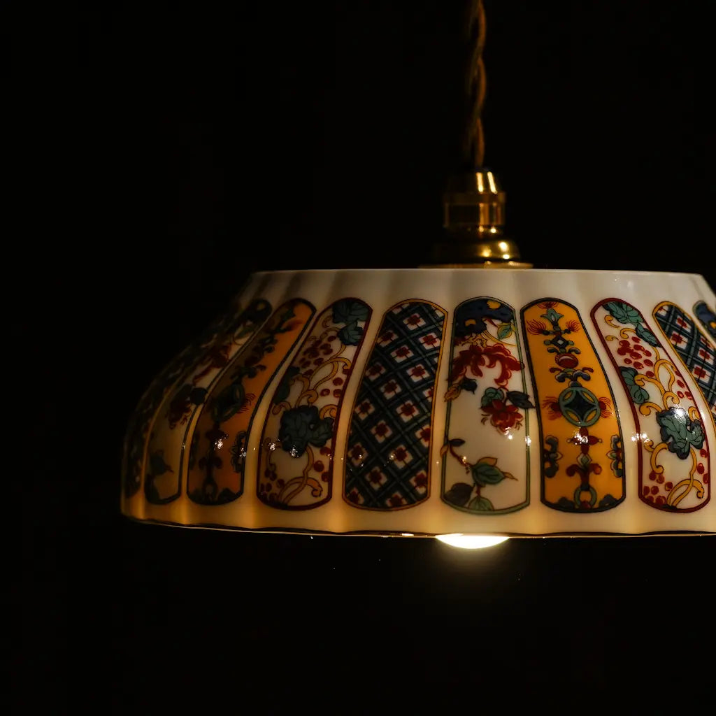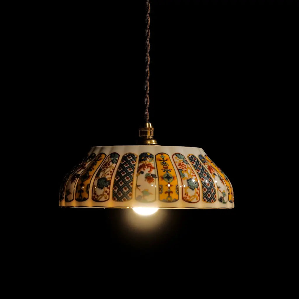 有田焼・福寿の盛り鉢をリメイクしたペンダントライト。細部にまで描き込まれた鮮やかな錦絵の文様が、光を受けて一段と華やかに輝きます。大ぶりで存在感があり、食卓やリビングを彩るメインのあかりとして最適です。和の格調と、モダンな色彩が融合した、心躍る一灯です。