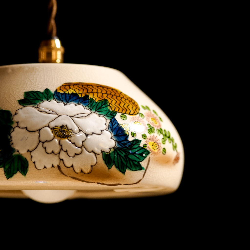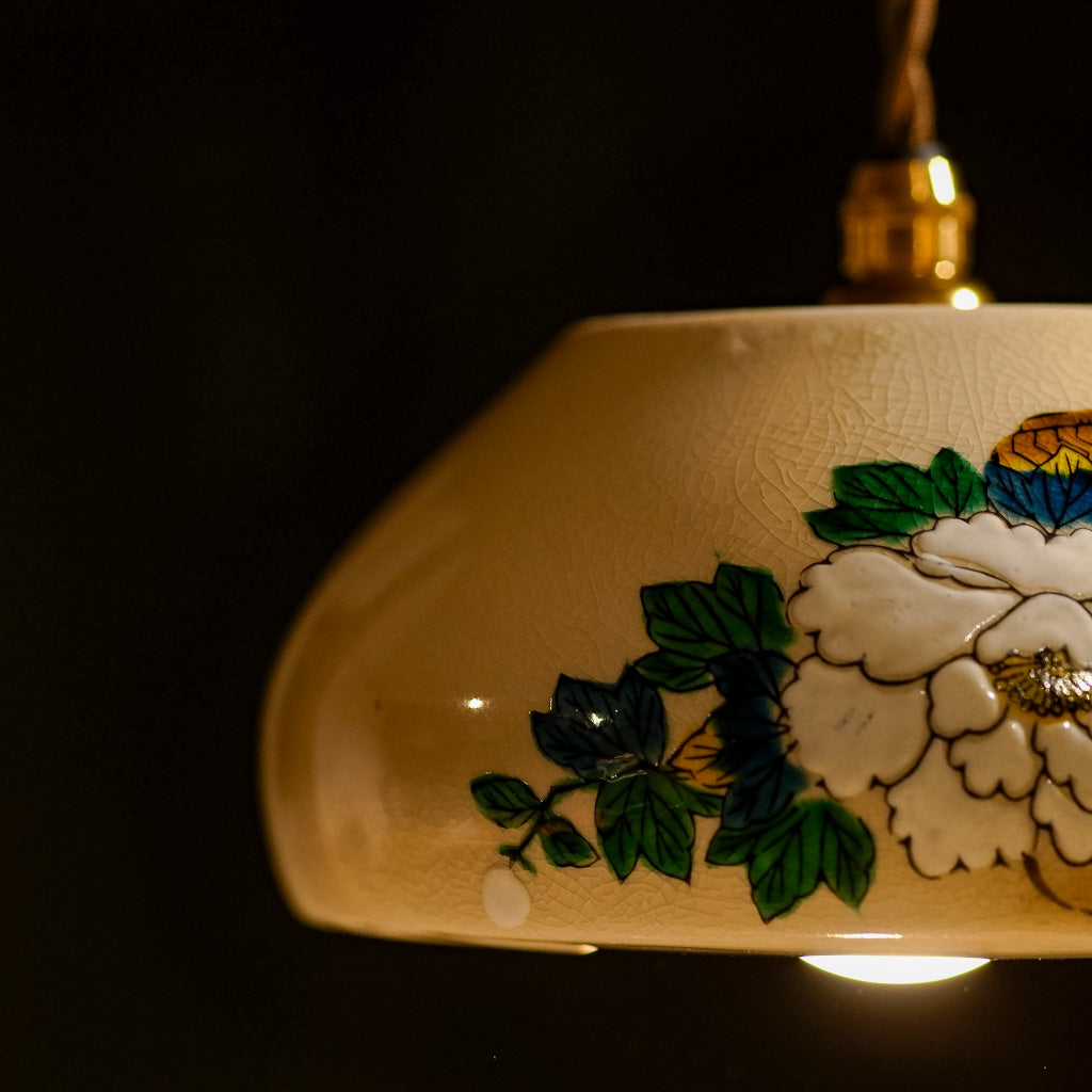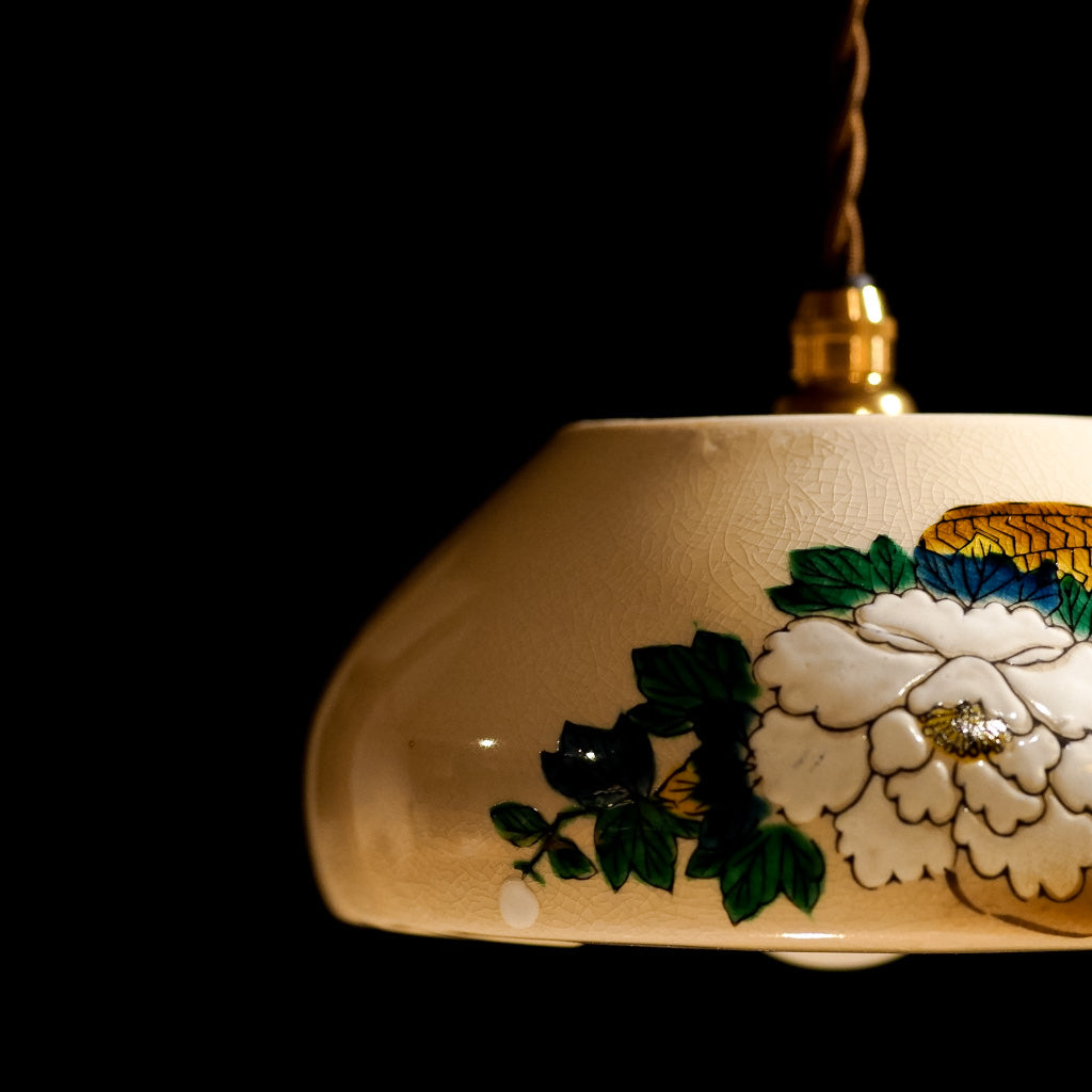 九谷焼ならではの発色で描かれた、菊の大輪が印象的な器を、ペンダントライトへと仕立てました。
