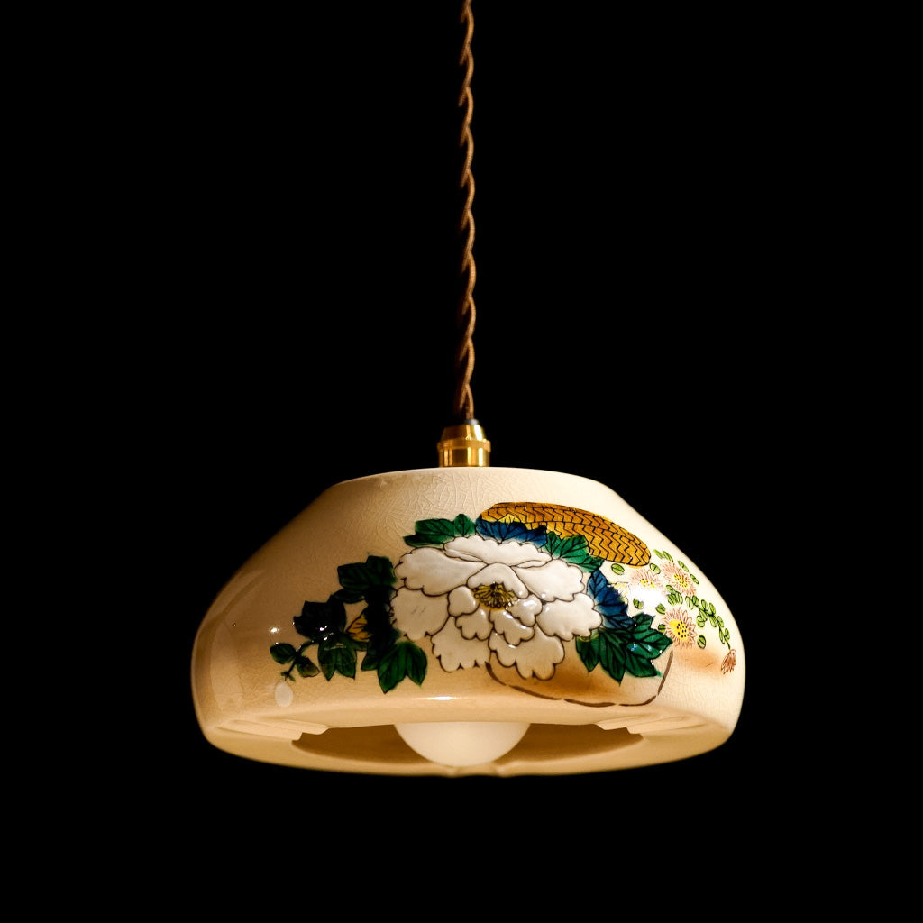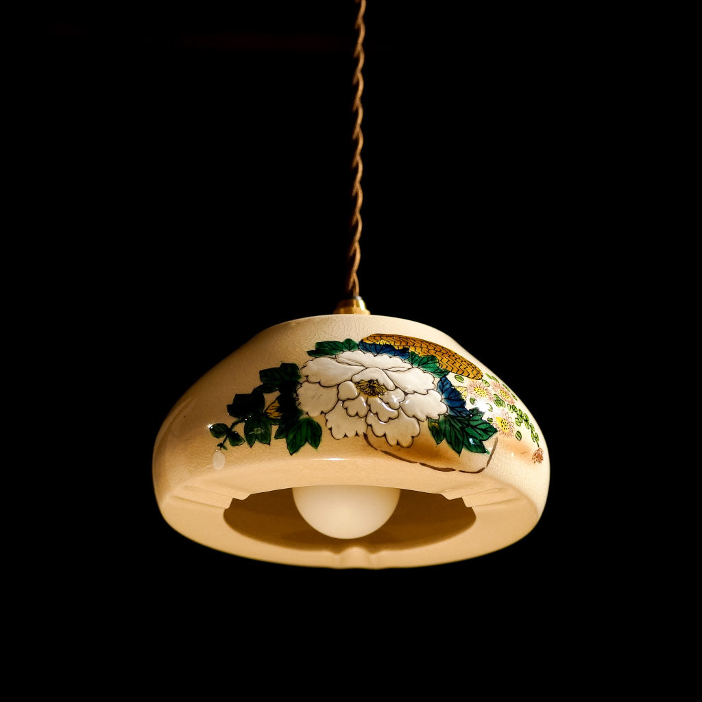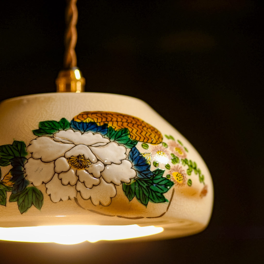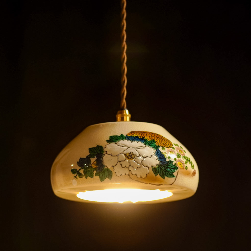 九谷焼ならではの発色で描かれた、菊の大輪が印象的な器を、ペンダントライトへと仕立てました。