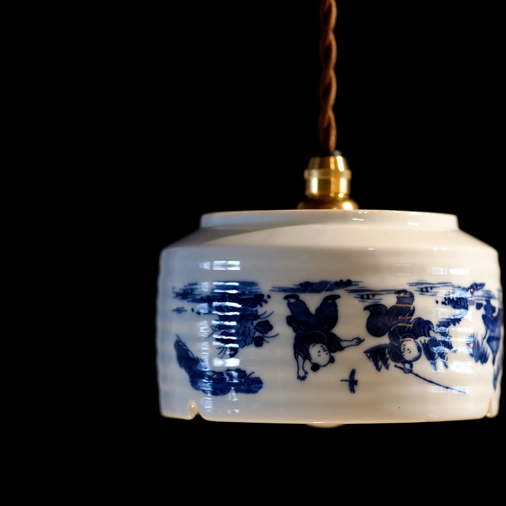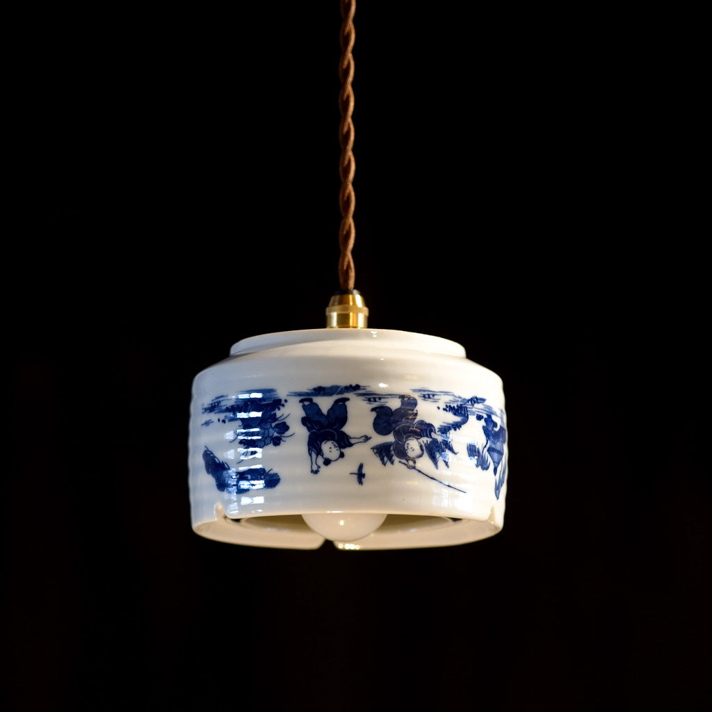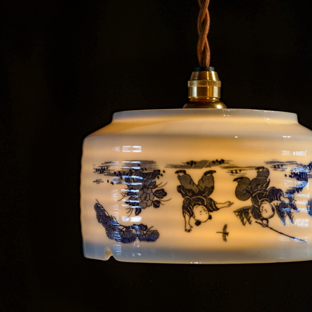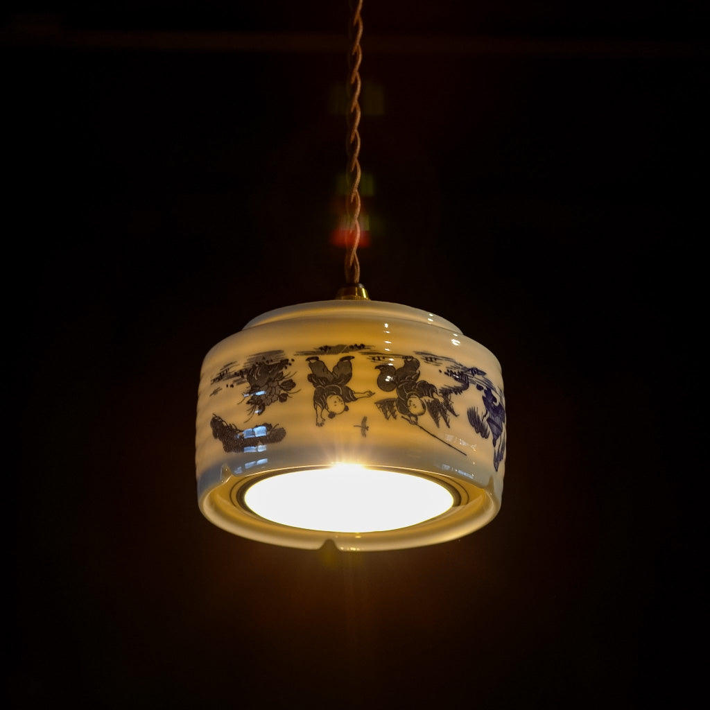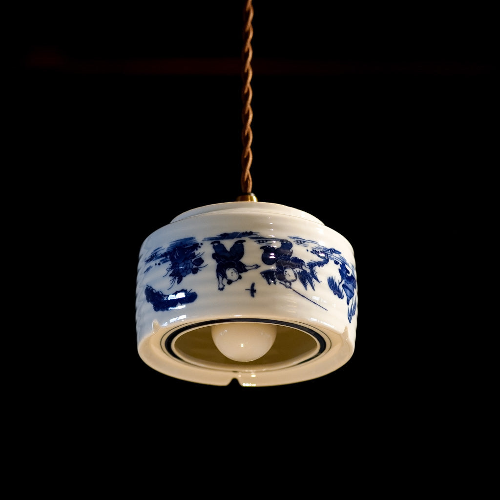 愛らしい唐子文様が描かれた白磁の灰皿を、ペンダントライトへとリメイク。