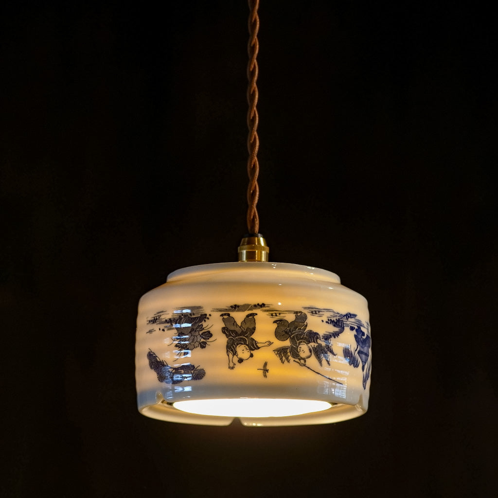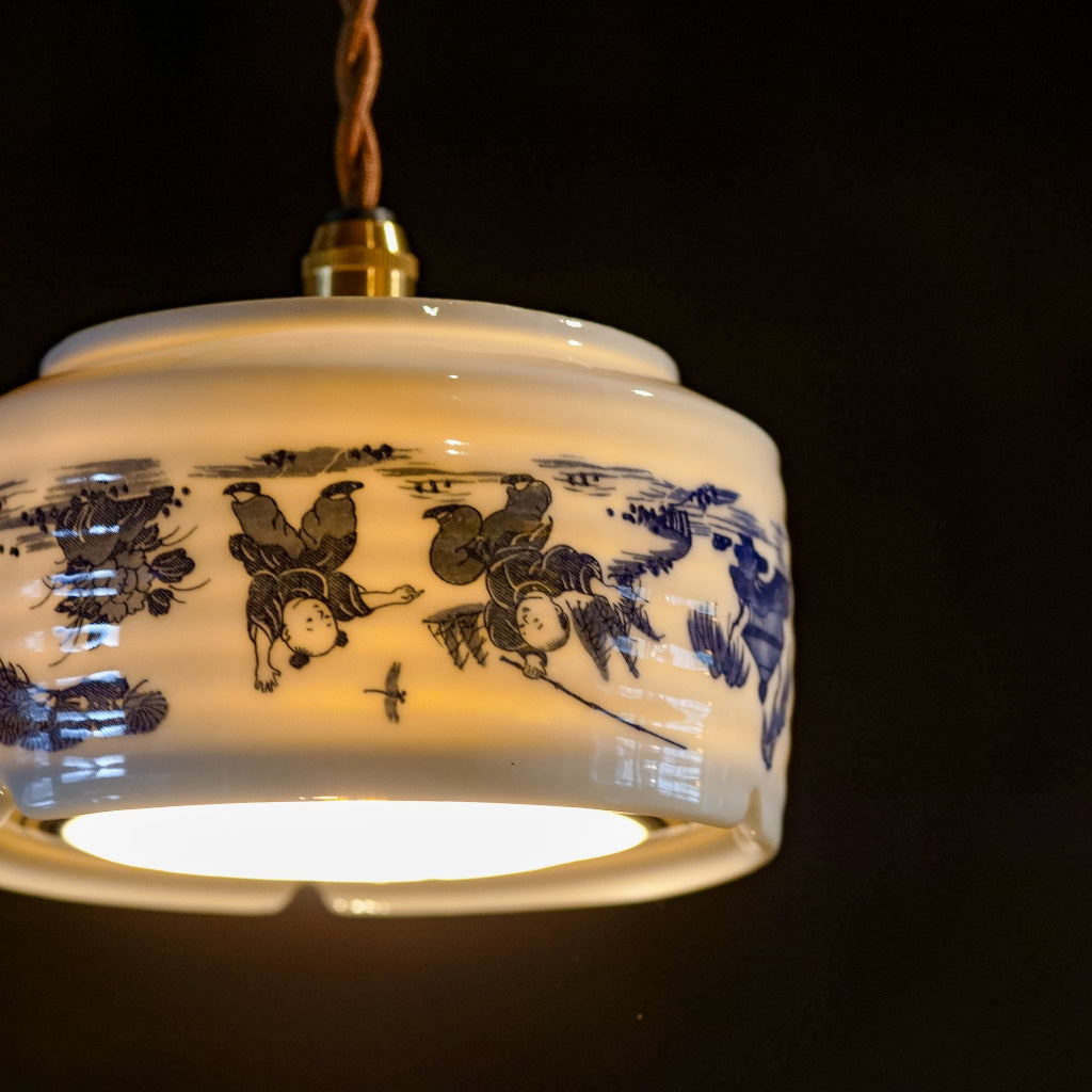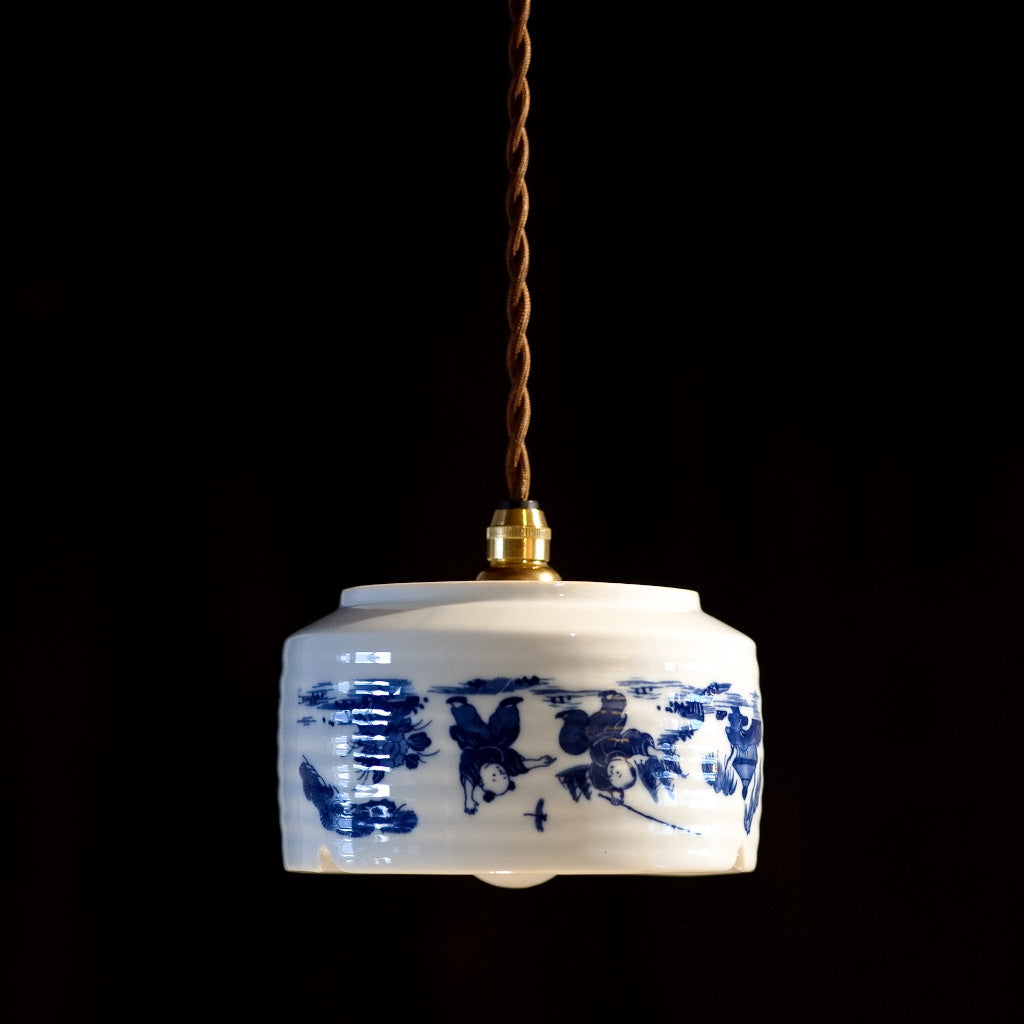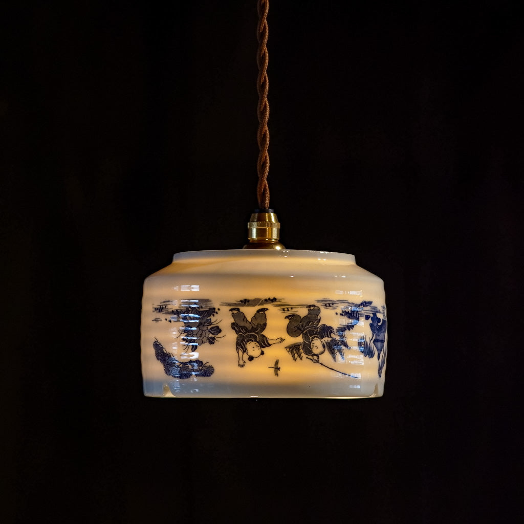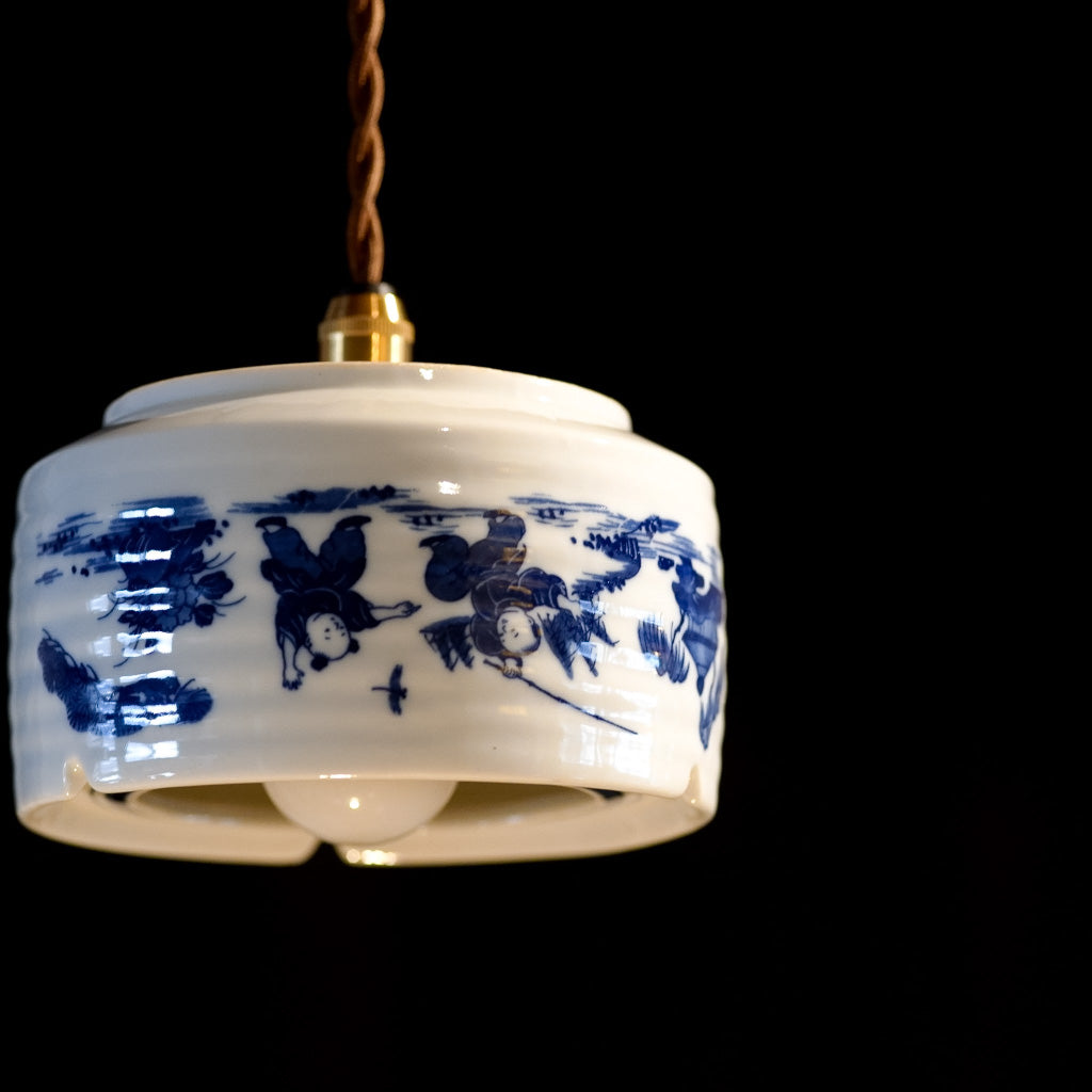 愛らしい唐子文様が描かれた白磁の灰皿を、ペンダントライトへとリメイク。