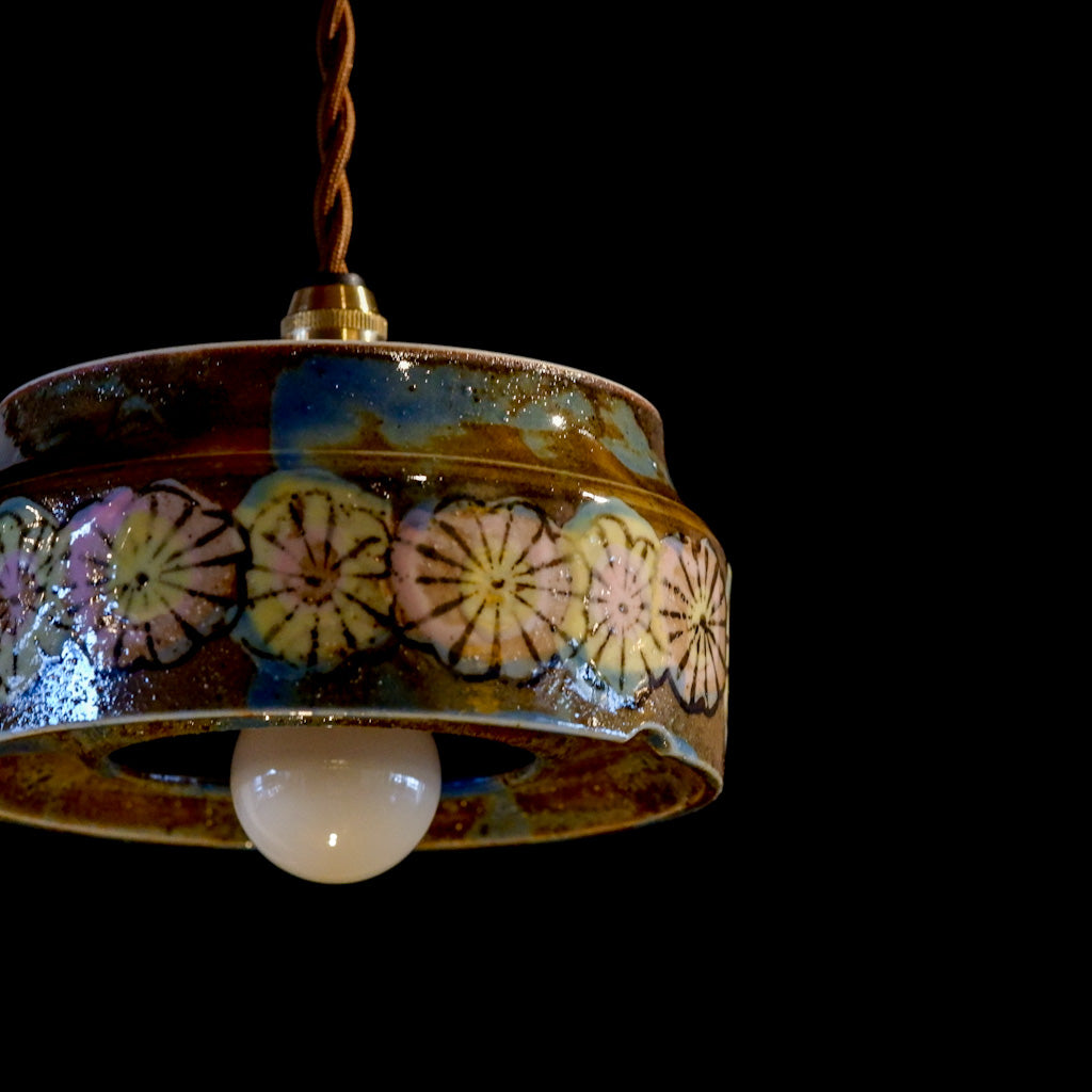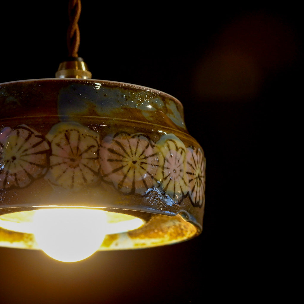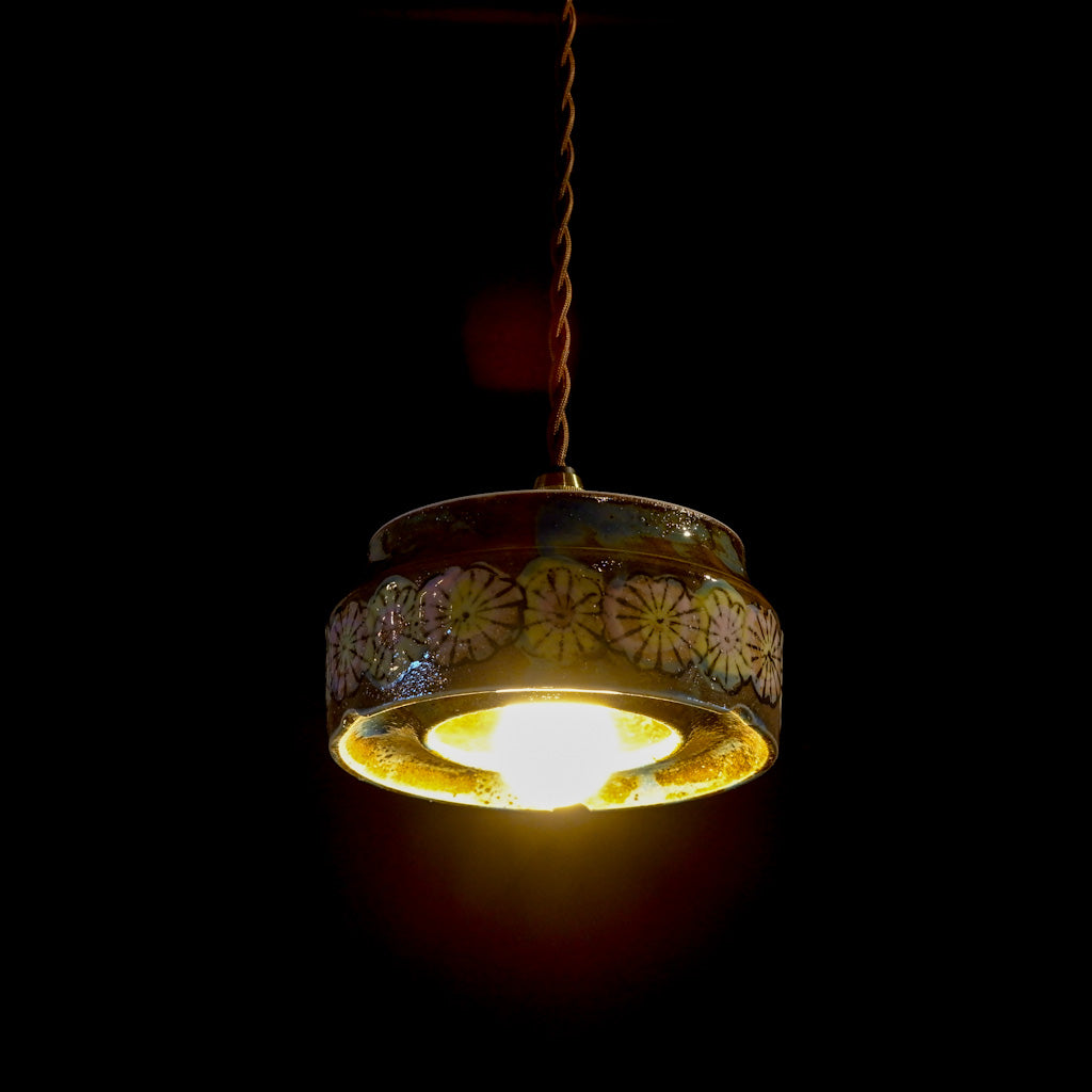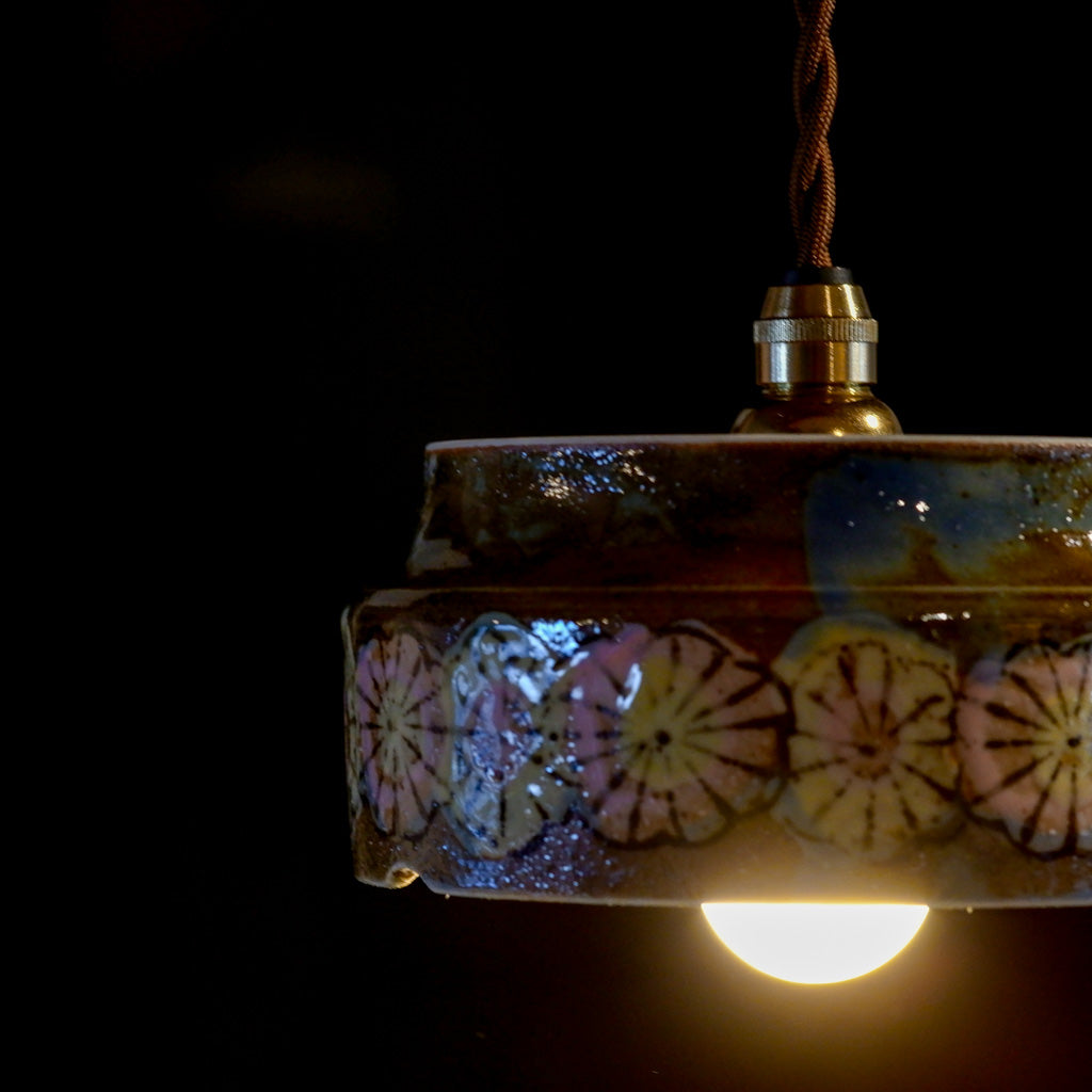 作地は未詳ながら、土味のある素朴な質感に花文様が巡る、小さな灰皿をペンダントライトへとリメイク。釉薬の揺らぎや焼成による表情が器全体に残り、どこか手仕事の温度を感じさせます。