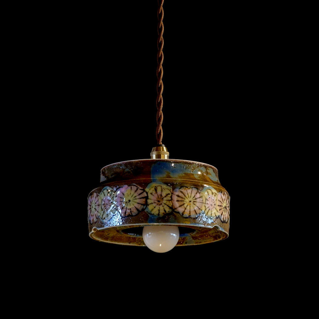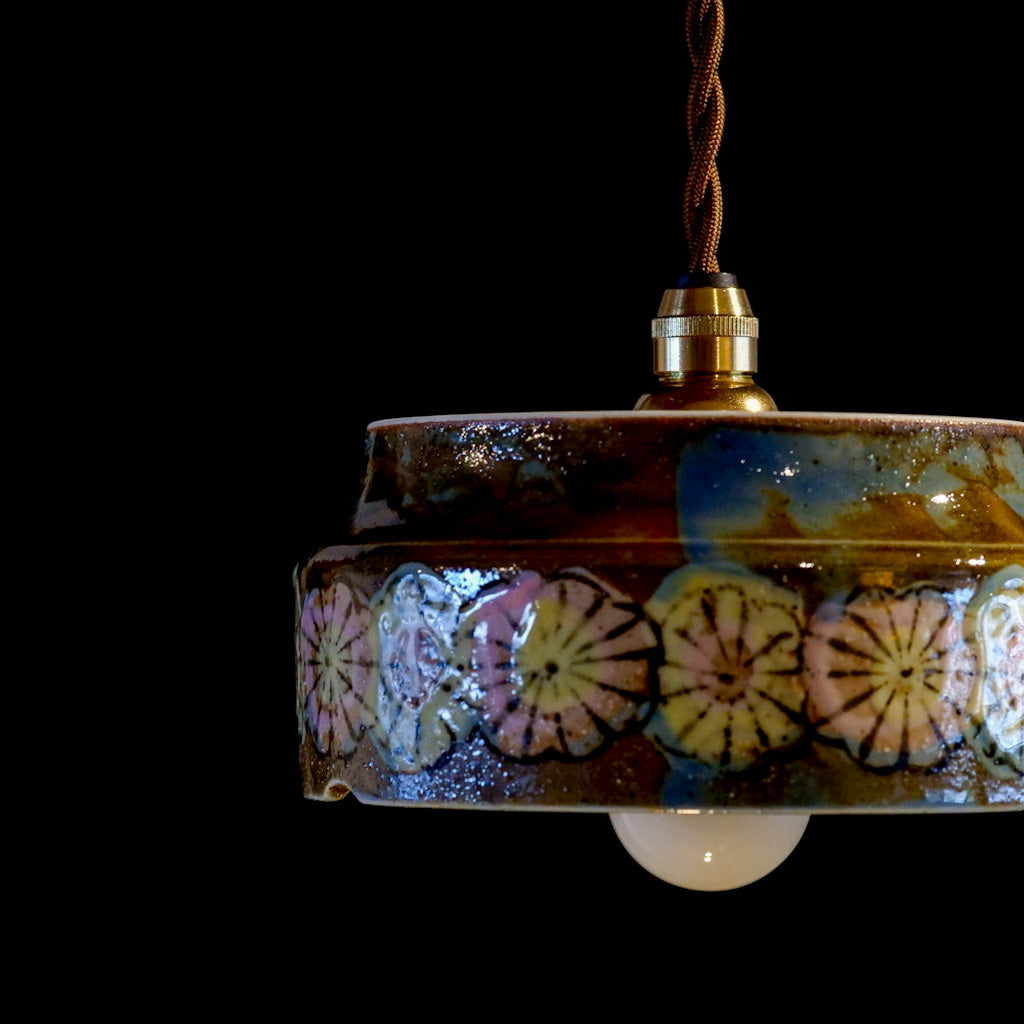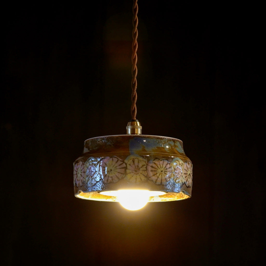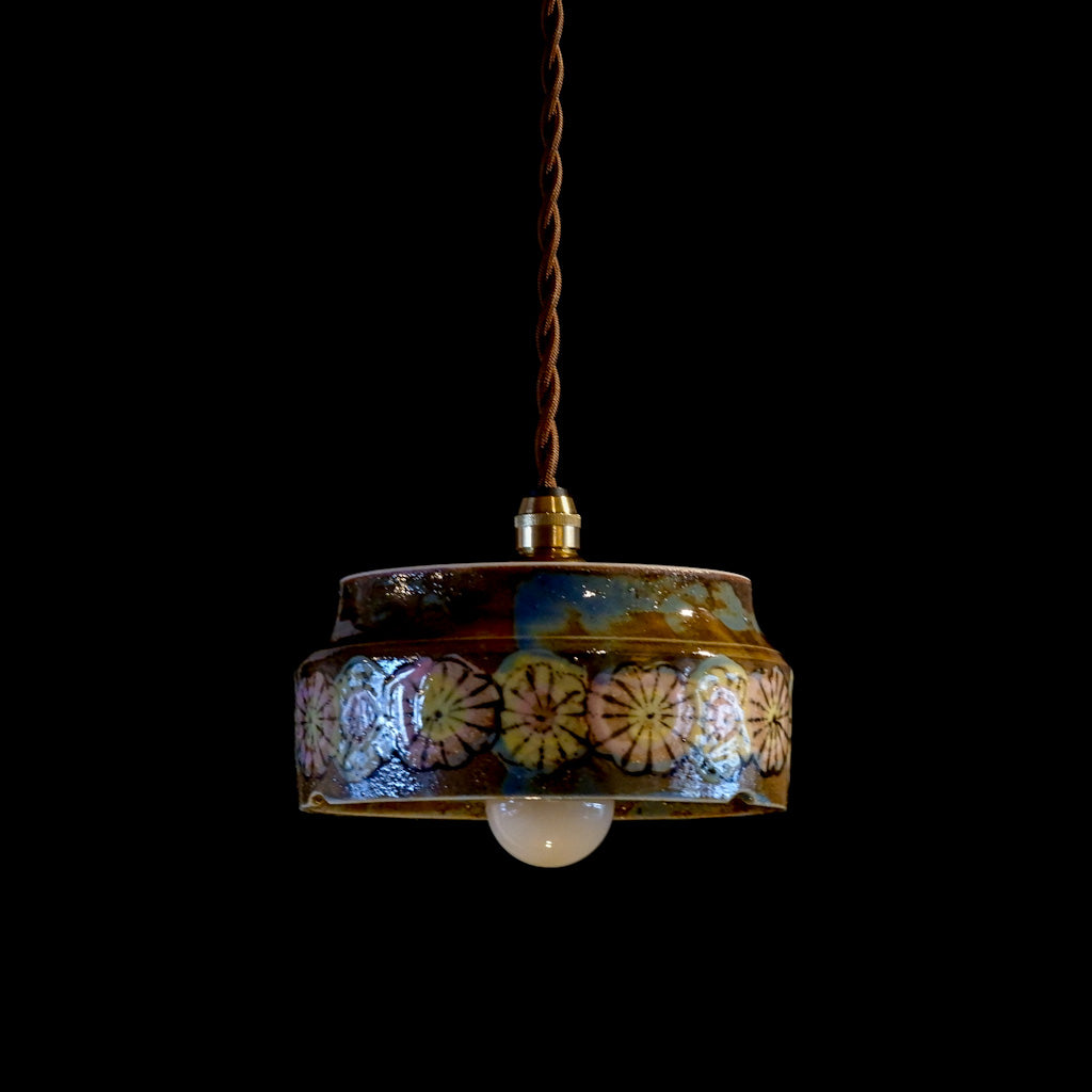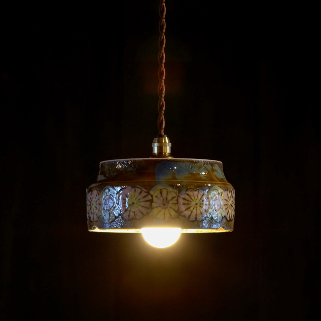 作地は未詳ながら、土味のある素朴な質感に花文様が巡る、小さな灰皿をペンダントライトへとリメイク。釉薬の揺らぎや焼成による表情が器全体に残り、どこか手仕事の温度を感じさせます。