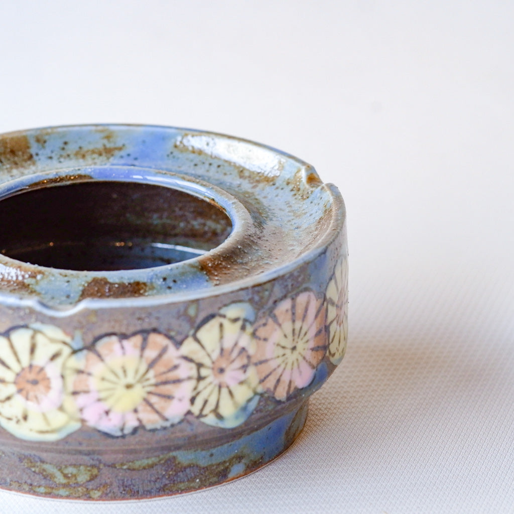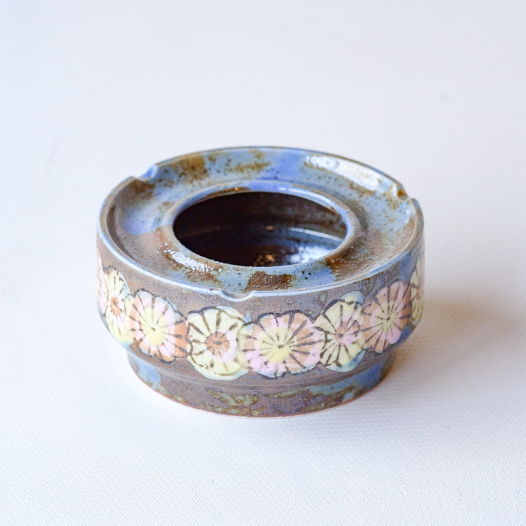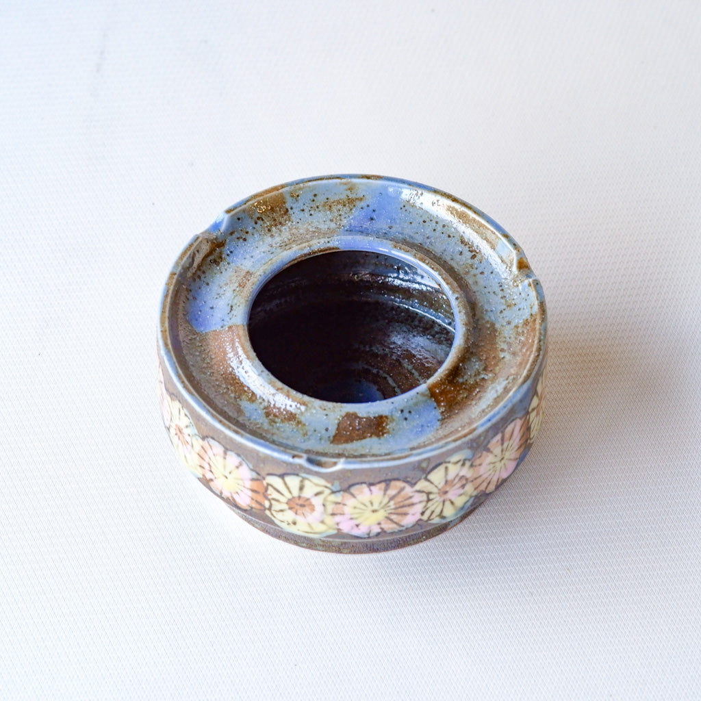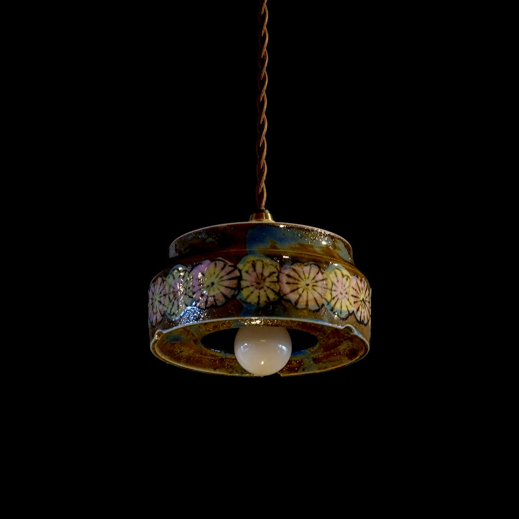 作地は未詳ながら、土味のある素朴な質感に花文様が巡る、小さな灰皿をペンダントライトへとリメイク。釉薬の揺らぎや焼成による表情が器全体に残り、どこか手仕事の温度を感じさせます。