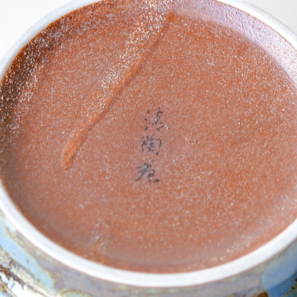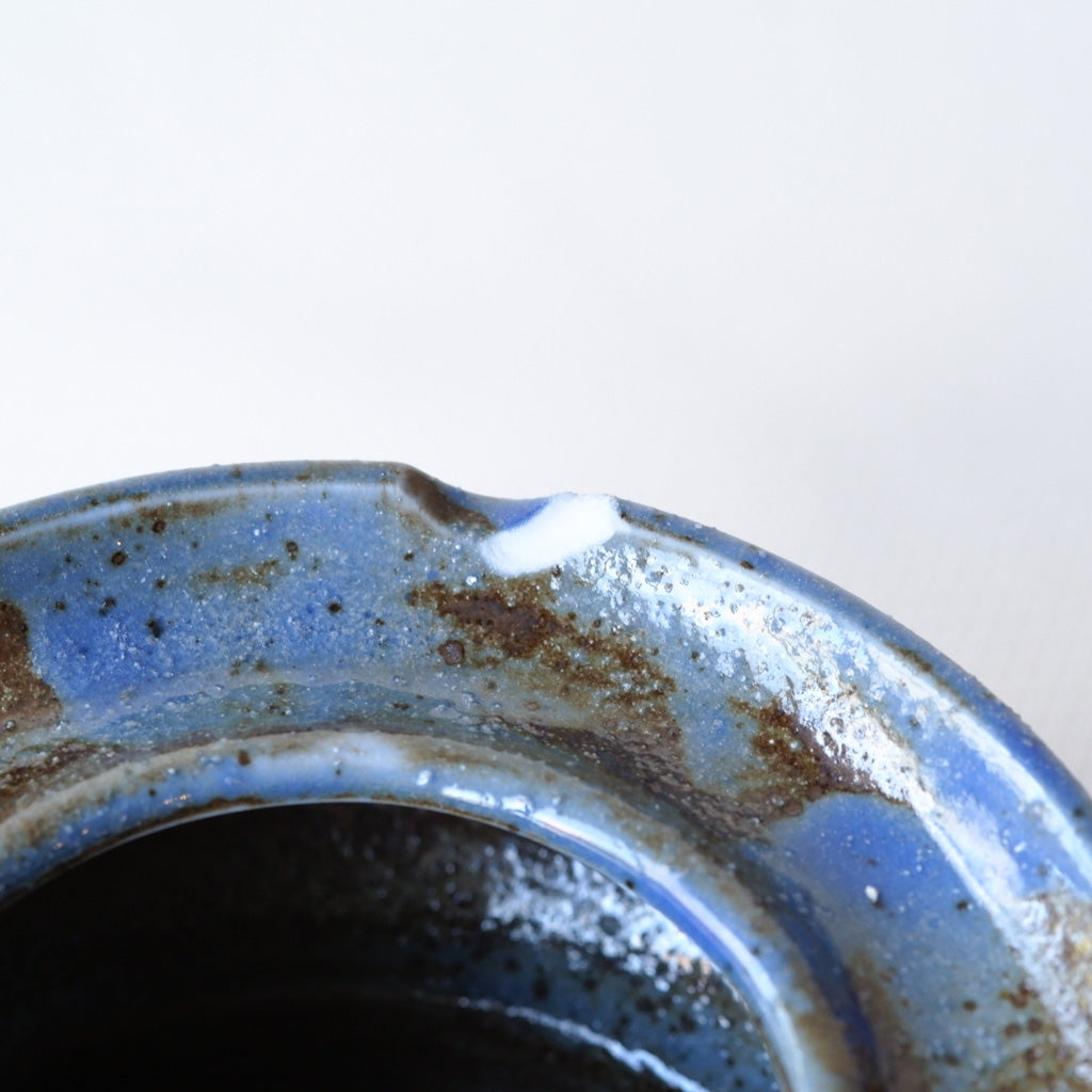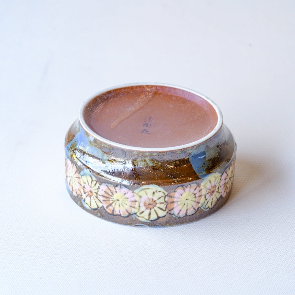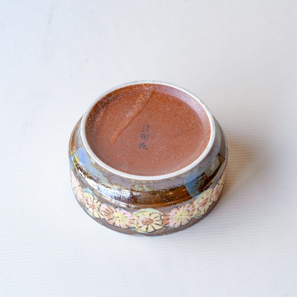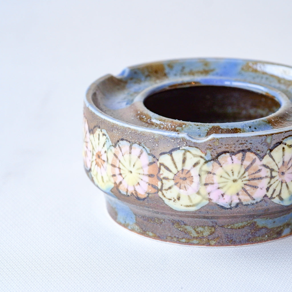 作地は未詳ながら、土味のある素朴な質感に花文様が巡る、小さな灰皿をペンダントライトへとリメイク。釉薬の揺らぎや焼成による表情が器全体に残り、どこか手仕事の温度を感じさせます。