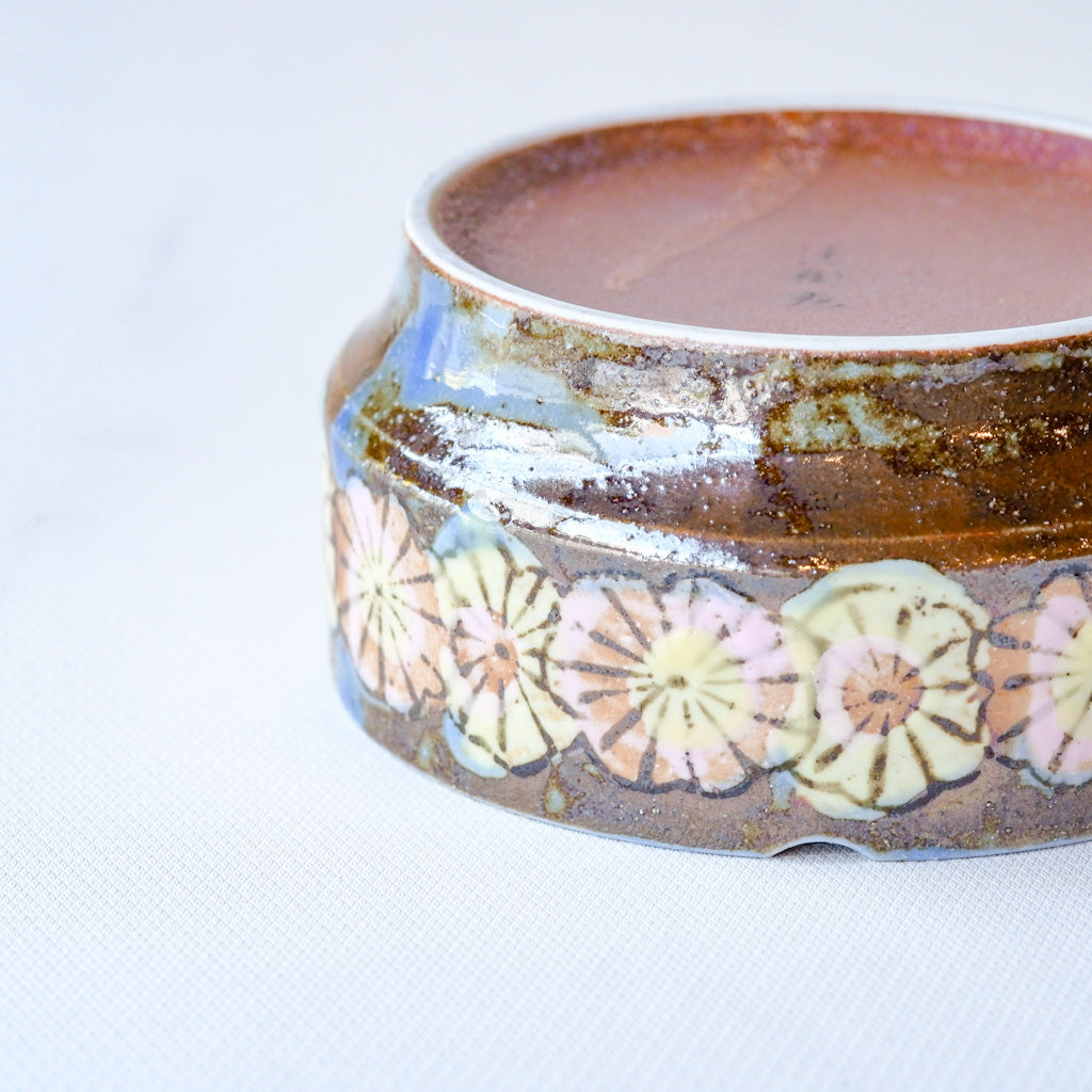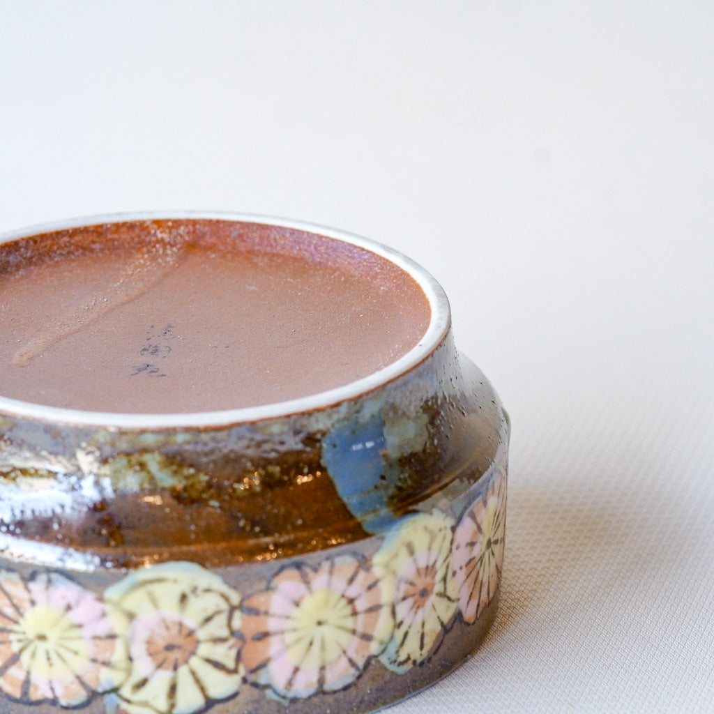 点灯すると、土の質感と花柄の陰影がより立体的に浮かび上がり、昼とは異なる深みのある表情に。静かな存在感で、空間に落ち着いた灯りを添える一点ものです。