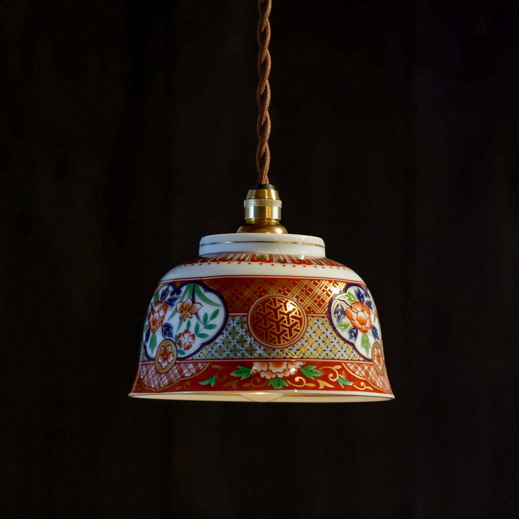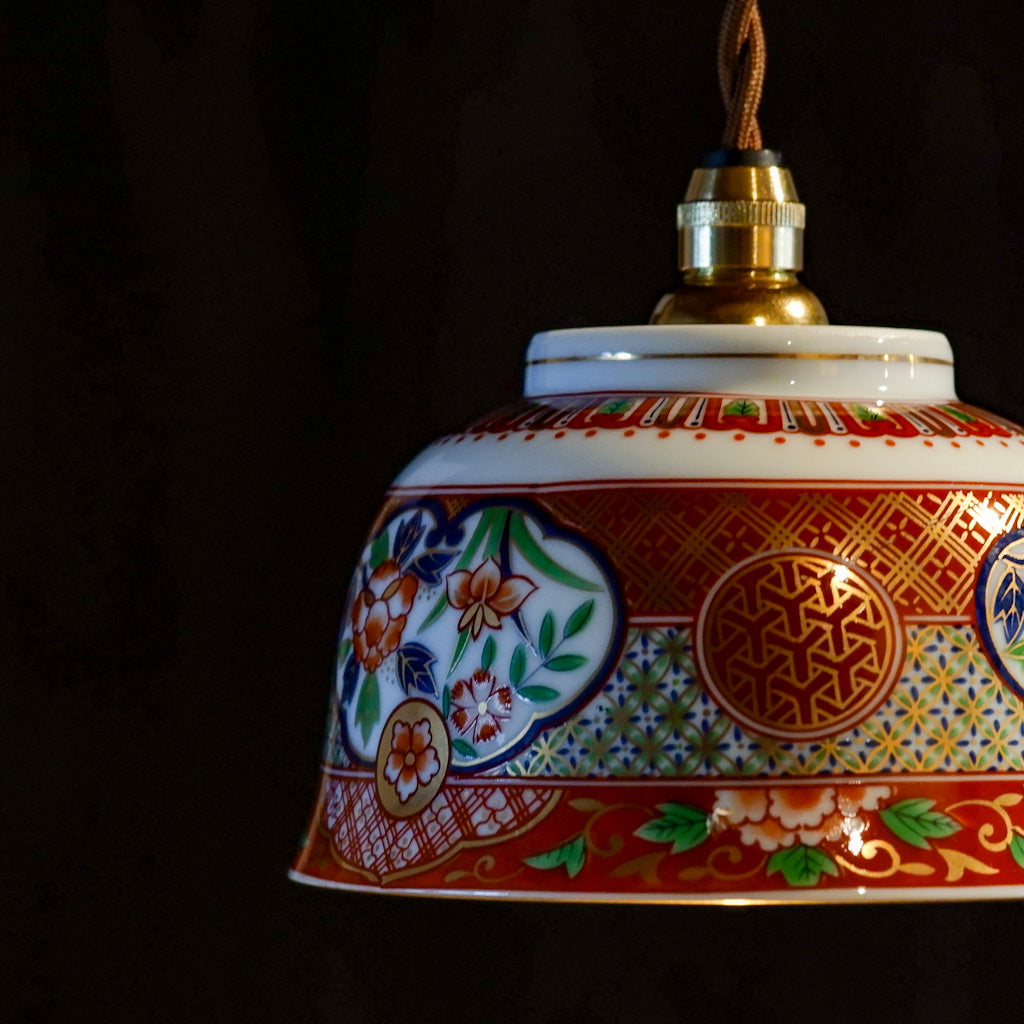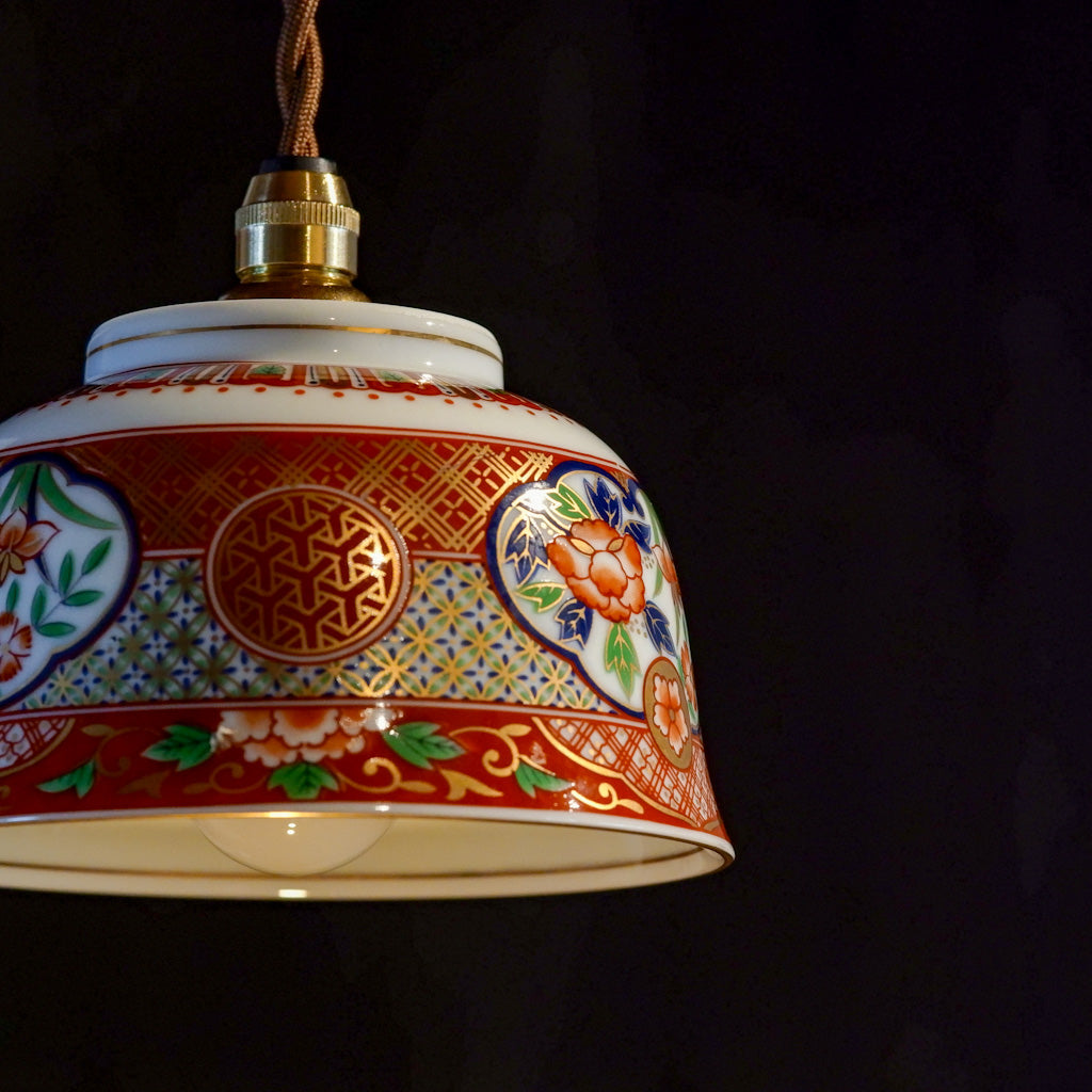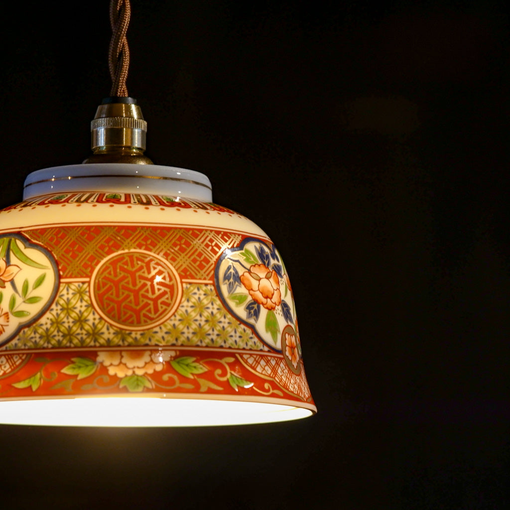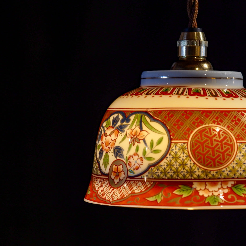 薄手の磁器ならではの光の透過性があり、点灯すると多彩な絵付けがやわらかく浮かび上がるのが特長。華やかな文様でありながら、光を通すことでどこか静けさも感じさせます。