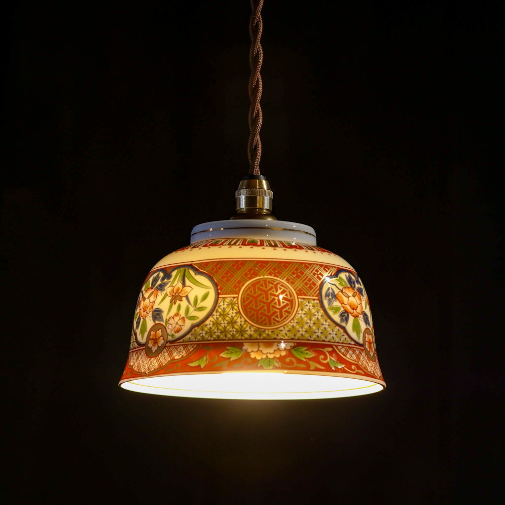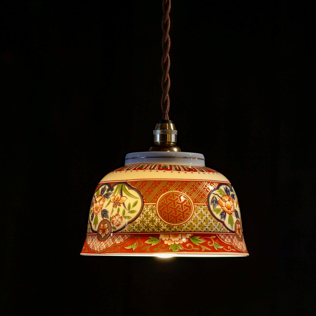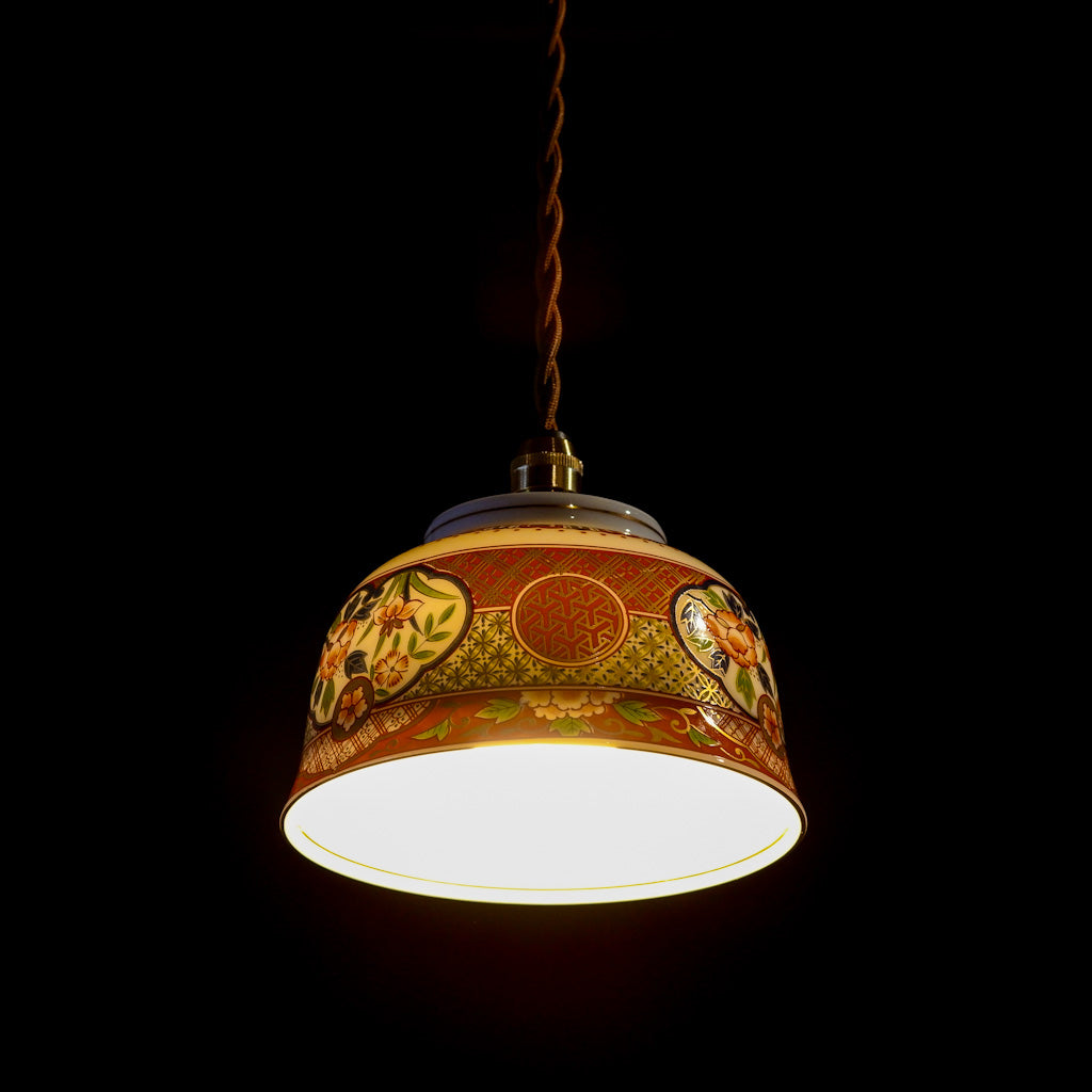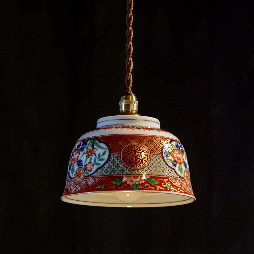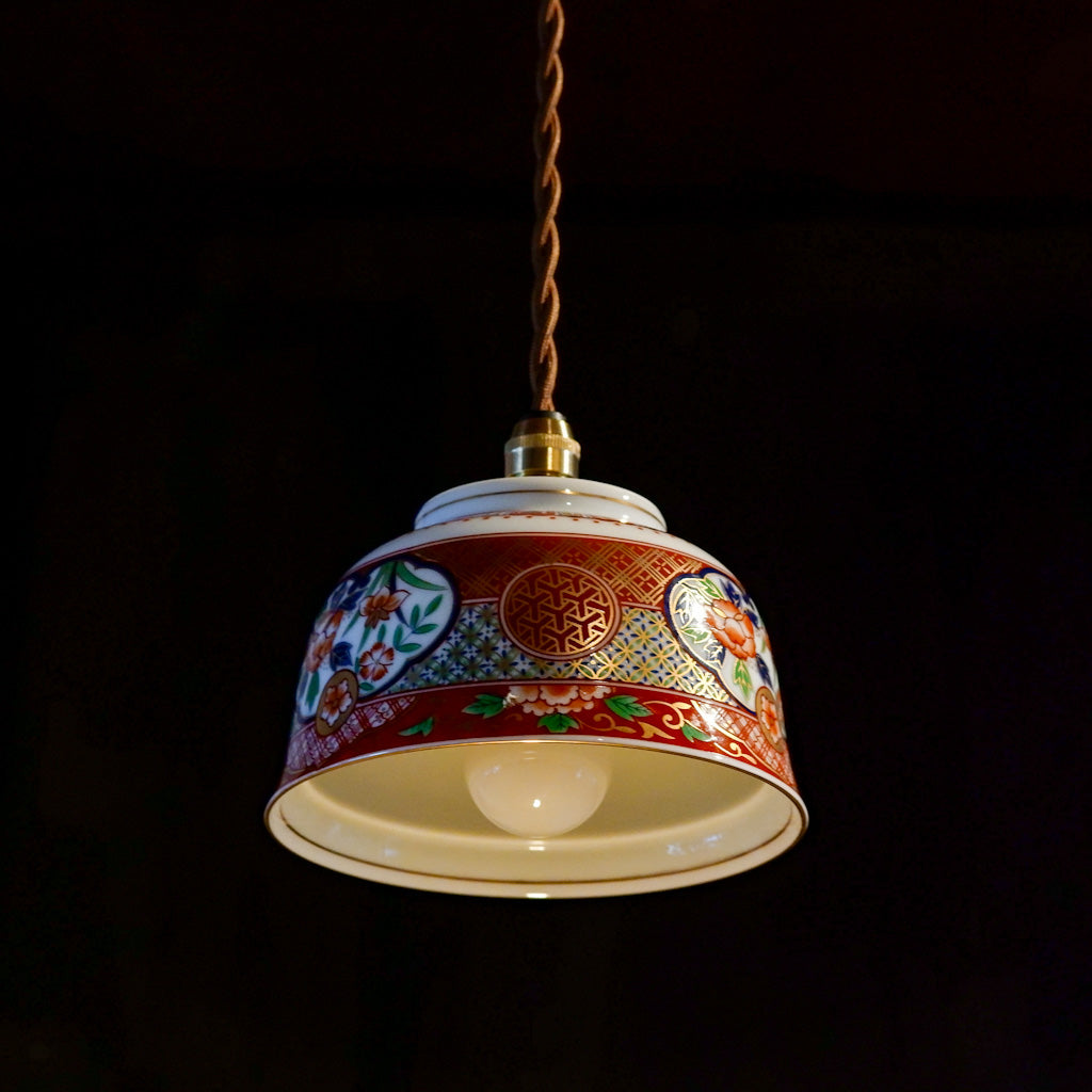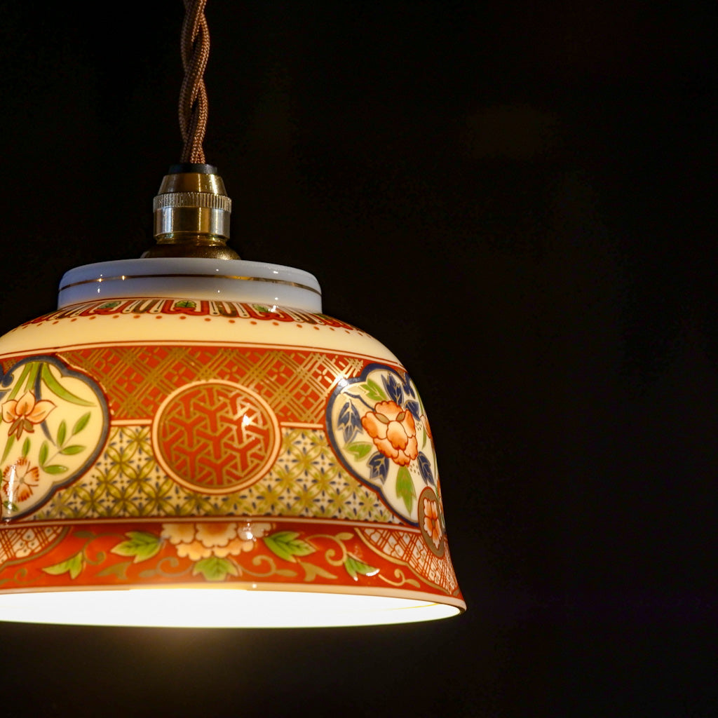 薄手の磁器ならではの光の透過性があり、点灯すると多彩な絵付けがやわらかく浮かび上がるのが特長。華やかな文様でありながら、光を通すことでどこか静けさも感じさせます。
