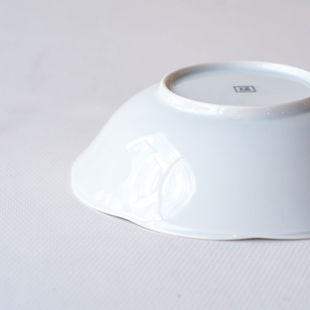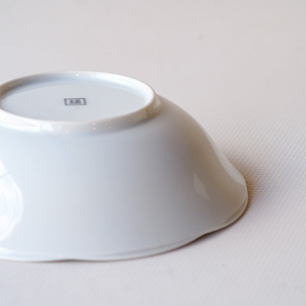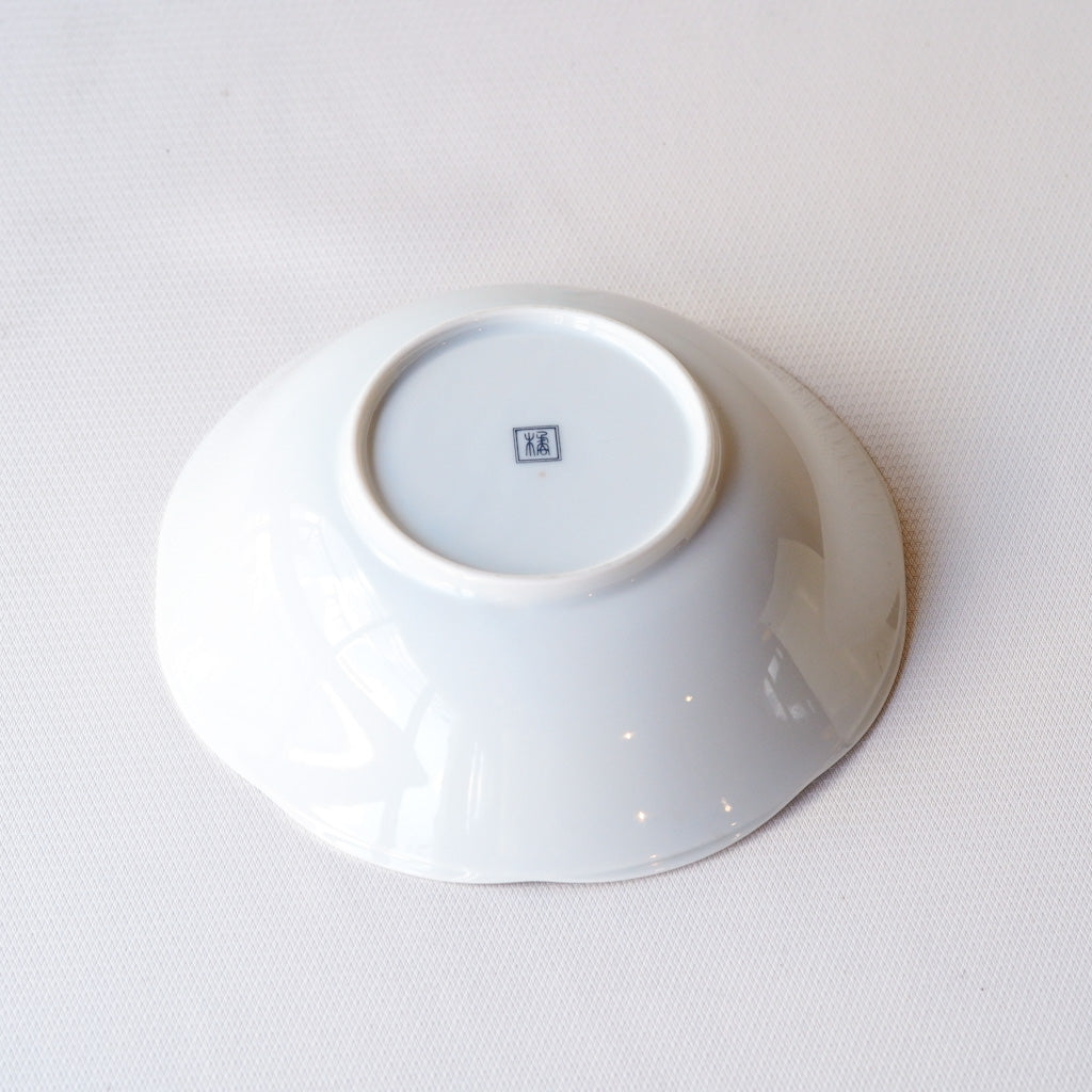 外側は白磁の静かな佇まいを保ち、内側にのみ赤絵と草模様が施された器です。